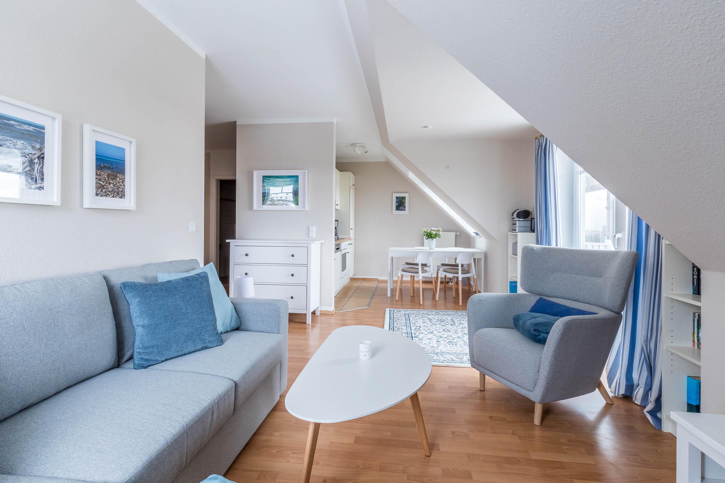 Diese geschmackvoll eingerichtete Wohnung begrüßt Sie in der unteren Wohnebene mit einem Wohnbereich mit maritimen Flair. So finden Sie Sie hier eine farblich abgestimmte Couchgarnitur mit SAT-TV auf der einen Seite des Raumes, während auf der anderen Seite eine sehr gut ausgestattete Wohnküche mit gemütlicher Essecke auf Sie wartet.
