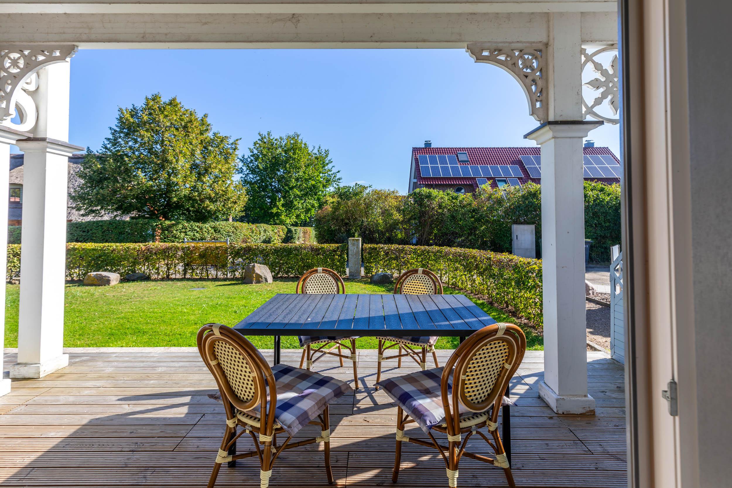 Die schöne möblierte Holz-Veranda (Richtung Ost) mit anschließendem von Hecke umrahmten Grundstück zur Ostsee. Hier können Sie das Meer schon riechen, hören, fühlen und manchmal auch sehen.