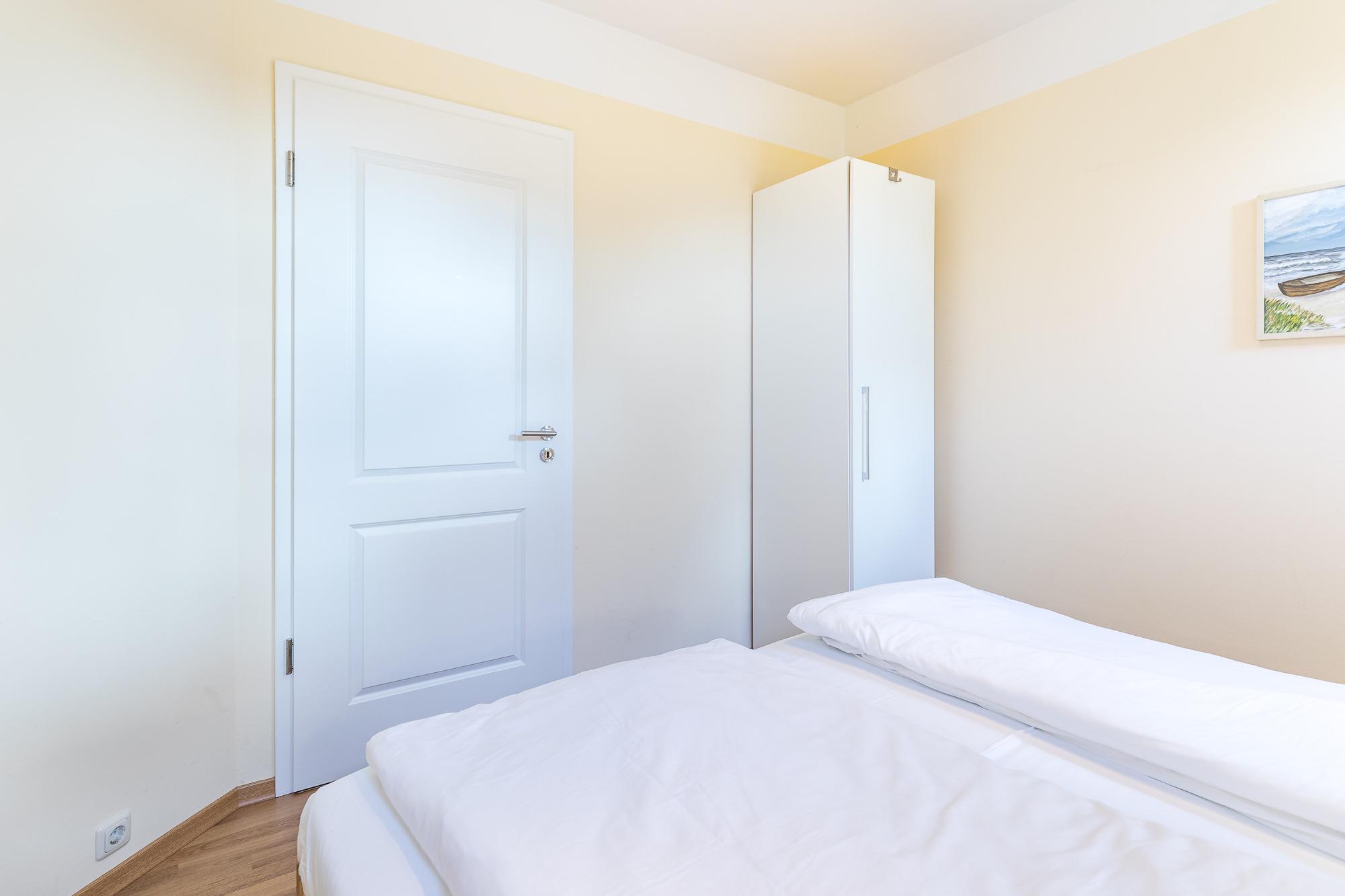 In zwei Schlafzimmern finden Sie jeweils ein Doppelbett vor. Im Gäste-/ Kinderzimmer ist ein sogenanntes Kojenbett ( Einzelbett mit ausziehbarem 2. Bett) eingerichtet. In allen dieser 3 Zimmer finden Sie auch einen Kleiderschrank für Ihre Garderobe.