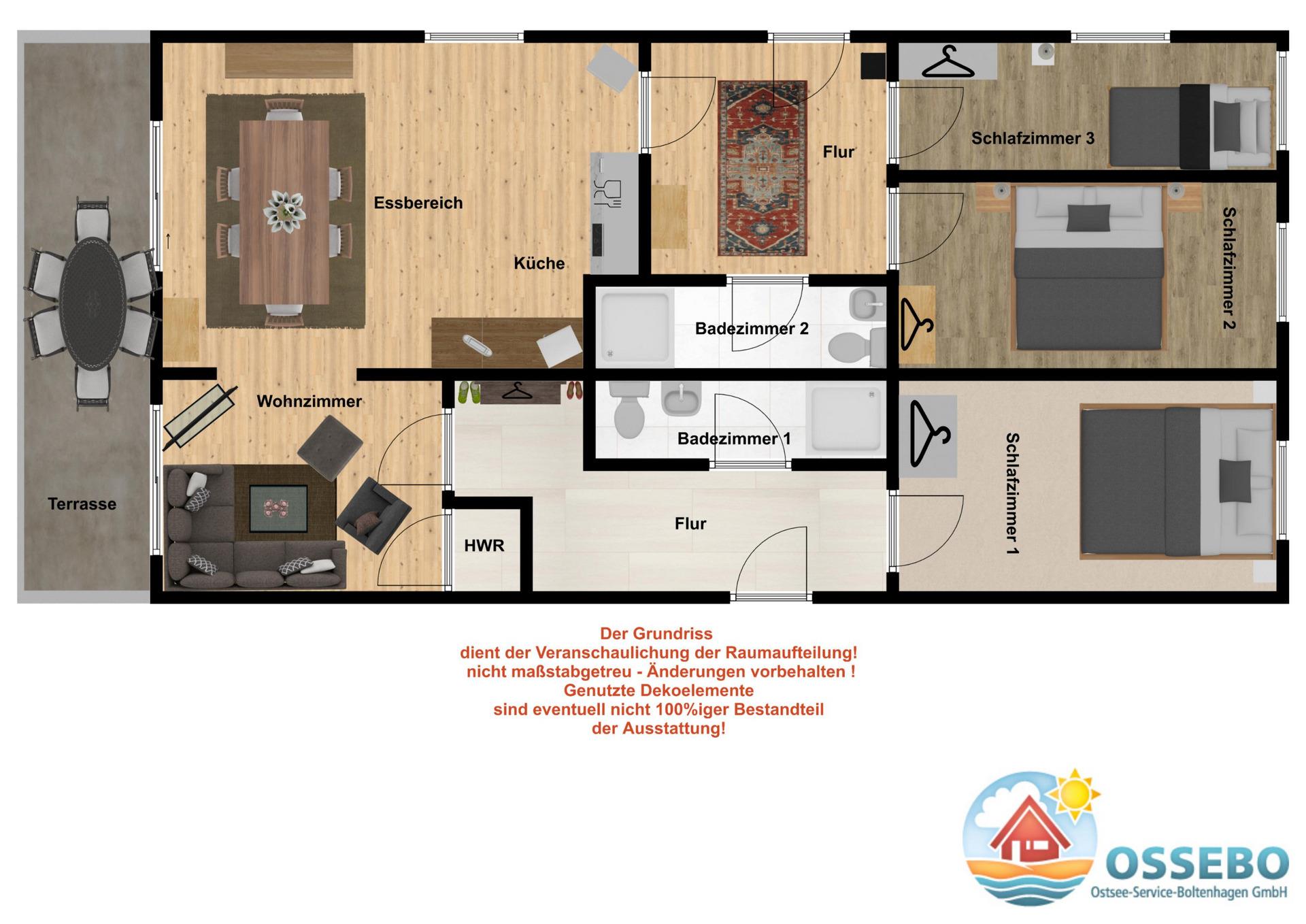 Die strandnahe 4-Zimmer-Ferienwohnung bietet auf rund 100qm Wohnfläche im Erdgeschoss eine komfortable Ausstattung für 6 Personen + Kleinkind.