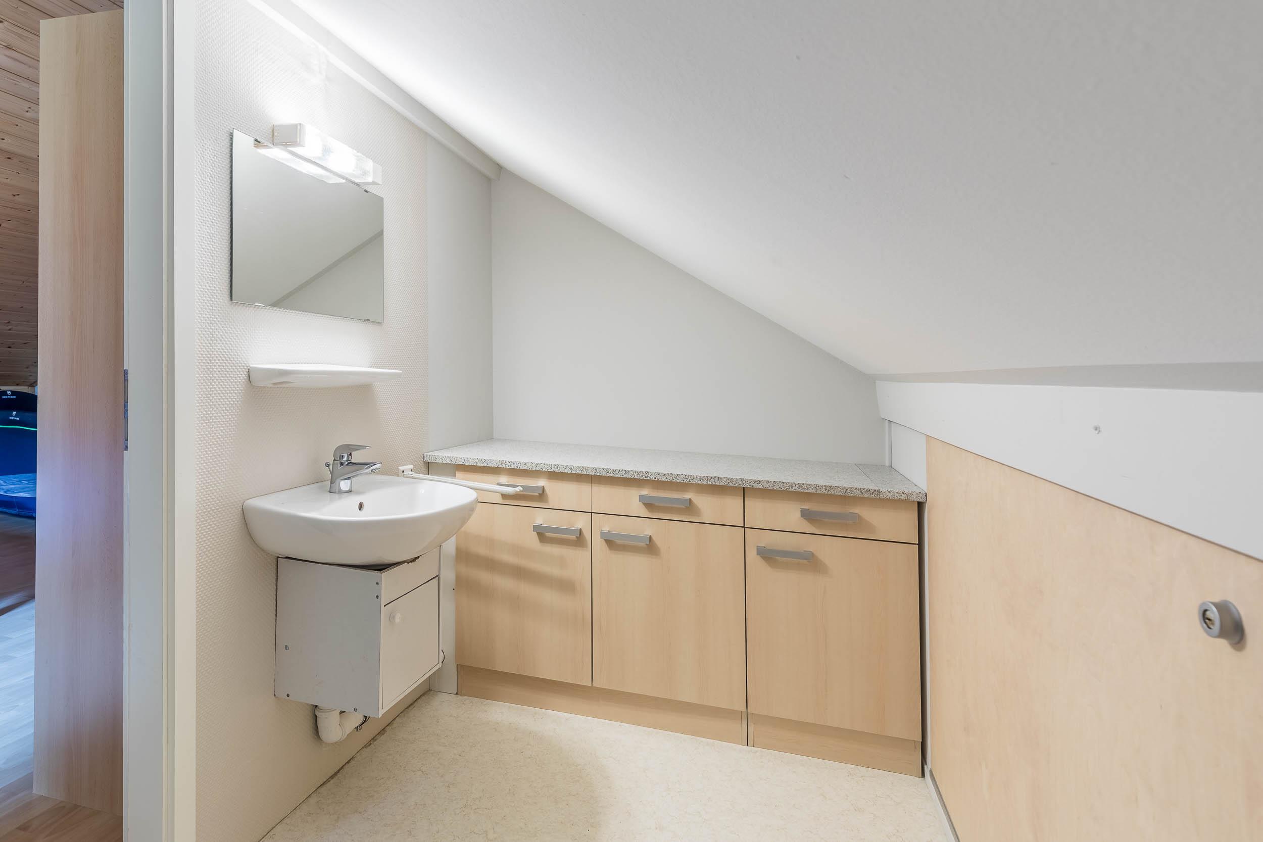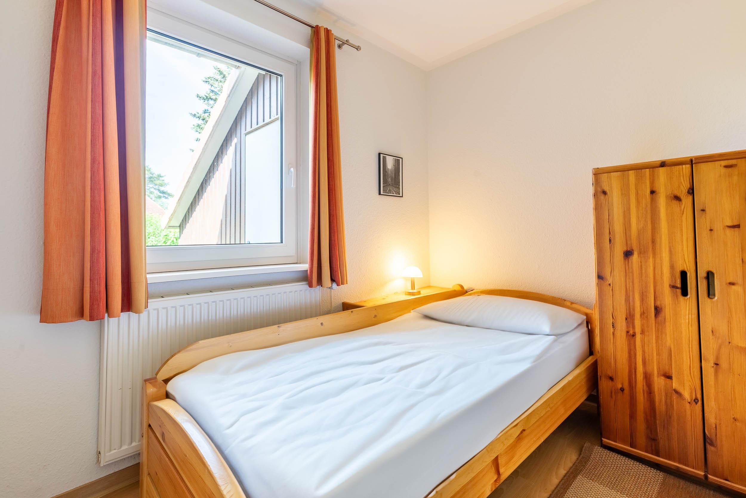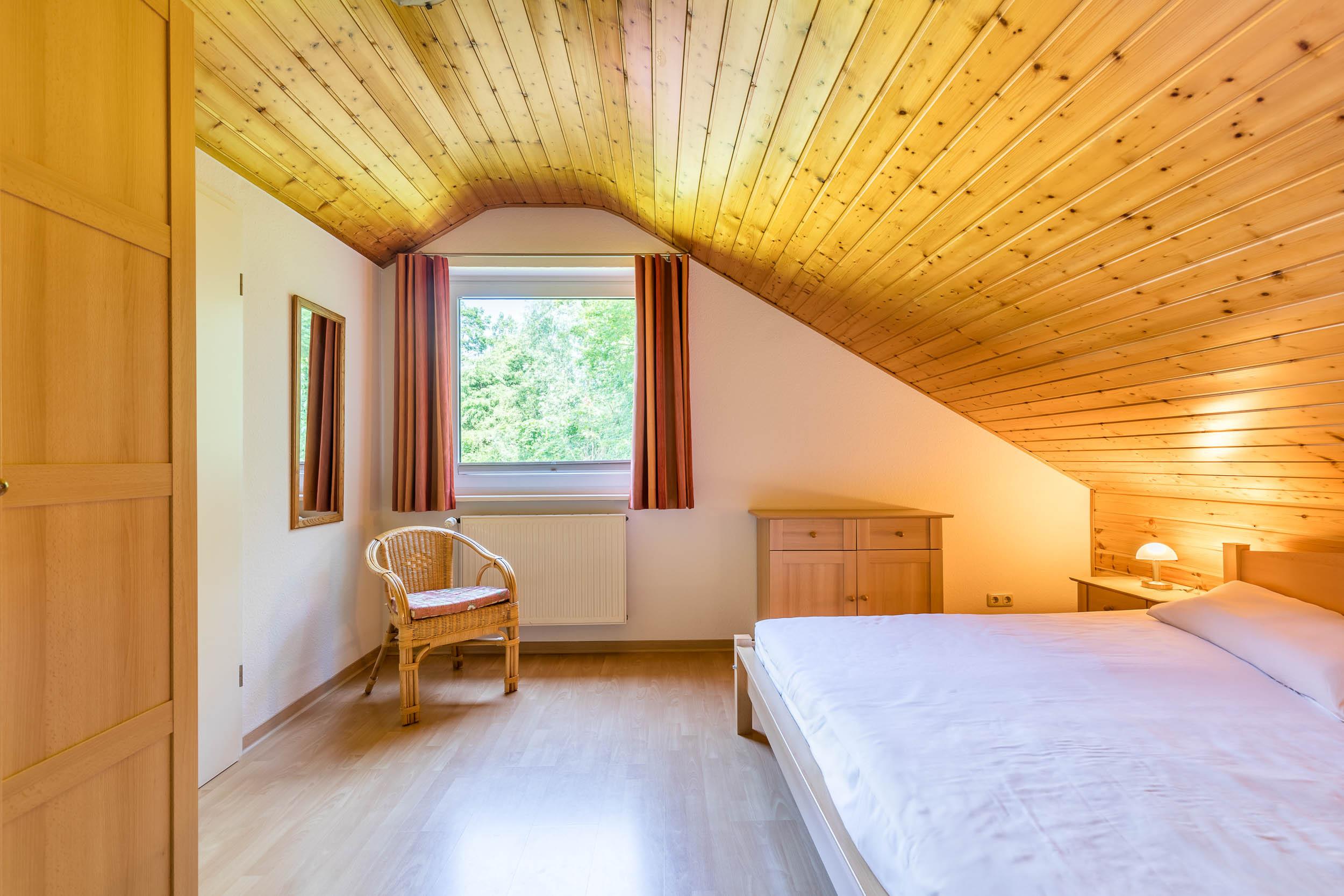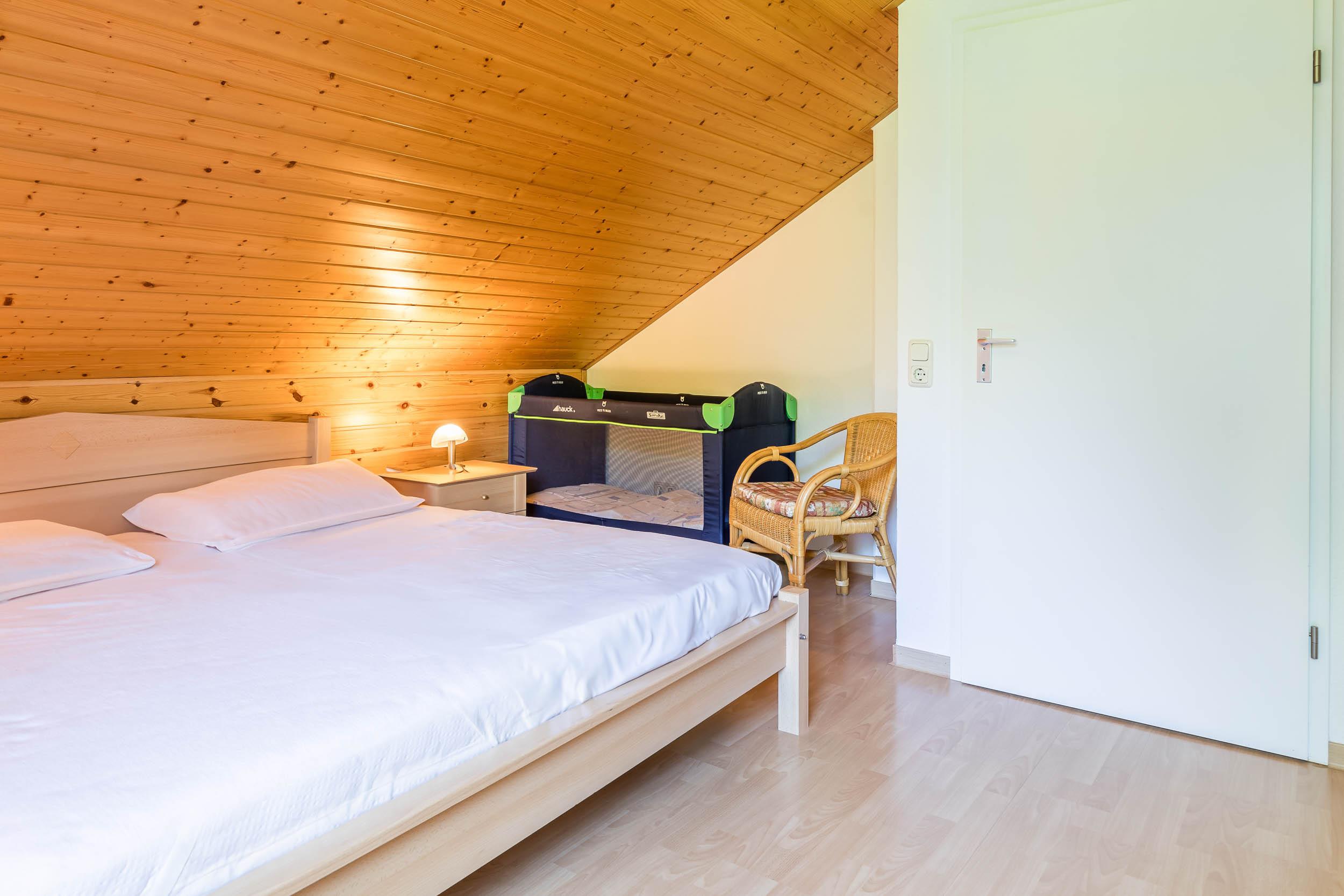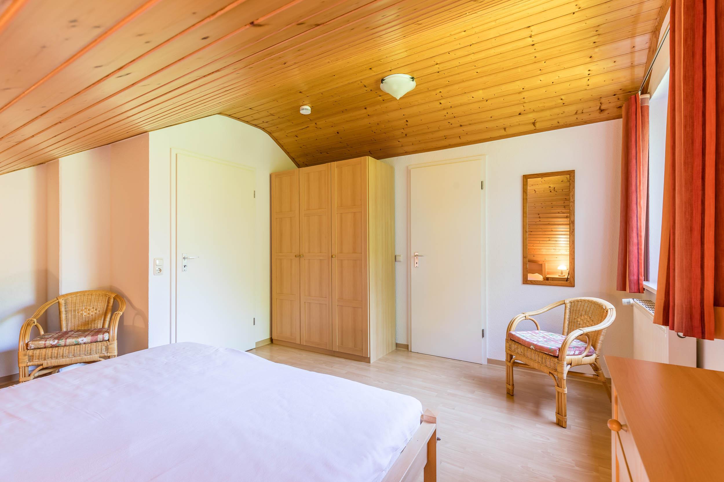 Im Dachgeschoss befindet sich das Schlafzimmer, welches mit einem gemütlichen Doppelbett, Kleiderschrank und Kommode ausgestattet ist.