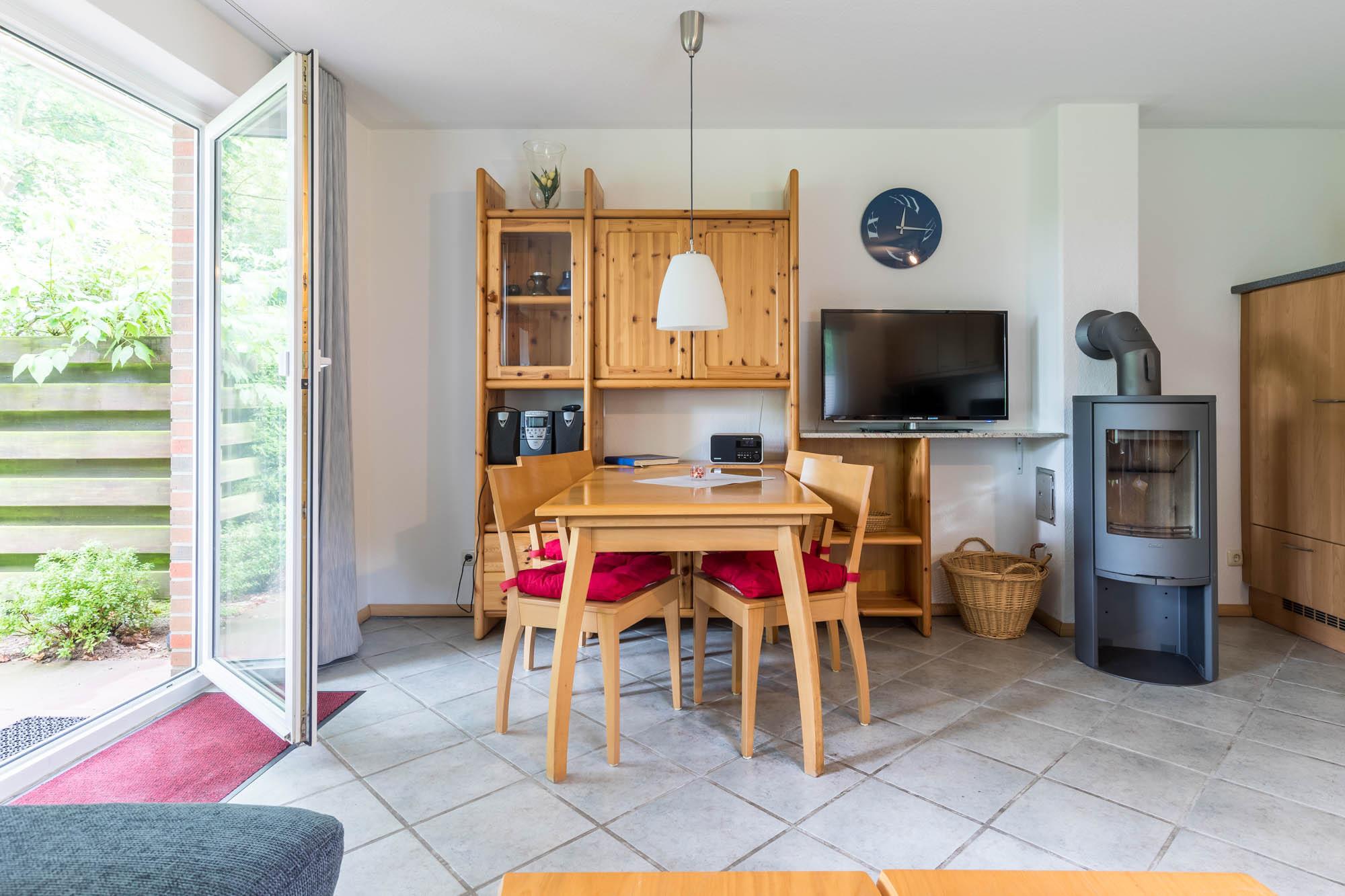 Der Wohn- und Essbereich im Erdgeschoss ist offen miteinander verbunden und grenzt an die gut sortierte Küchenzeile. Für behagliche Stimmung an kalten Tagen sorgt ein Kamin.