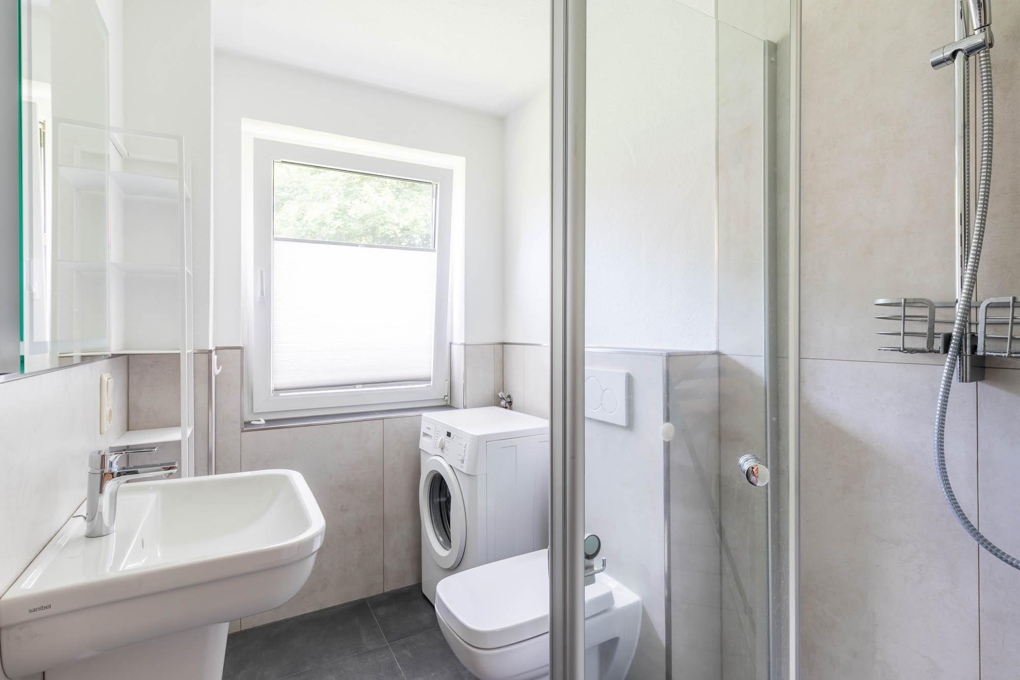 Das Badezimmer im Erdgeschoss beinhaltet neben einer ebenerdigen Dusche und WC auch eine Waschmaschine. Eine große Handtuchheizung sorgt zusätzlich für wohlige Wärme. Das Fenster spendet angenehmes Tageslicht und hilft beim Lüften nach dem Duschen.