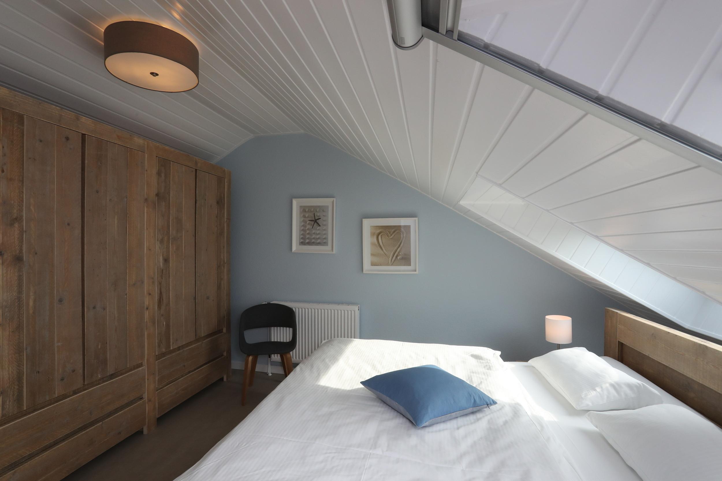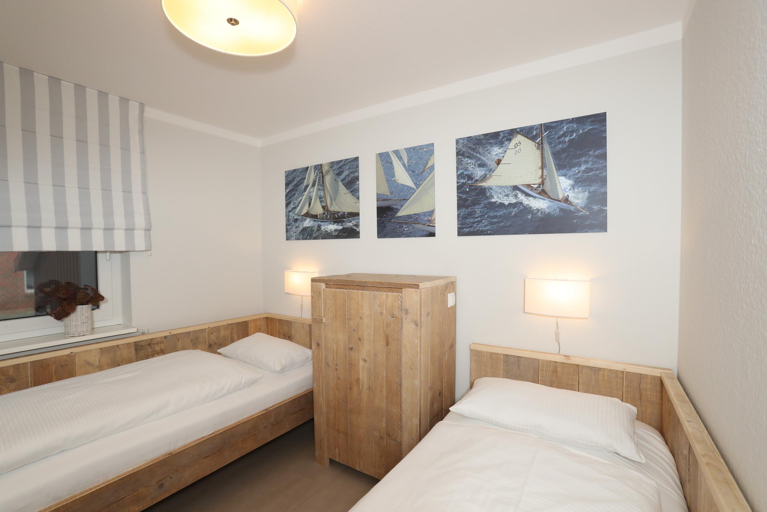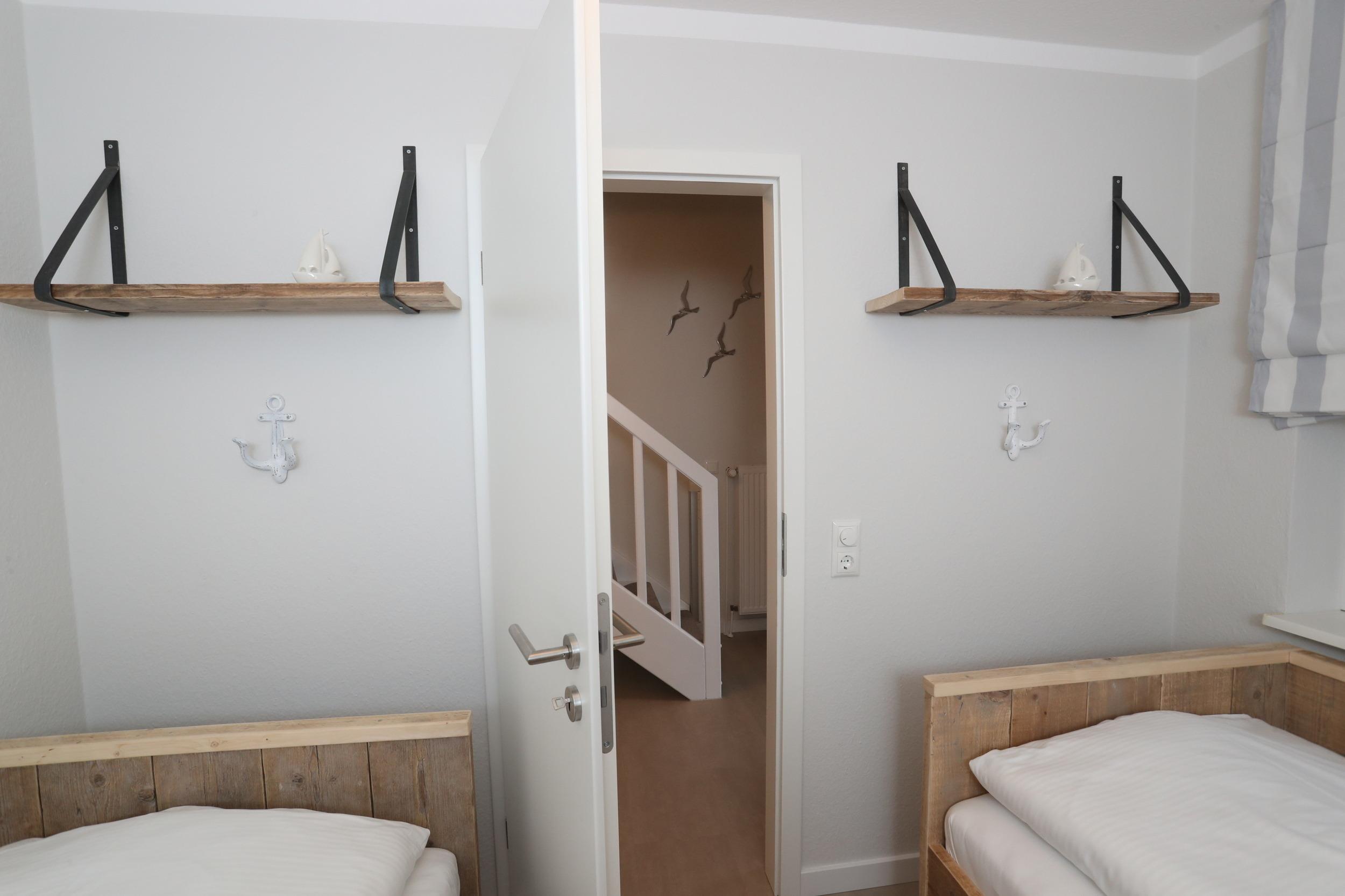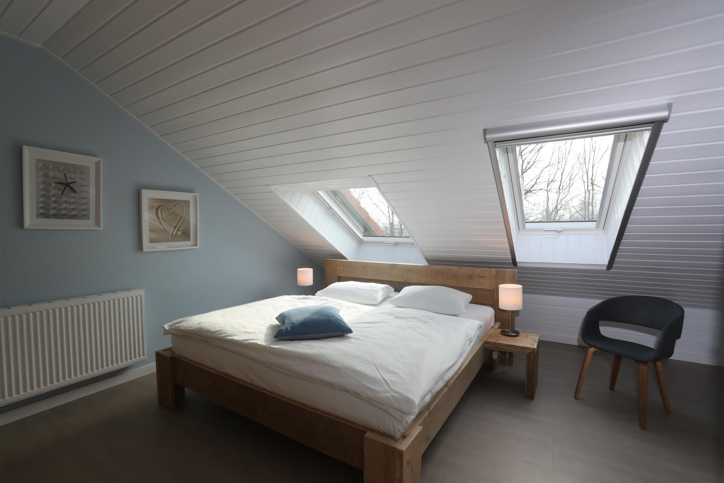 Das Haus bietet zwei separate Schlafzimmer. Insgesamt stehen ein Doppelbett (im 1.Obergeschoss/ DG) sowie 2 Einzelbetten (im Erdgeschoss) zur Verfügung. Kleiderschrank und Kommode können in diesen Räumen für die Urlaubsgarderobe genutzt werden. Im Schlafzimmer mit dem Doppelbett ist zudem ein weiterer Flatscreen-TV aufgestellt.