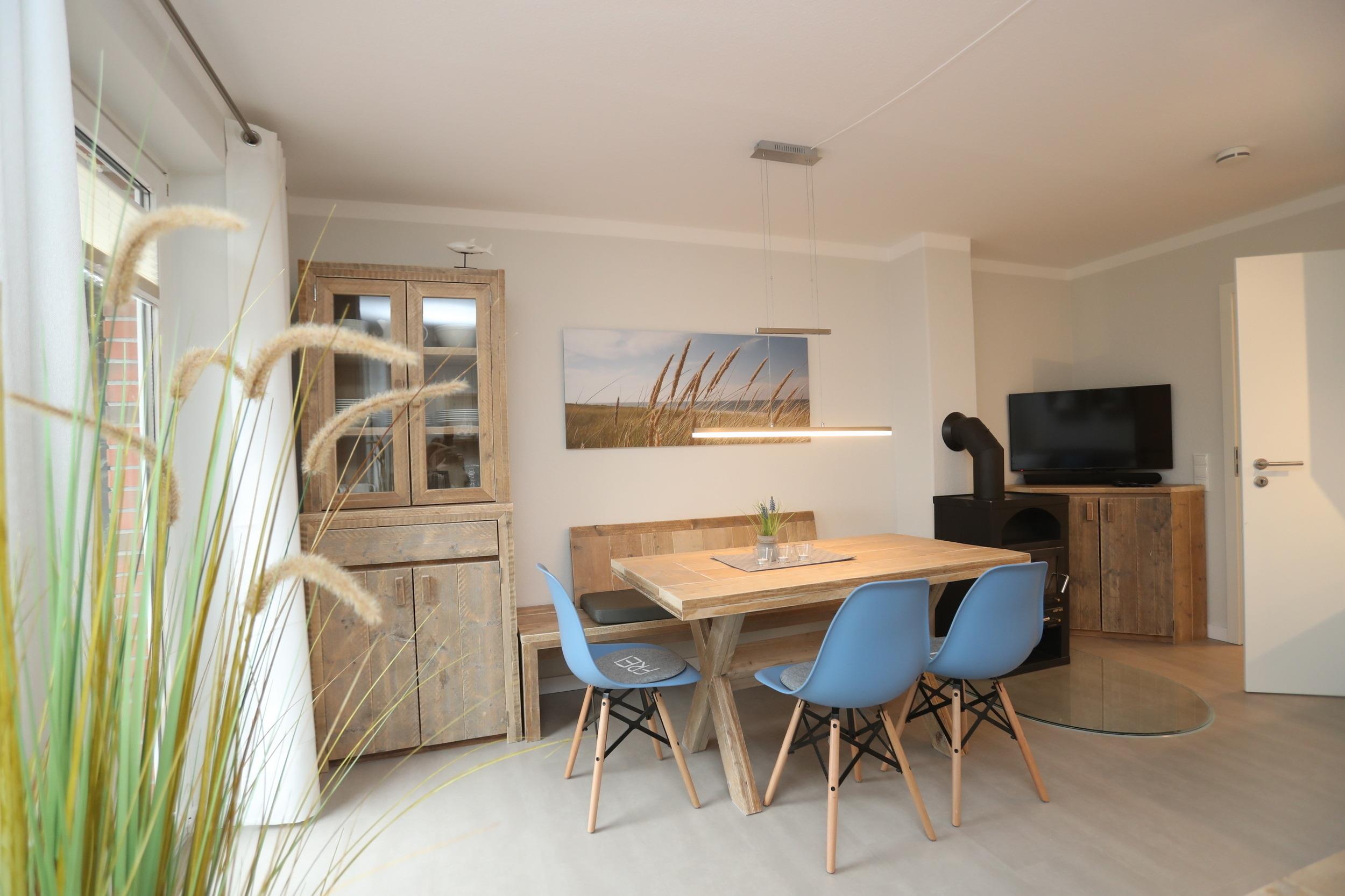 Im gemütlichen Wohnbereich im Erdgeschoss finden Sie ein Sofa, eine Essecke, einen Flatscreen-Fernseher sowie einen zum Wohlfühlen einladenden Kamin.