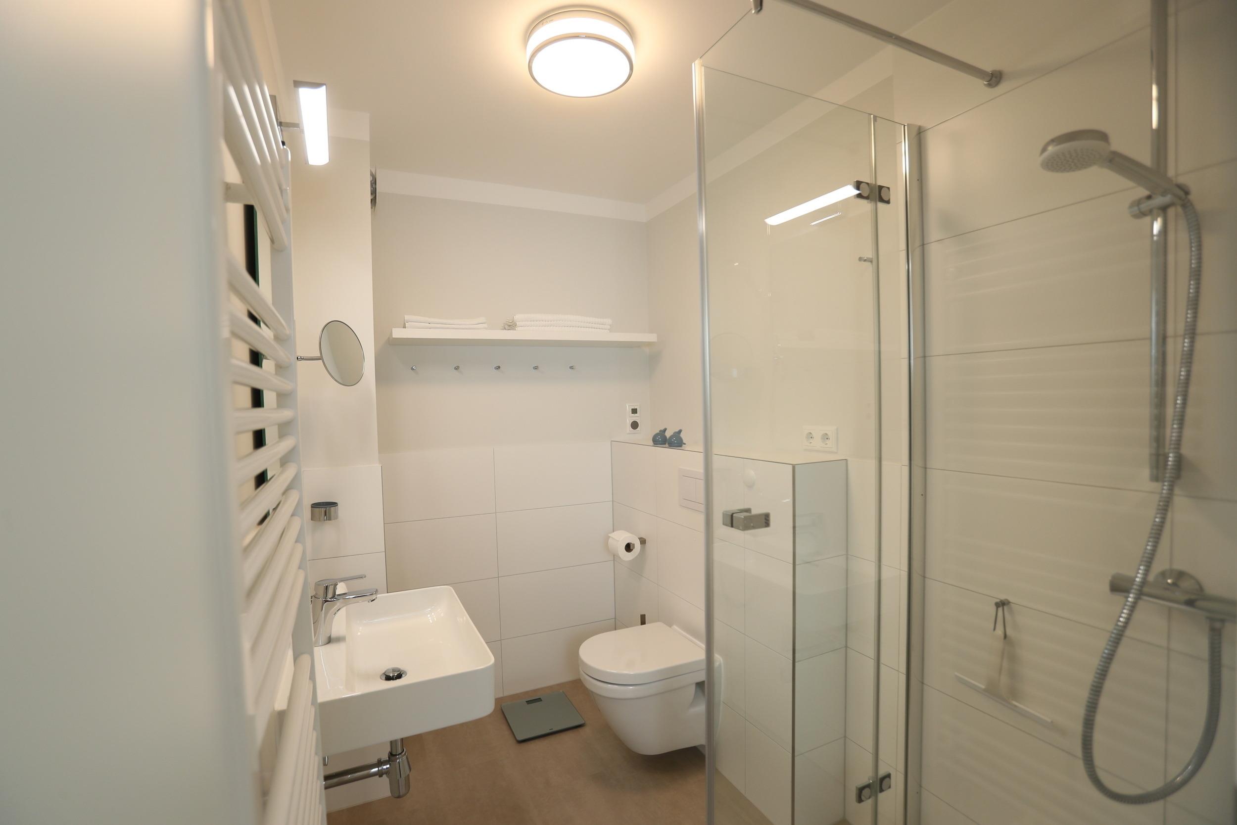 Auch das moderne Duschbad mit WC [&] Handtuchtrockner befindet sich im Erdgeschoss.