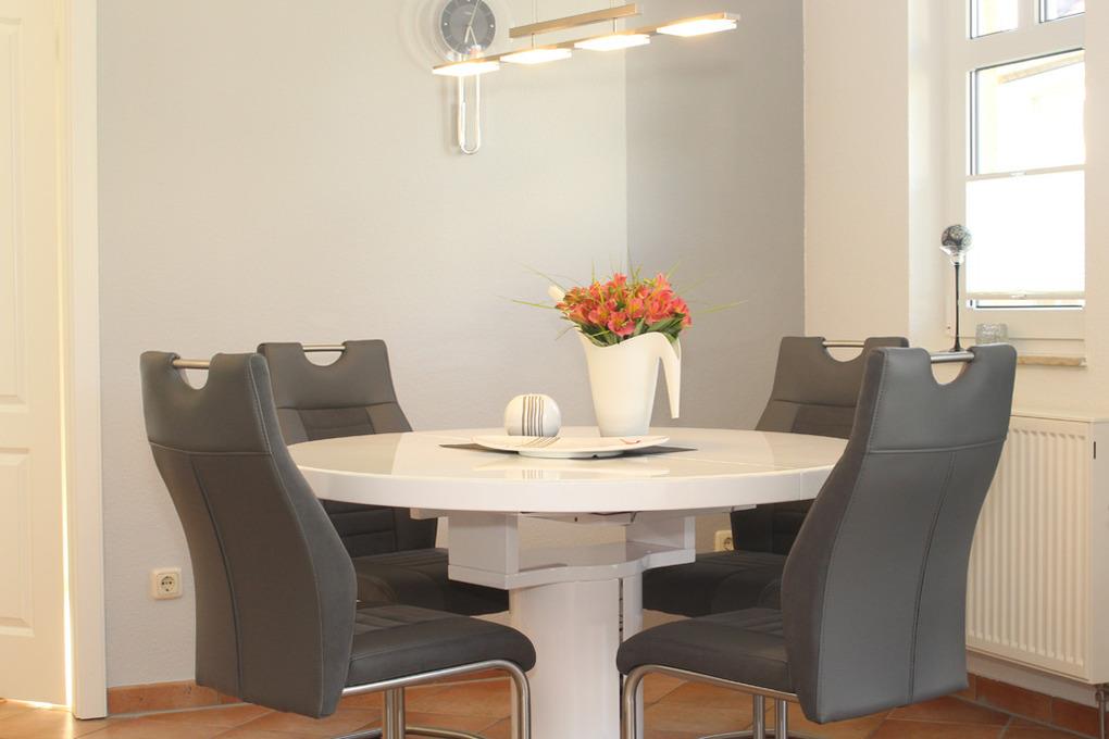 Der großzügige und kombinierte Wohn- und Essbereich mit angrenzender separater voll ausgestatteter Küche ist der Mittelpunkt bzw. Wohlfühloase der Wohnung. Das bequeme Sofa lässt sich ausziehen und bietet somit eine weitere Schlafmöglichkeit für 2 Personen (Liegefläche ausgeklappt 160x200cm). Zur Unterhaltung dienen Ihnen hier SAT-TV, BlueRay-Player sowie eine Musikanlage. Auch ein Reisebettchen könnte im Wohnbereich bei Bedarf noch aufgestellt werden. An der separaten Essecke finden alle gemeinsam Platz.