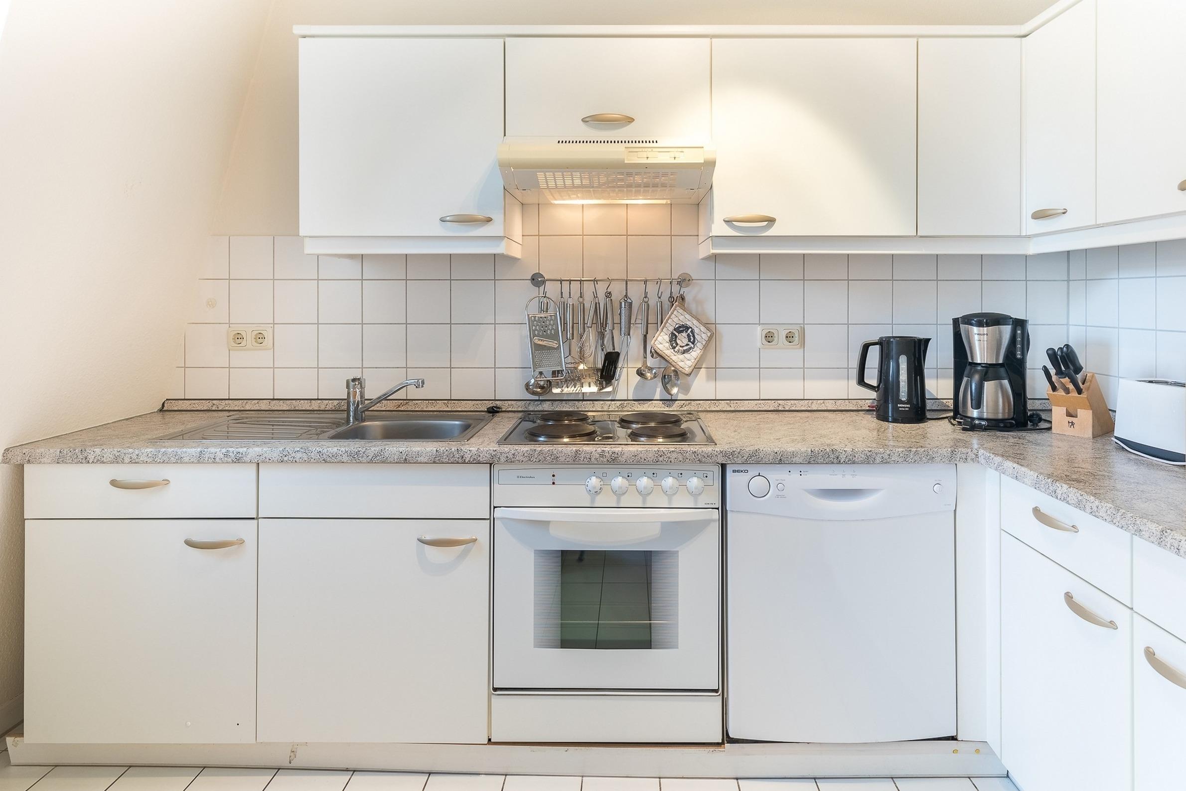 In der halboffenen Küche helfen hochwertige Geräte bei der Zubereitung der Mahlzeiten, die gemütlich an der separaten Essecke eingenommen werden können.