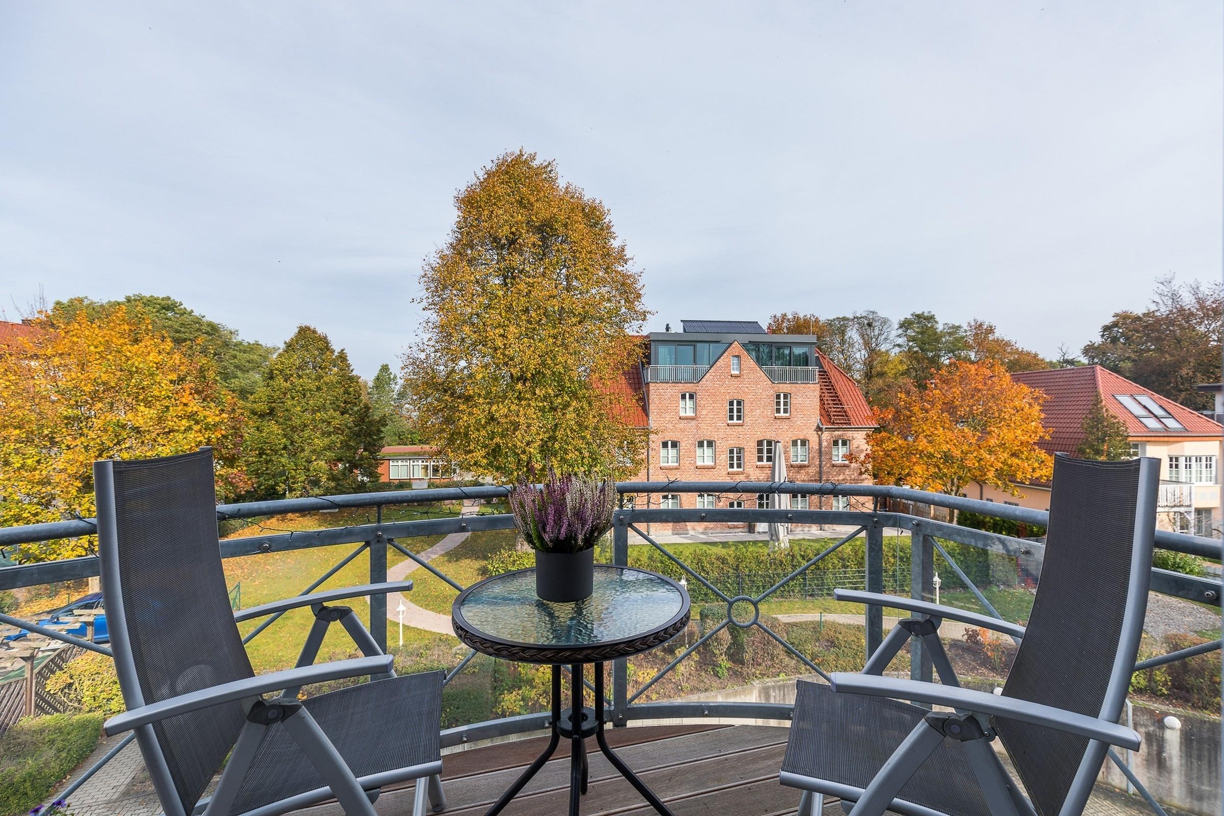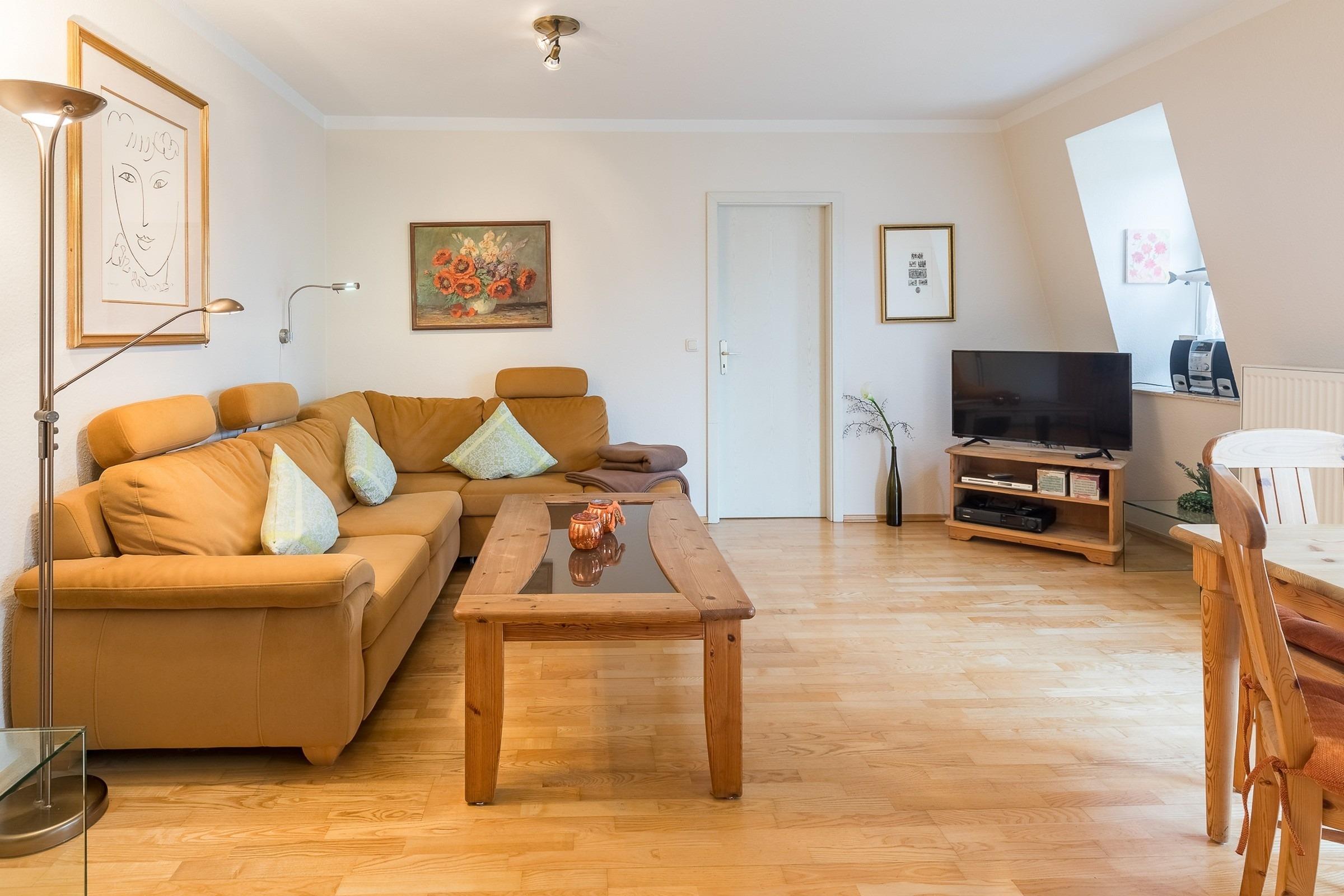 Vom Wohnzimmer mit bequemer Polstergarnitur und Unterhaltungselektronik gelangen Sie direkt auf den möblierten Nordbalkon, Richtung Ostsee.