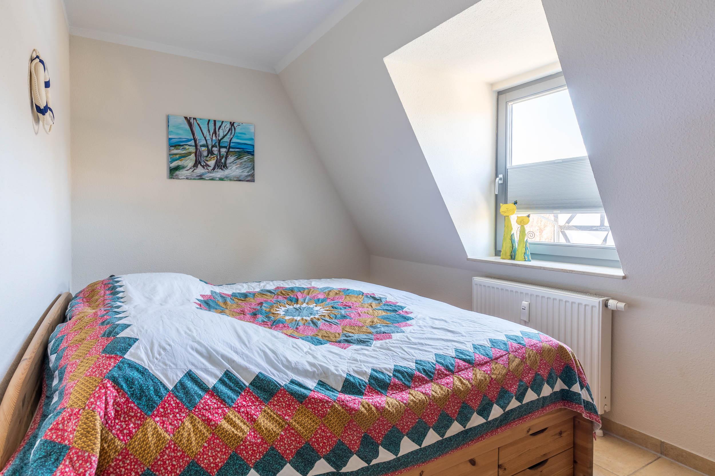 Ebenso befinden sich auf dieser Ebene zwei der insgesamt drei Schlafzimmer: in dem kleineren Schlafzimmer steht ein kleines französisches Doppelbett (140x200cm) und ein Kleiderschrank bereit. Das zweite Schlafzimmer ist mit einem Doppelbett (180x200cm) und ebenfalls einem Kleiderschrank ausgestattet.