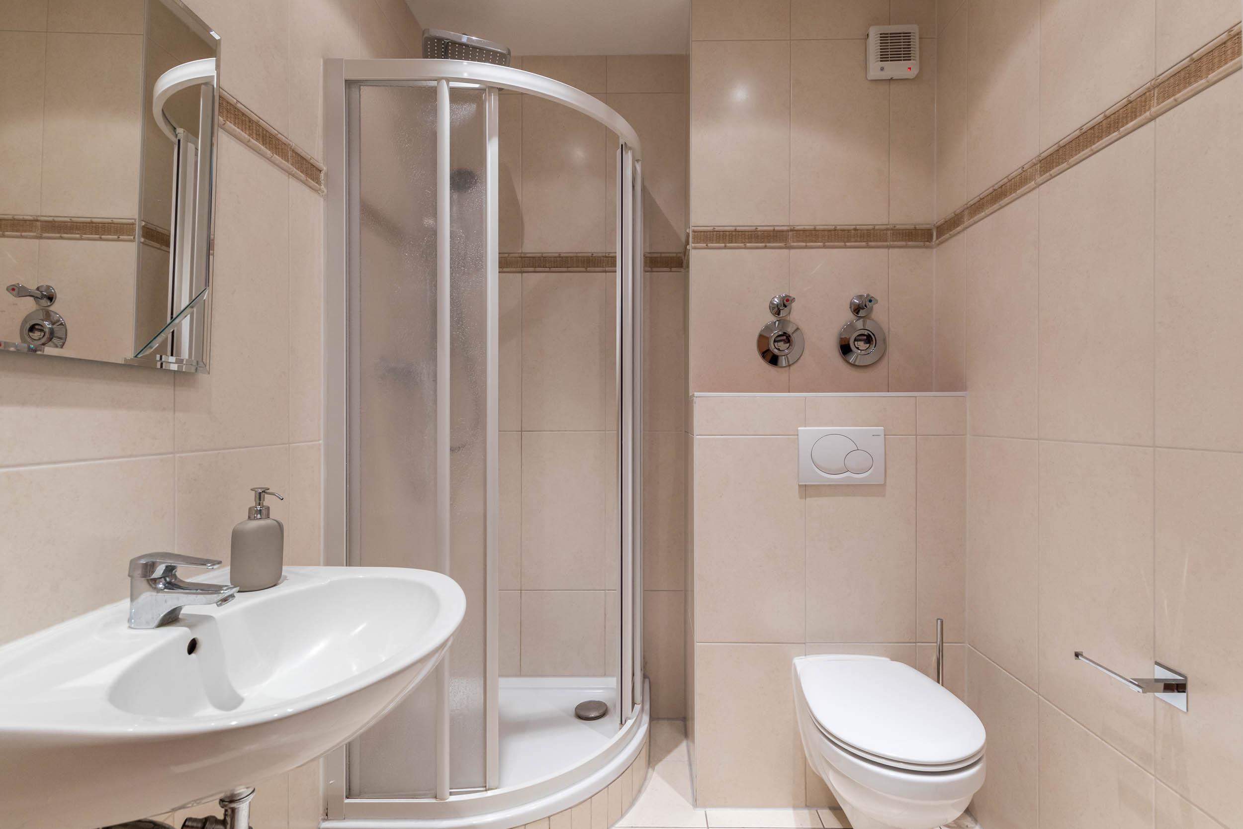 Auch das hell geflieste Badezimmer liegt in der ersten Etage. Hier finden Sie eine Dusche und das WC vor. Wärmen Sie Ihre Duschtücher gern an der elektrischen Handtuchheizung.