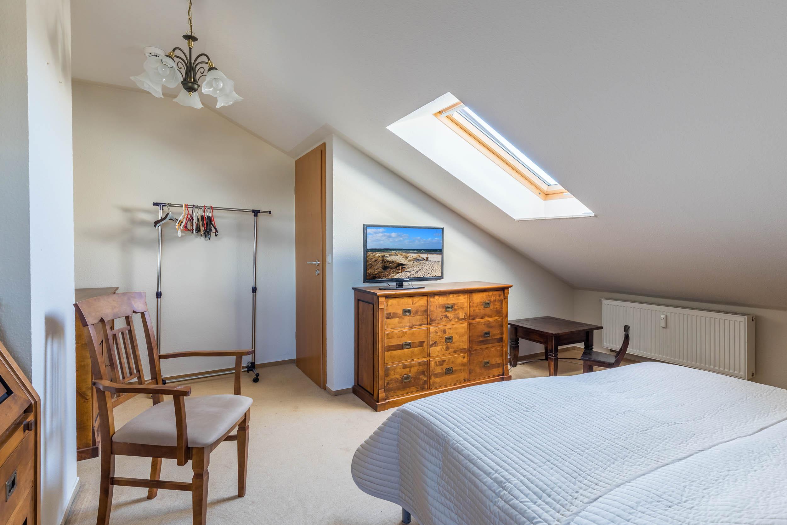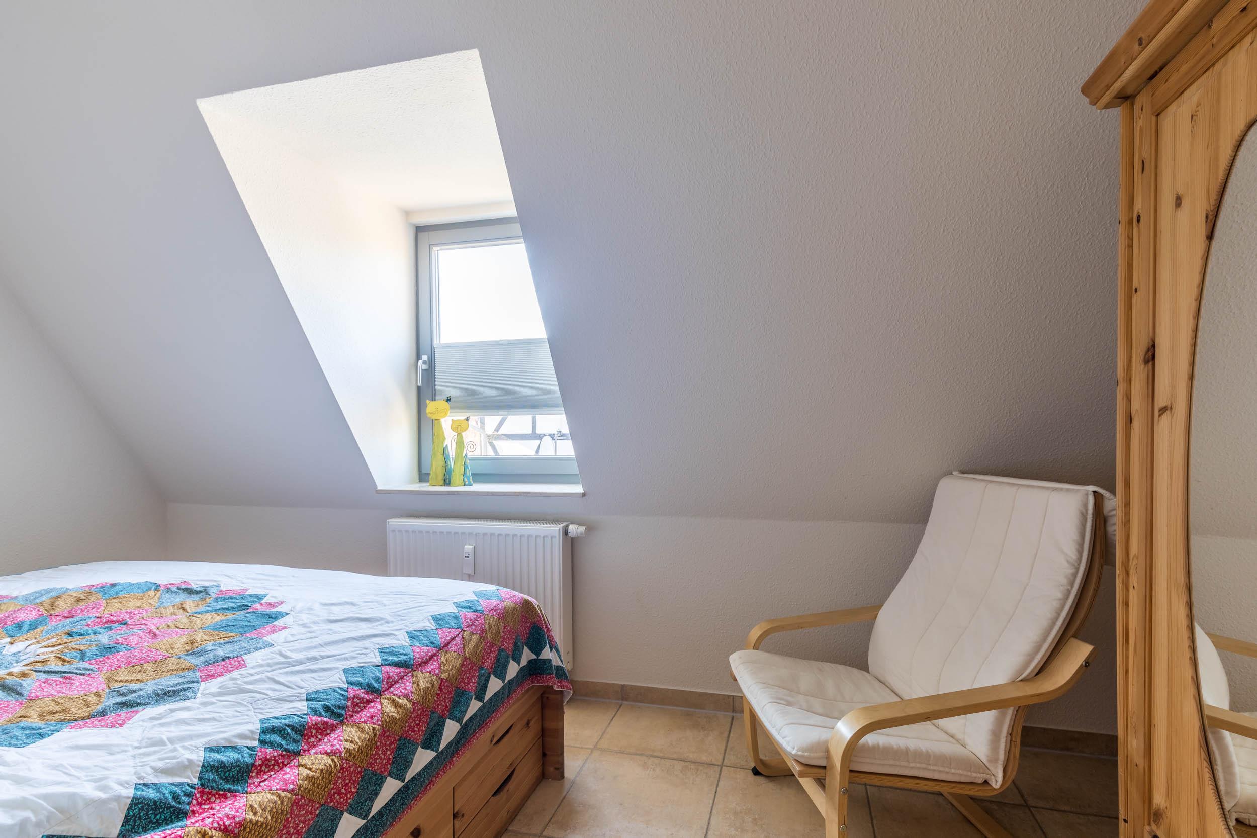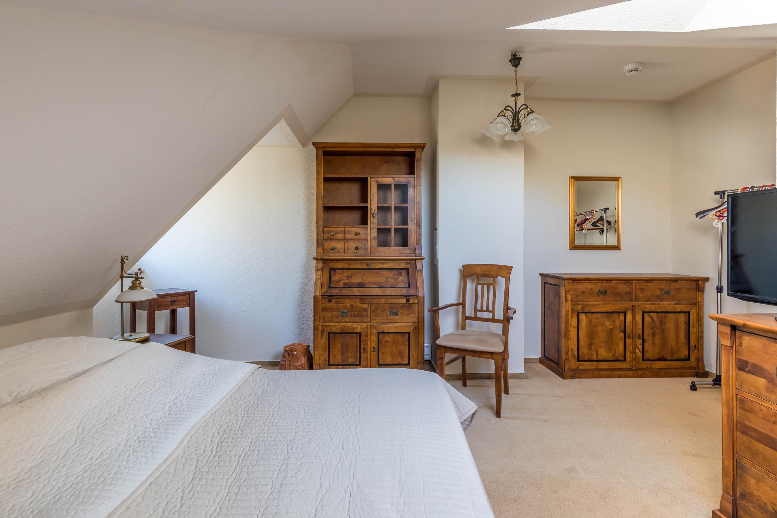 Das Dachgeschoss als zweite Wohnebene empfängt Sie mit einem kleinen Vorraum als Galerie. Hier steht ein Kleiderschrank, ein Kühlschrank mit Gefrierfach und hinter dem Paravent ein zusätzliches Gäste-WC. Oder Sie nutzen die Galerie zum Abschalten und relaxen auf dem Sessel.