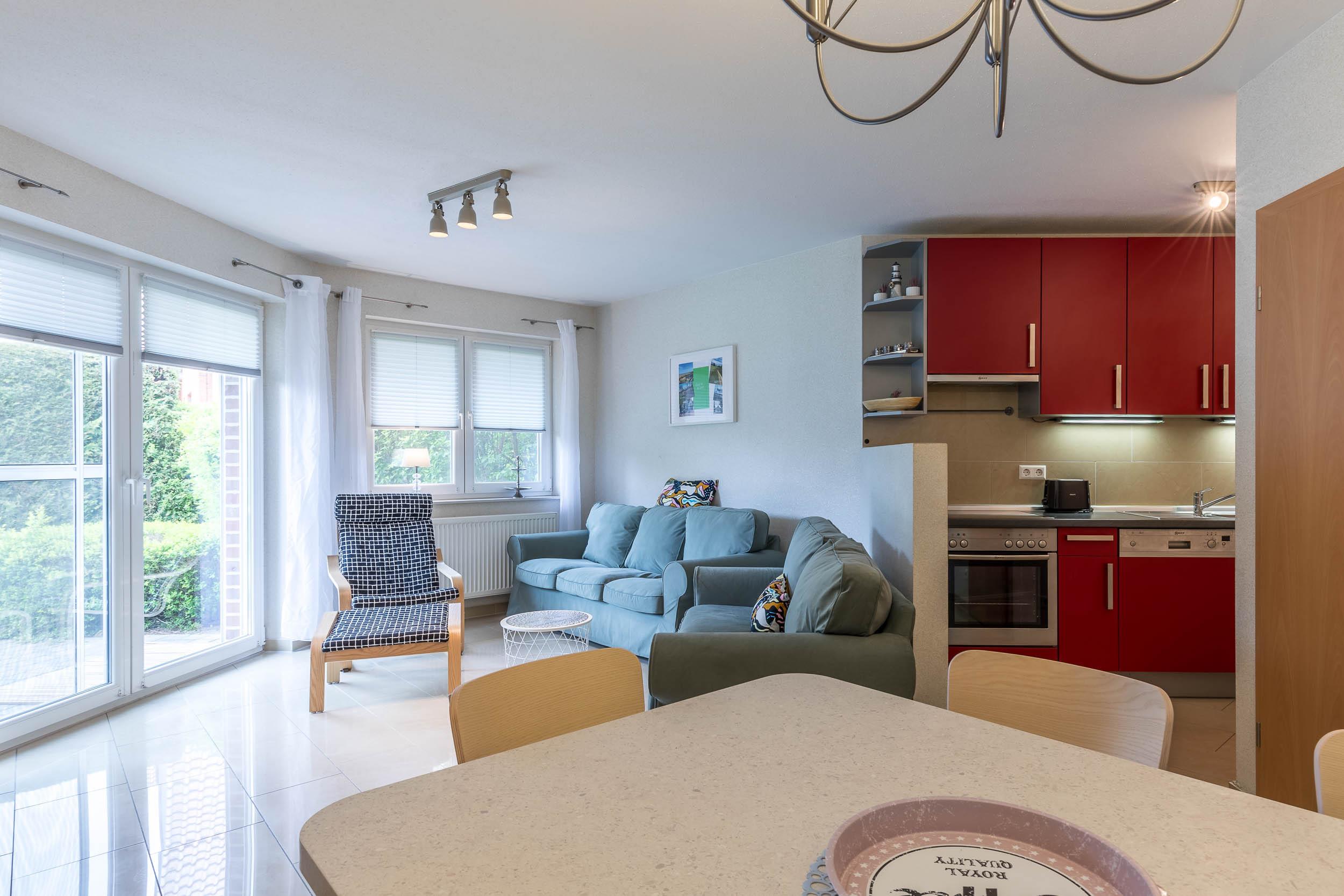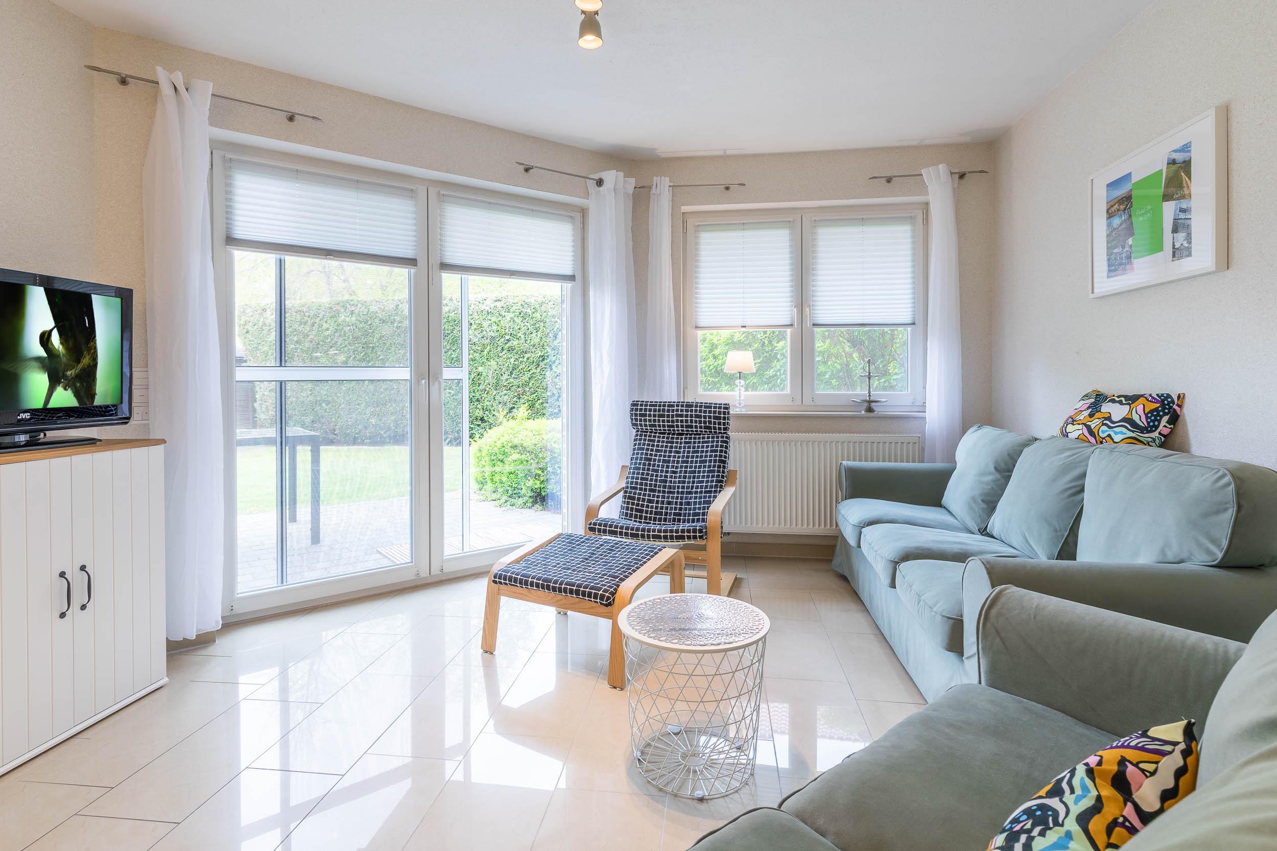 Vom Wohnbereich aus, der mit Flatscreen-TV und Sitzecke ausgestattet ist, gelangen Sie auf die möblierte Südost-Terrasse mit angrenzendem Grundstück, wo Sie die Sonne genießen und die Kinder draußen spielen können.