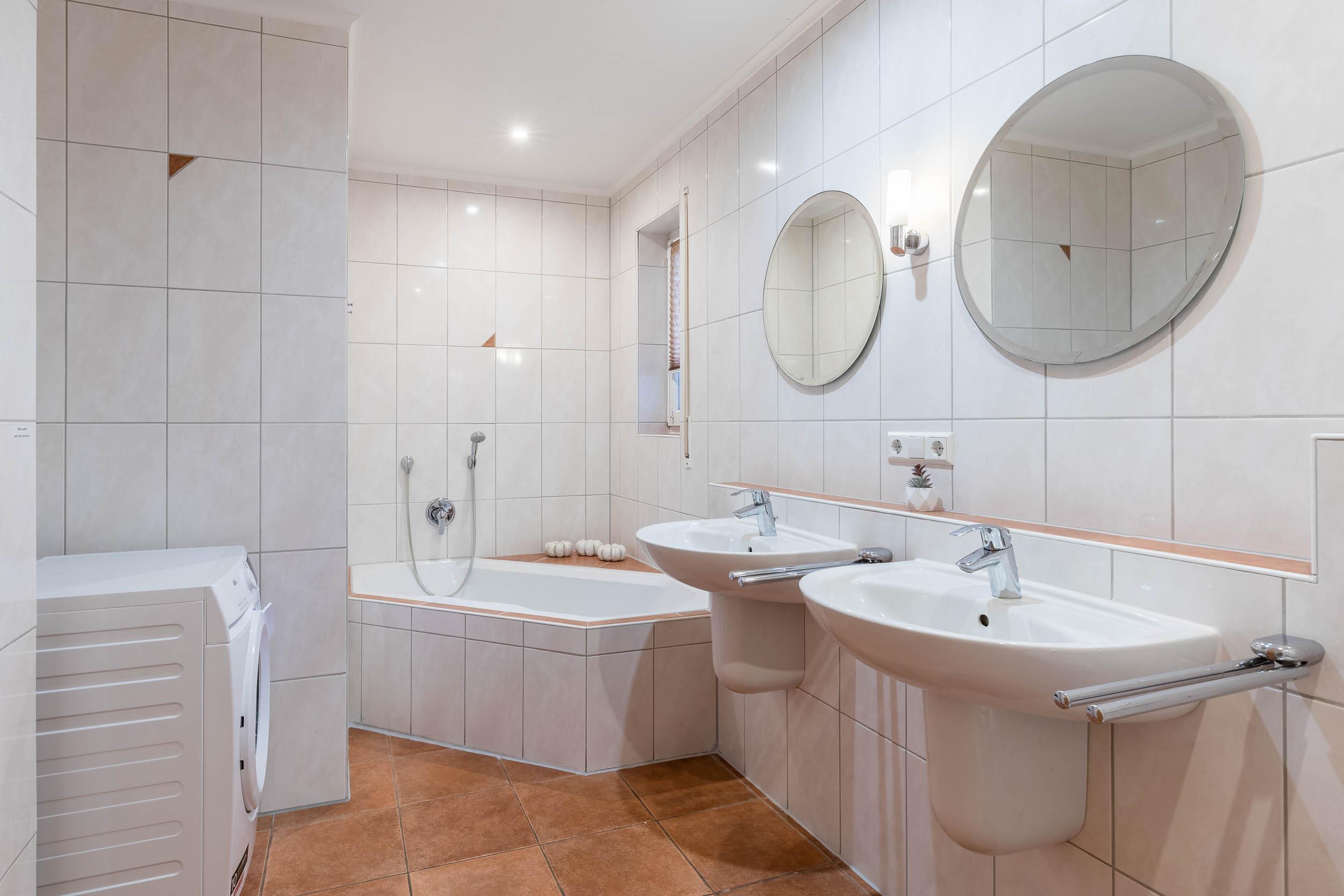 Im großen Badezimmer finden Sie sowohl eine ebenerdige Dusche als auch eine schöne Eckbadewanne sowie 2 Waschbecken und WC vor.