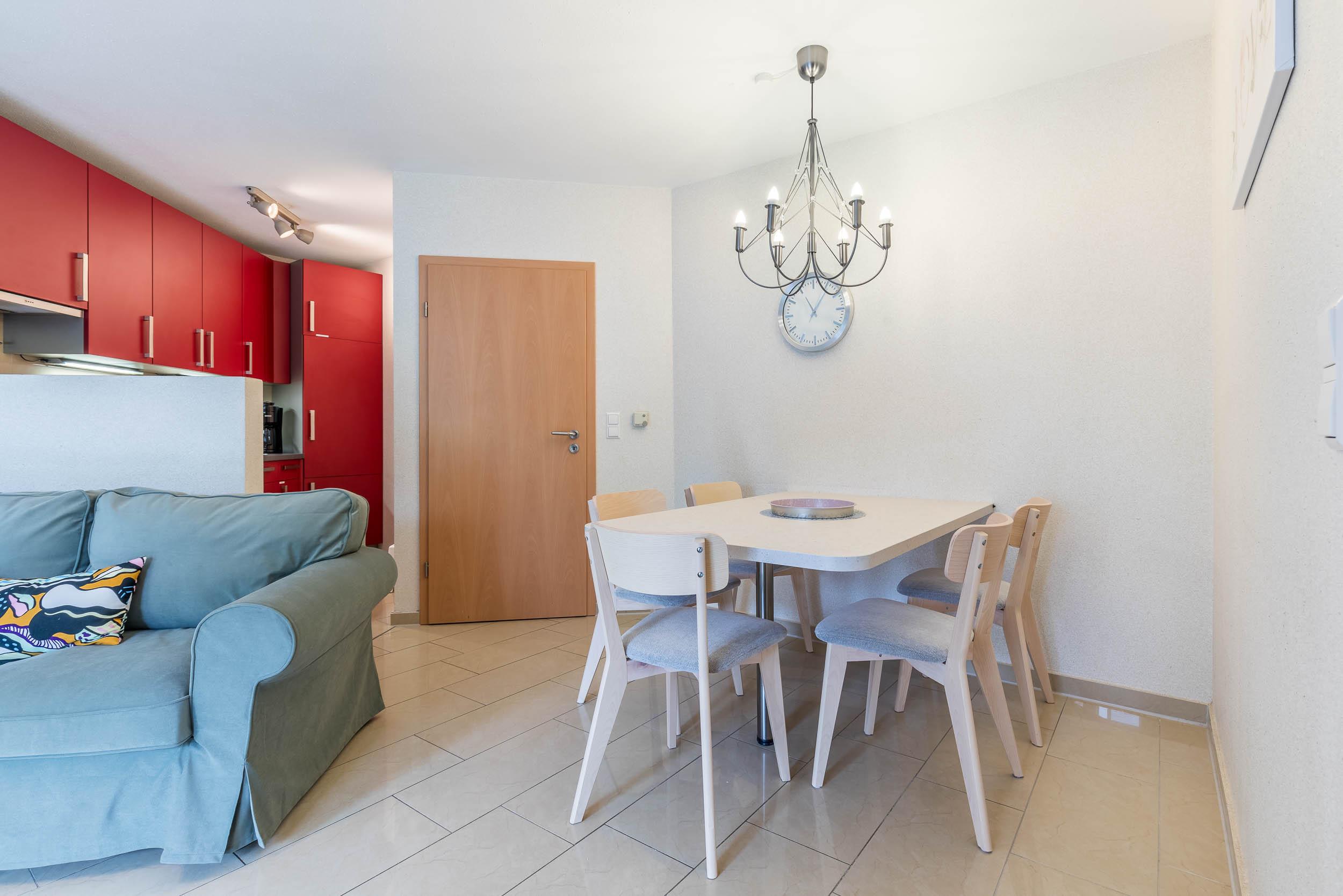 In der offenen Wohnküche lassen sich kulinarische Freuden einfach zubereiten. Die Küche ist mit allem ausgestattet, was das Herz begehrt. Ihre Mahlzeiten können Sie anschließend bequem an der gemütlichen Essecke im Wohnbereich einnehmen.