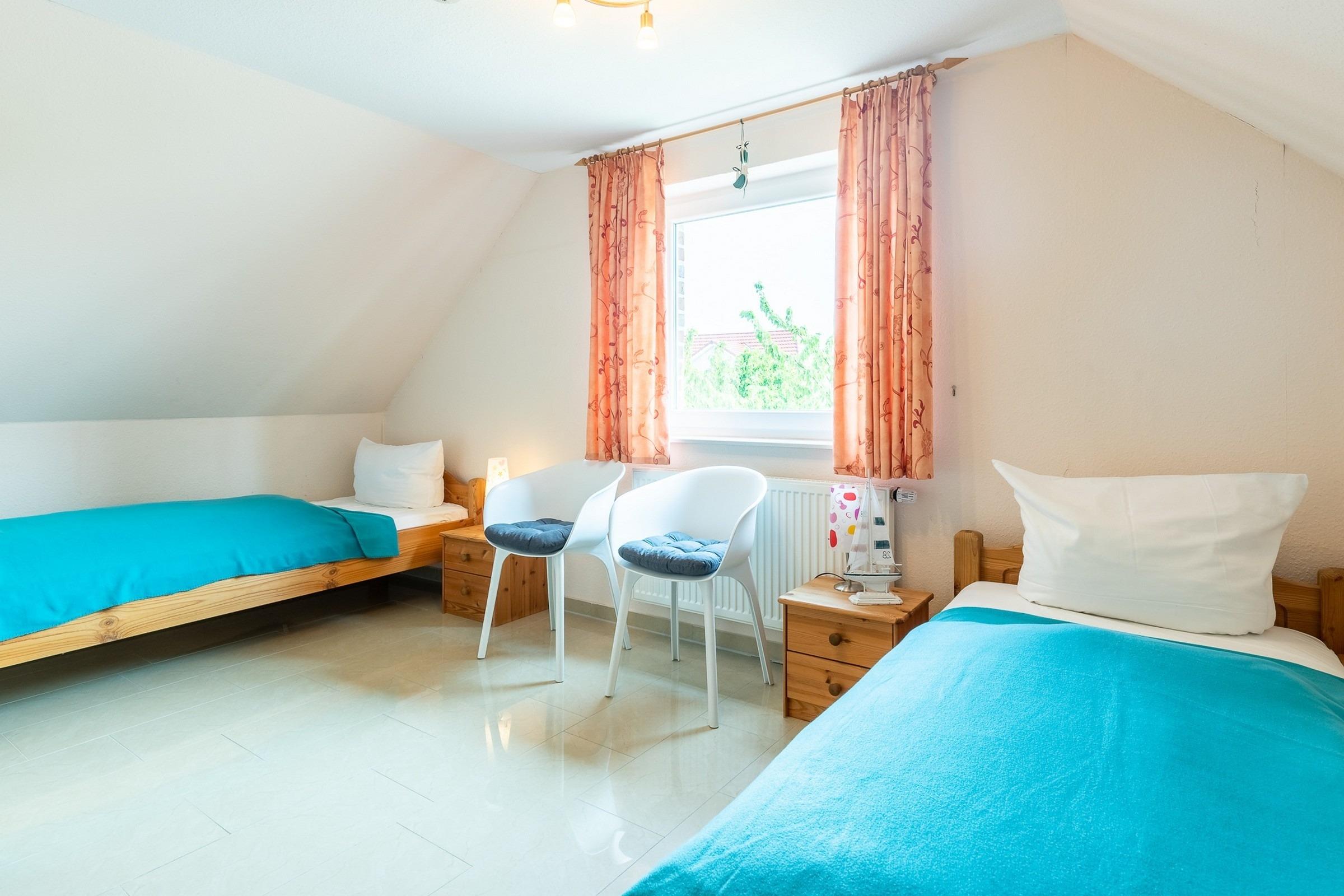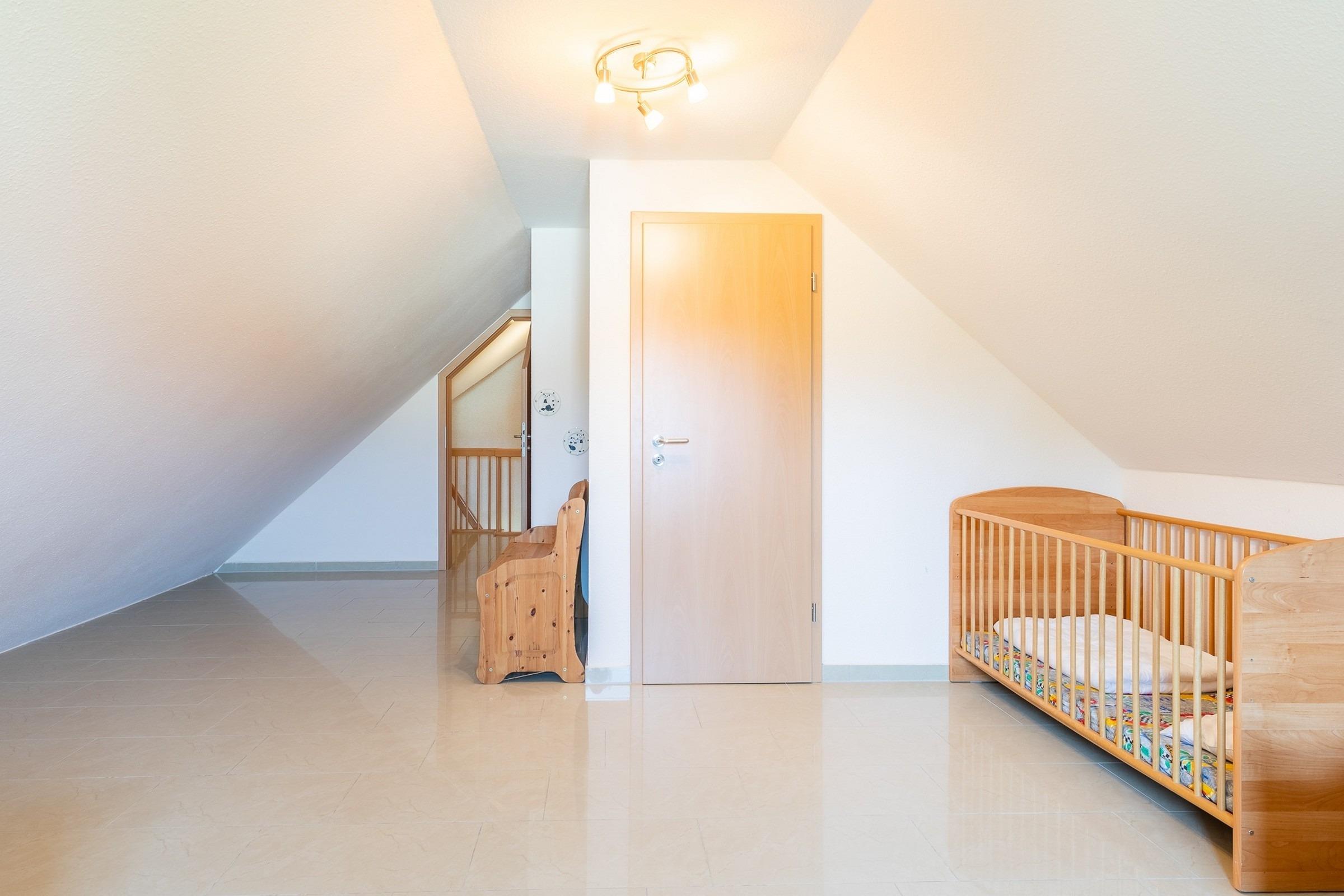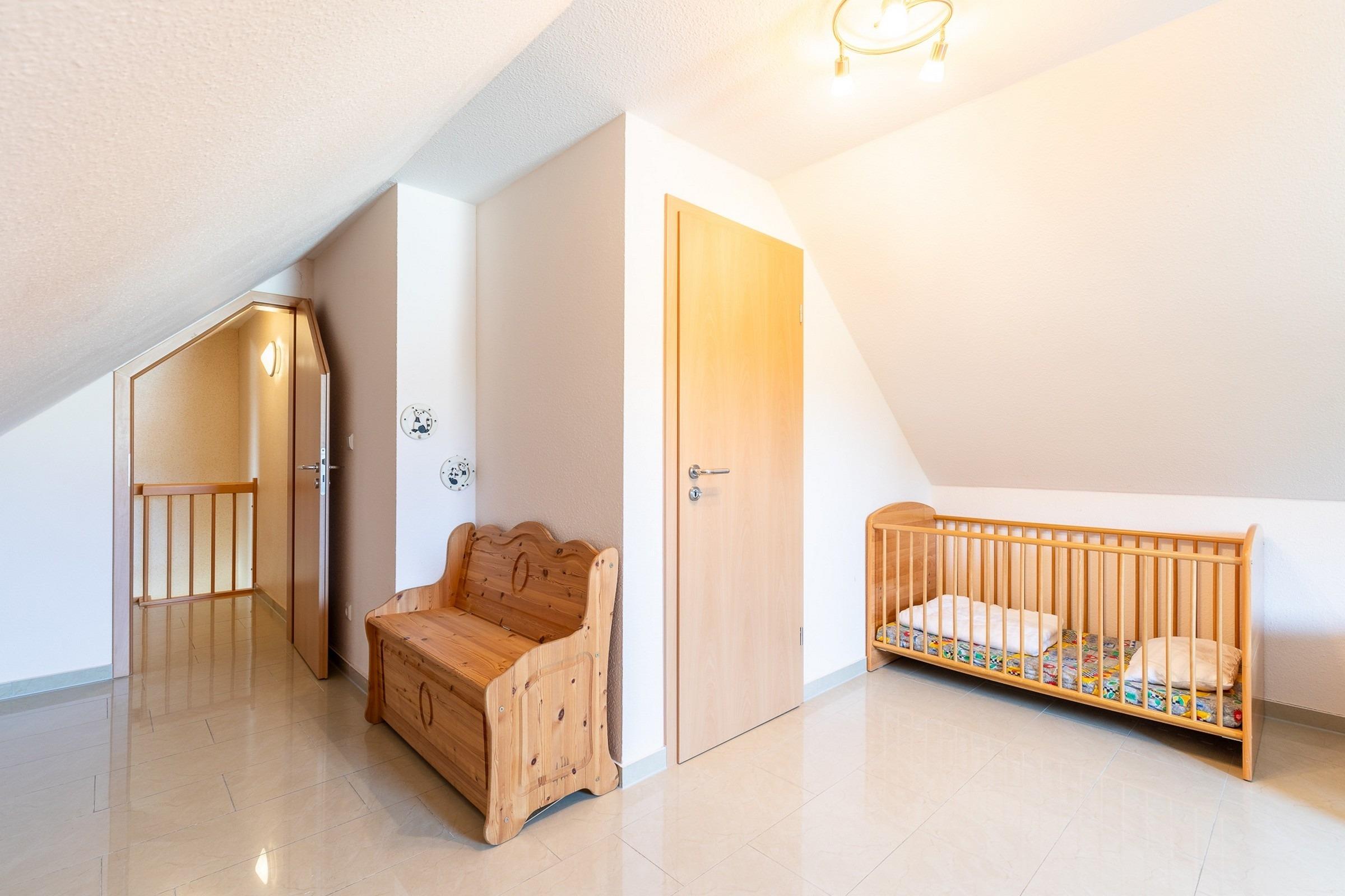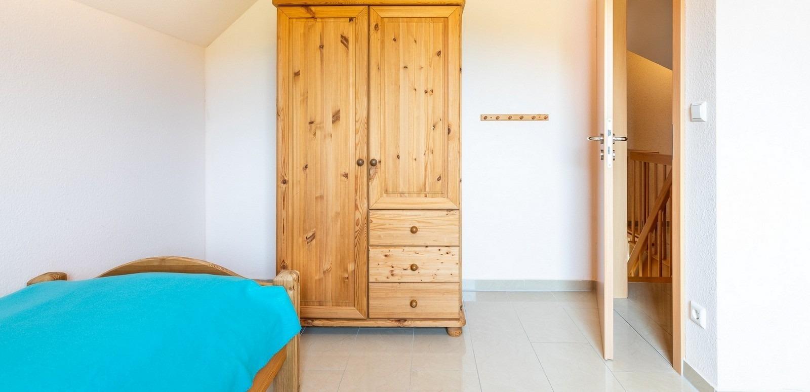 In dieser 2. Ebene befinden sich zwei große Gäste-/ Kinderzimmer mit jeweils 2 Einzelbetten, in einem der Zimmer steht zudem ein festes Holz-Kinderbettchen und in dem Anderen ein Kleiderschrank.