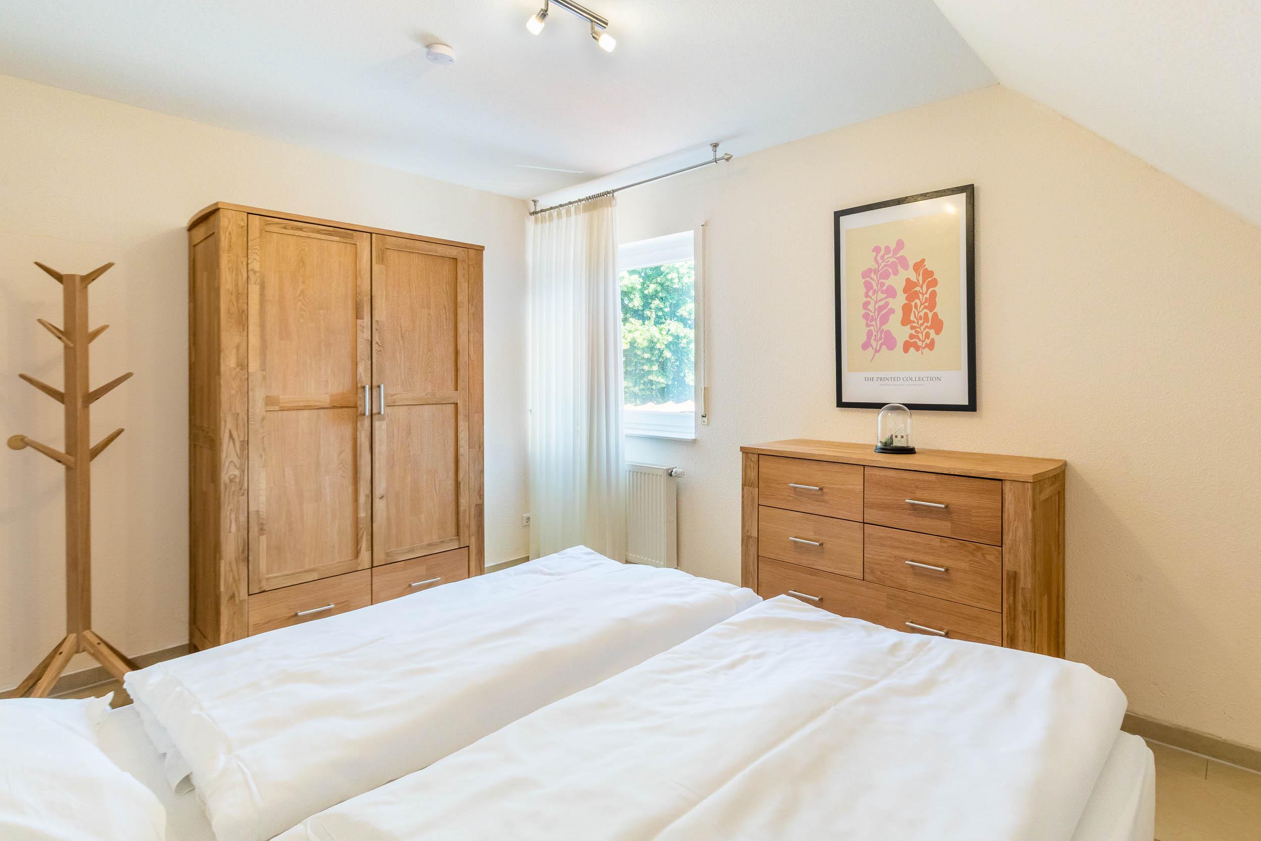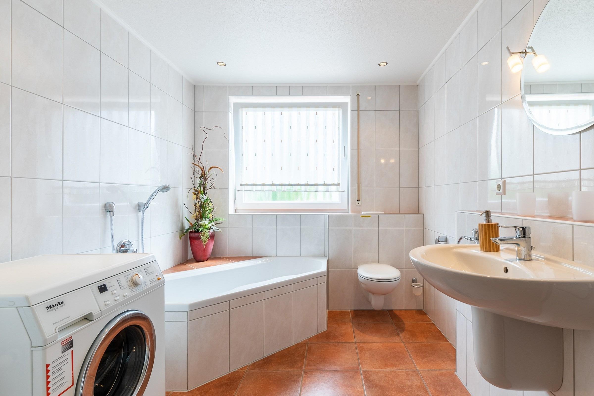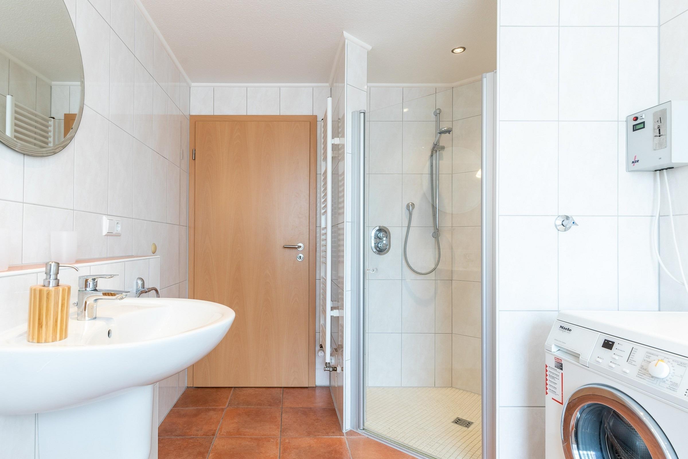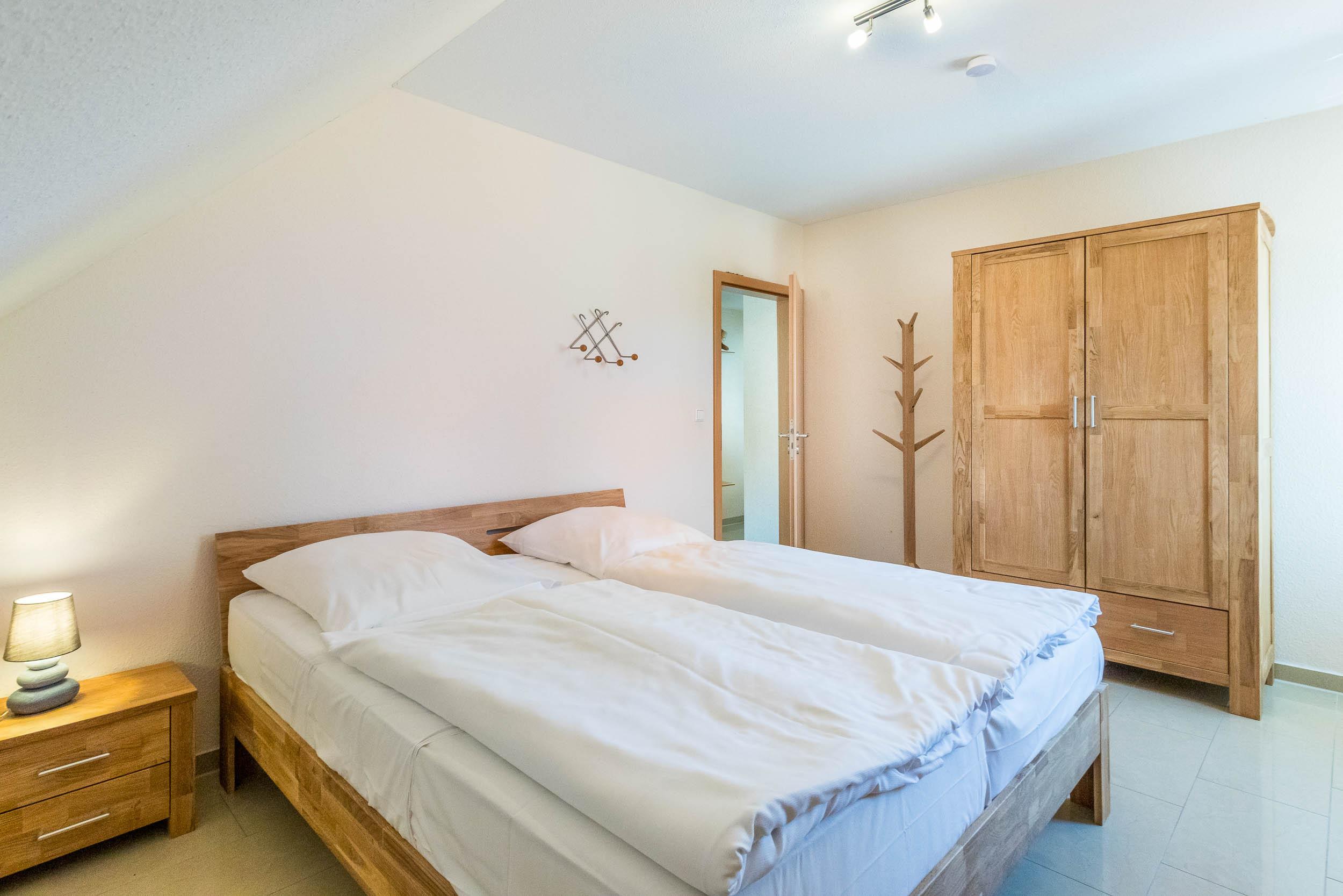 Weiterhin finden Sie auf dieser Ebene das Schlafzimmer mit Doppelbett und Kleiderschrank sowie ein großes, helles Bad mit barrierefreier Dusche, Eckbadewanne, WC und Münz-Waschmaschine.
