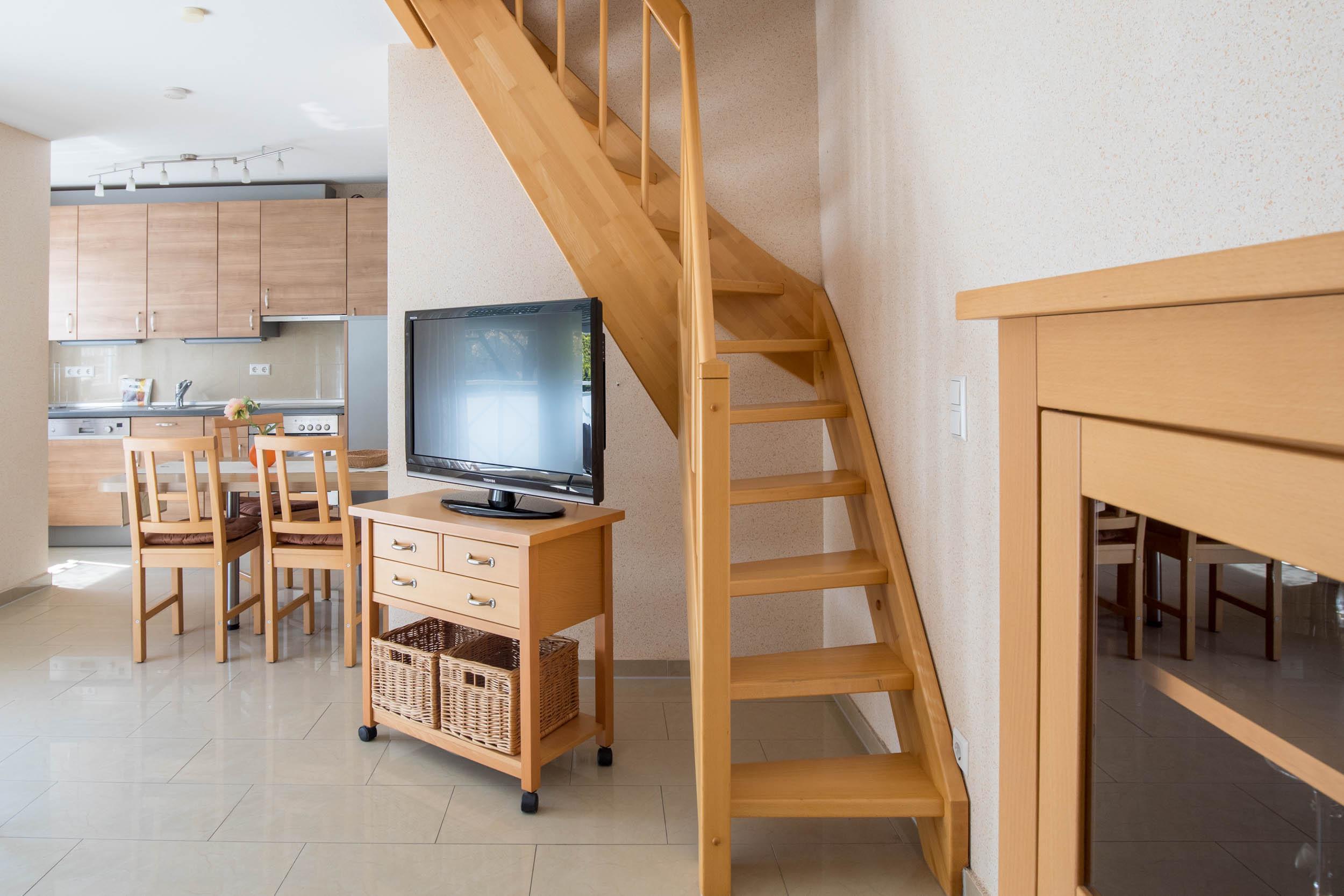Ein helles Wohnzimmer im unteren Wohnbereich in warmen Farben sorgt mit SAT-TV und Mini-Stereoanlage für Gemütlichkeit, die integrierte Wohnküche mit Essecke für kulinarischen Genuss.