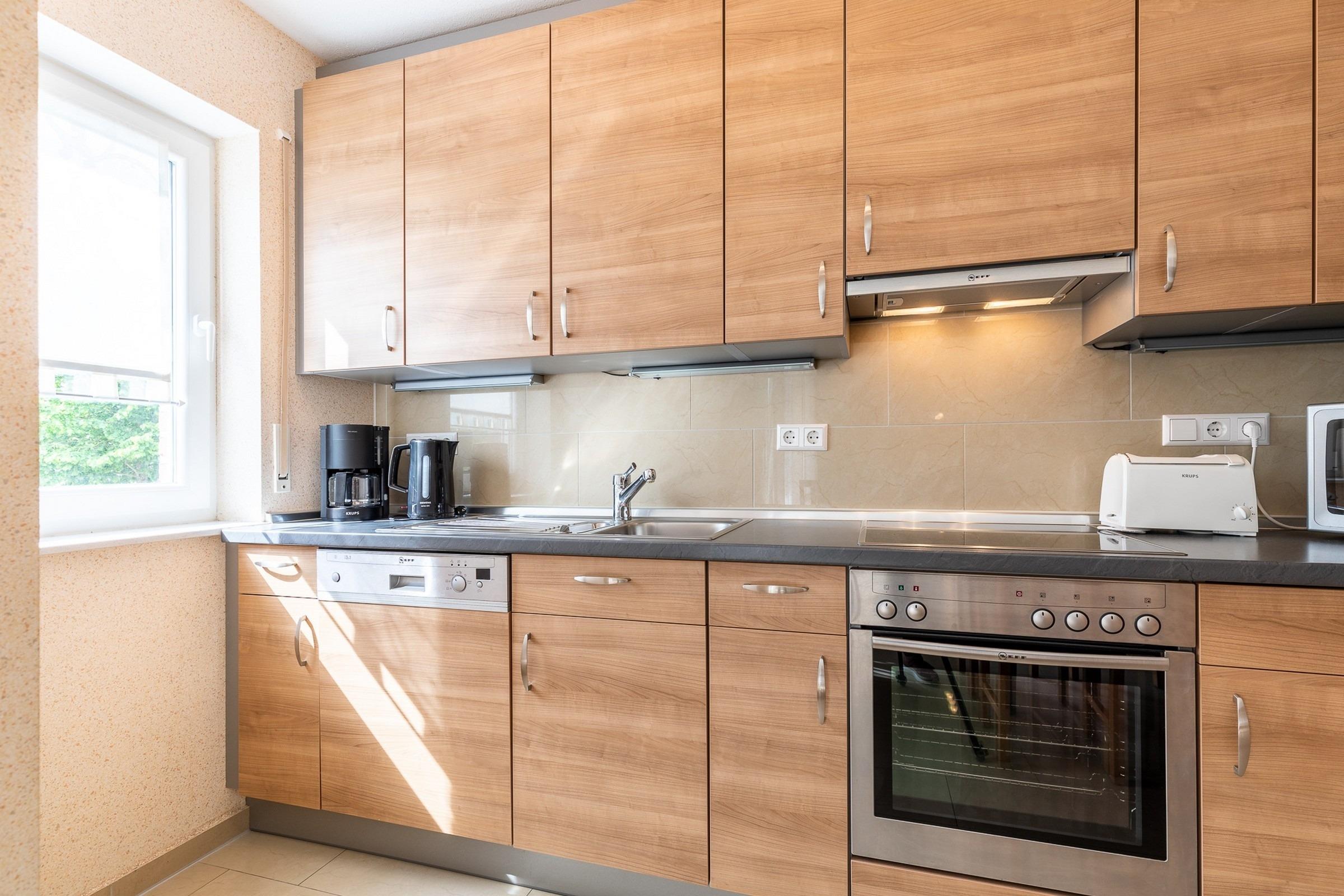Die moderne Küchenzeile bietet Kühlschrank, Herd/ Ceranfeld, Backofen, Geschirrspüler, Mikrowelle, Elektrokleingeräte sowie ausreichend Geschirr [&] Co.