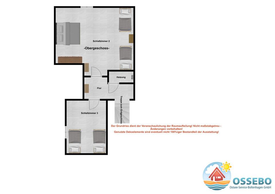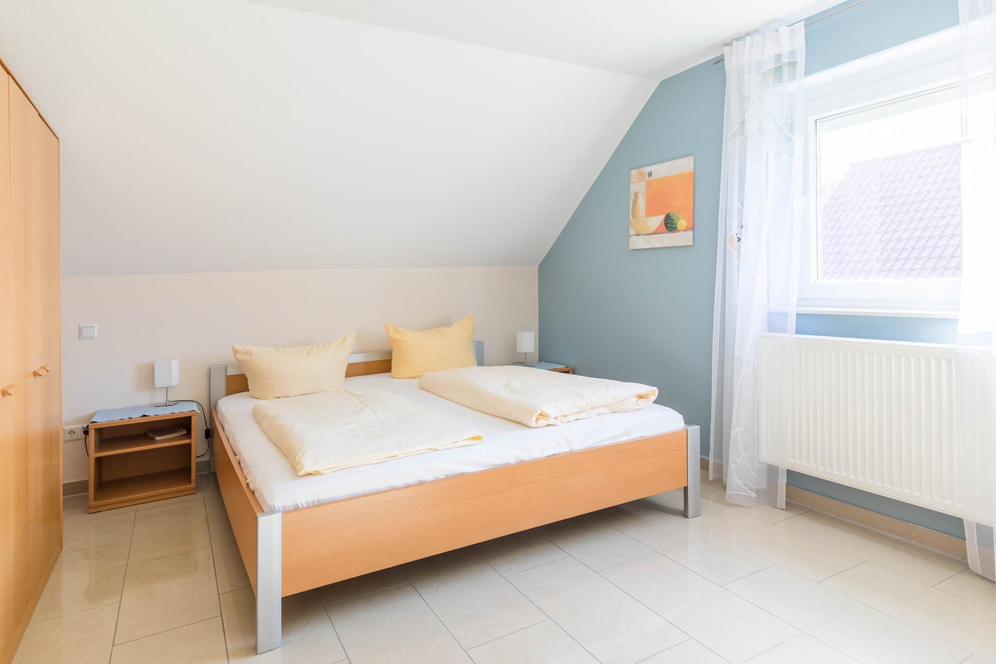 In der 2. Ebene (im DG) erwarten Sie 2 weitere separate Schlafräume: In dem großen Schlafzimmer befindet sich ein Doppelbett (80x200cm), zwei Einzelbetten (je 90x200cm) sowie ein Kleiderschrank. Auch hier ist noch genügend Platz für ein mitgebrachtes oder bei uns gg. Gebühr geliehenes Reisebettchen.
