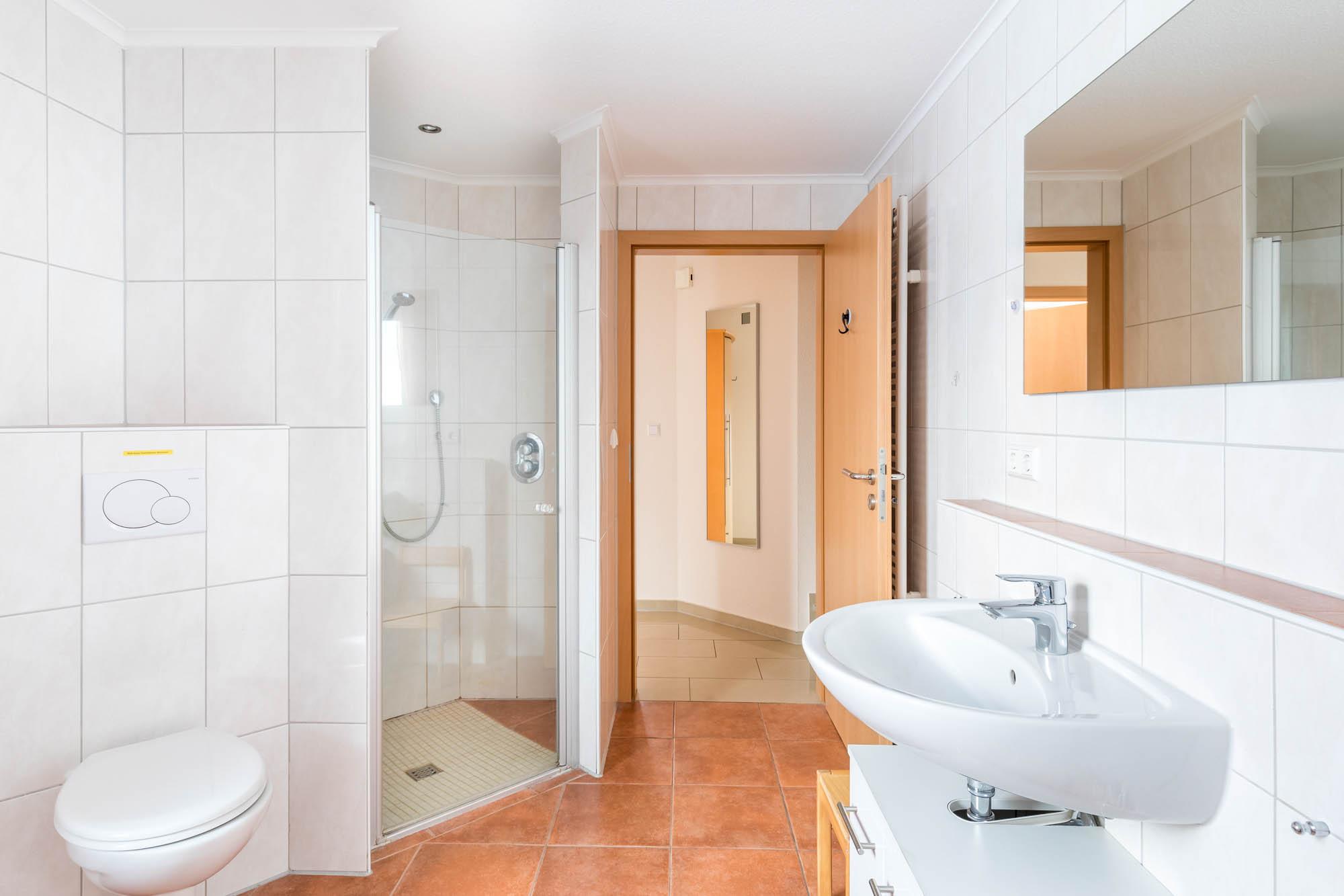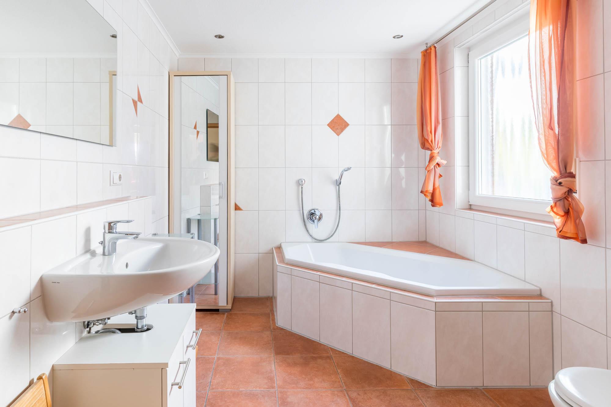 Auch das große, helle Bad mit Dusche, Eckbadewanne und WC befindet sich auf dieser Etage.