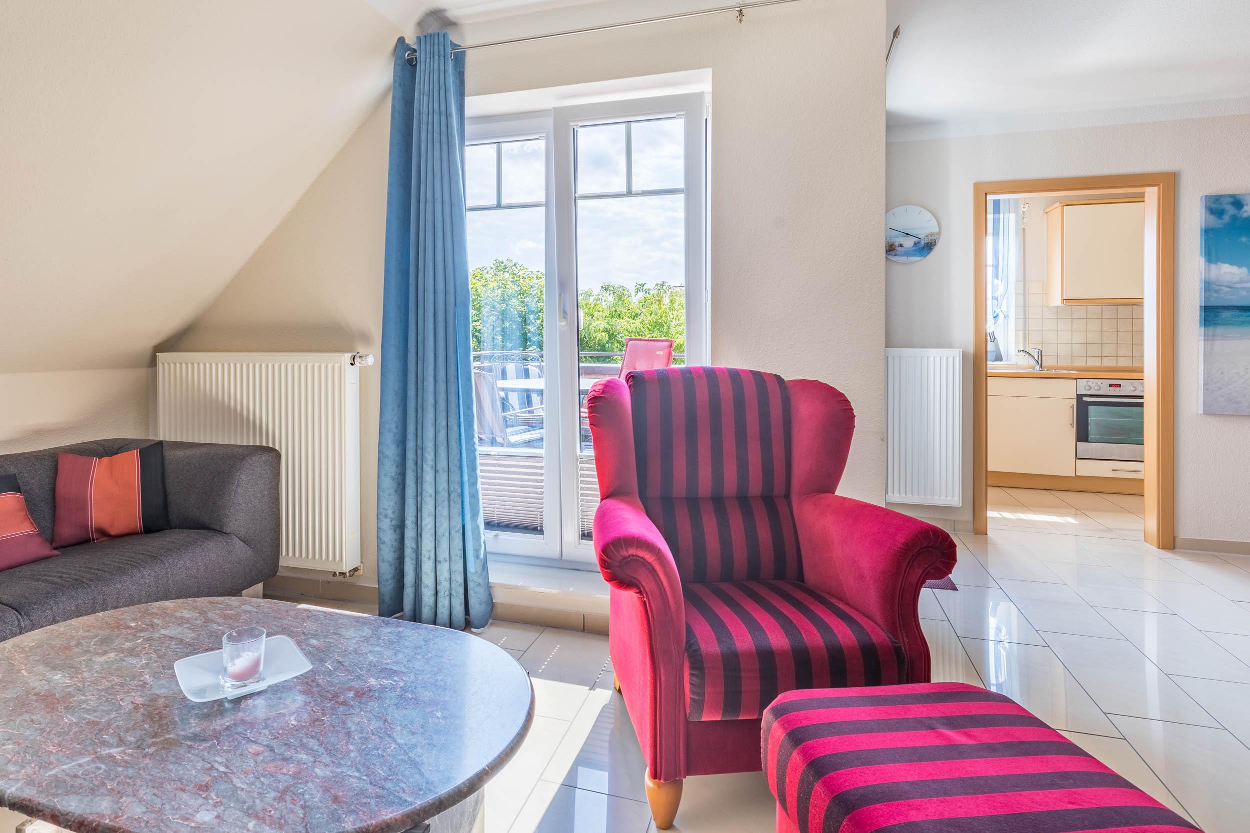 Das Wohnzimmer bietet eine gemütliche Möblierung und einen separaten Essbereich. SAT-TV und Musikanlage sorgen hier für Unterhaltung.