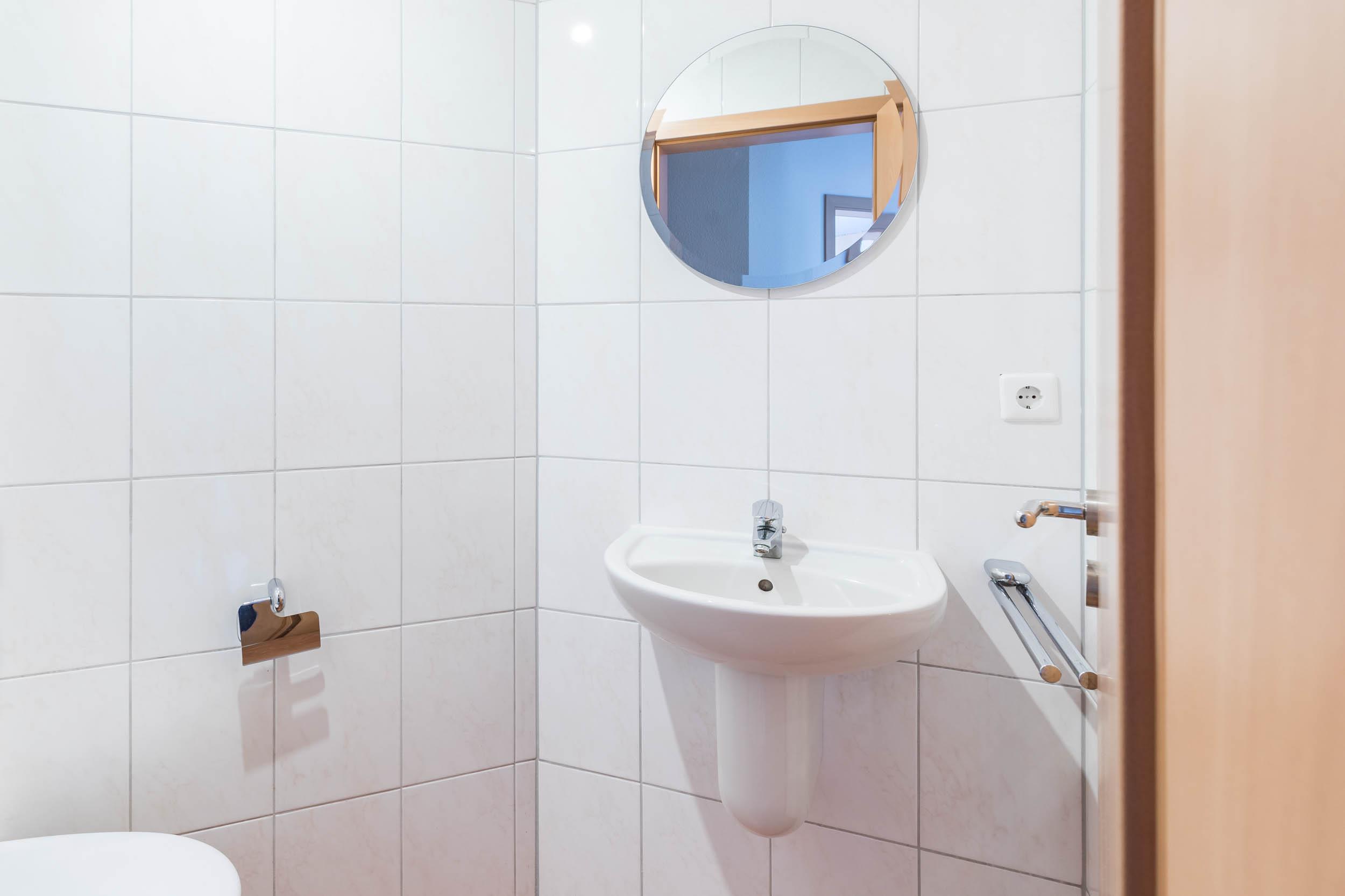 Ein großes Bad mit barrierefreier Dusche, Eckbadewanne und Waschtisch, getrennt vom separaten WC-Raum, ermöglichen hier zu jeder Zeit auch bei voller Belegung einen stressfreien Ablauf.