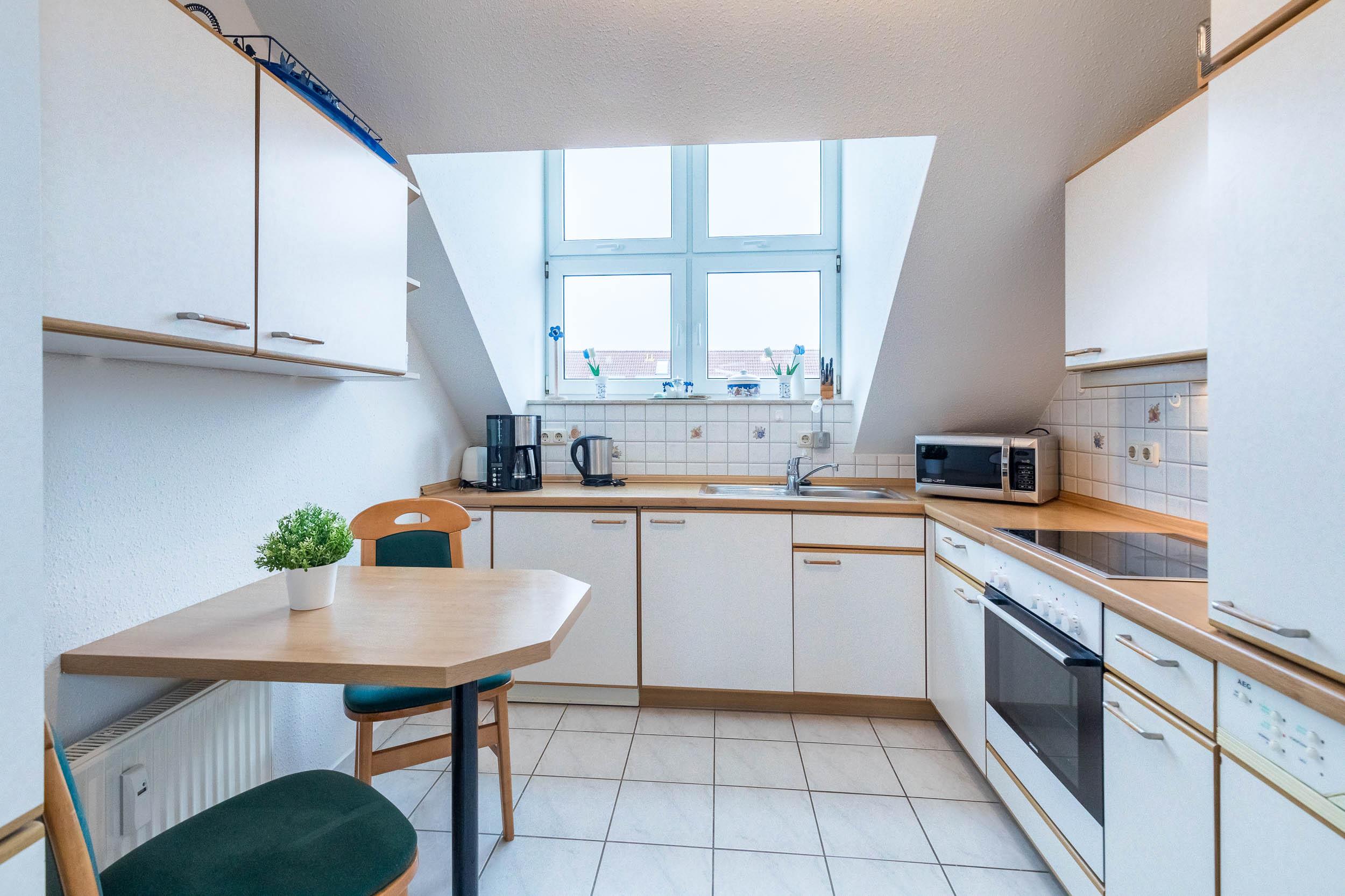 Vom Wohnbereich aus können Sie auf den kleinen möblierten Balkon gelangen. Die separate Küche bietet eine Vollausstattung, so sind hier u.a. Herd, Backofen, Kühlschrank mit Gefrierfach, Geschirrspüler, Kaffeemaschine und Nespresso-Maschine, Waschmaschine uvm. Ein kleiner Esstisch rundet das Paket ab.