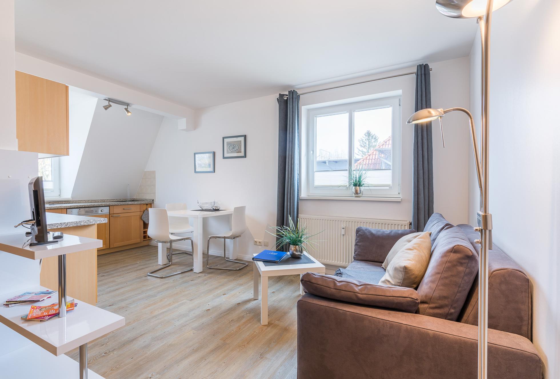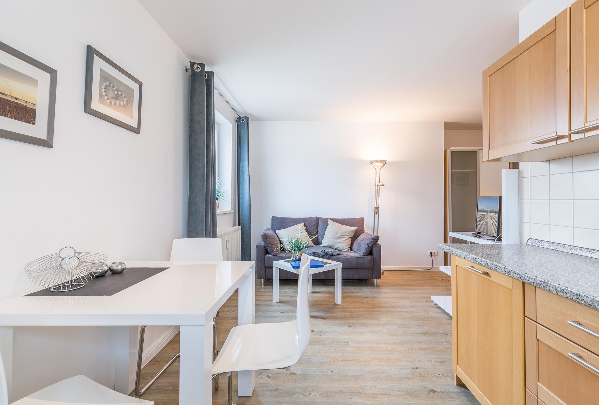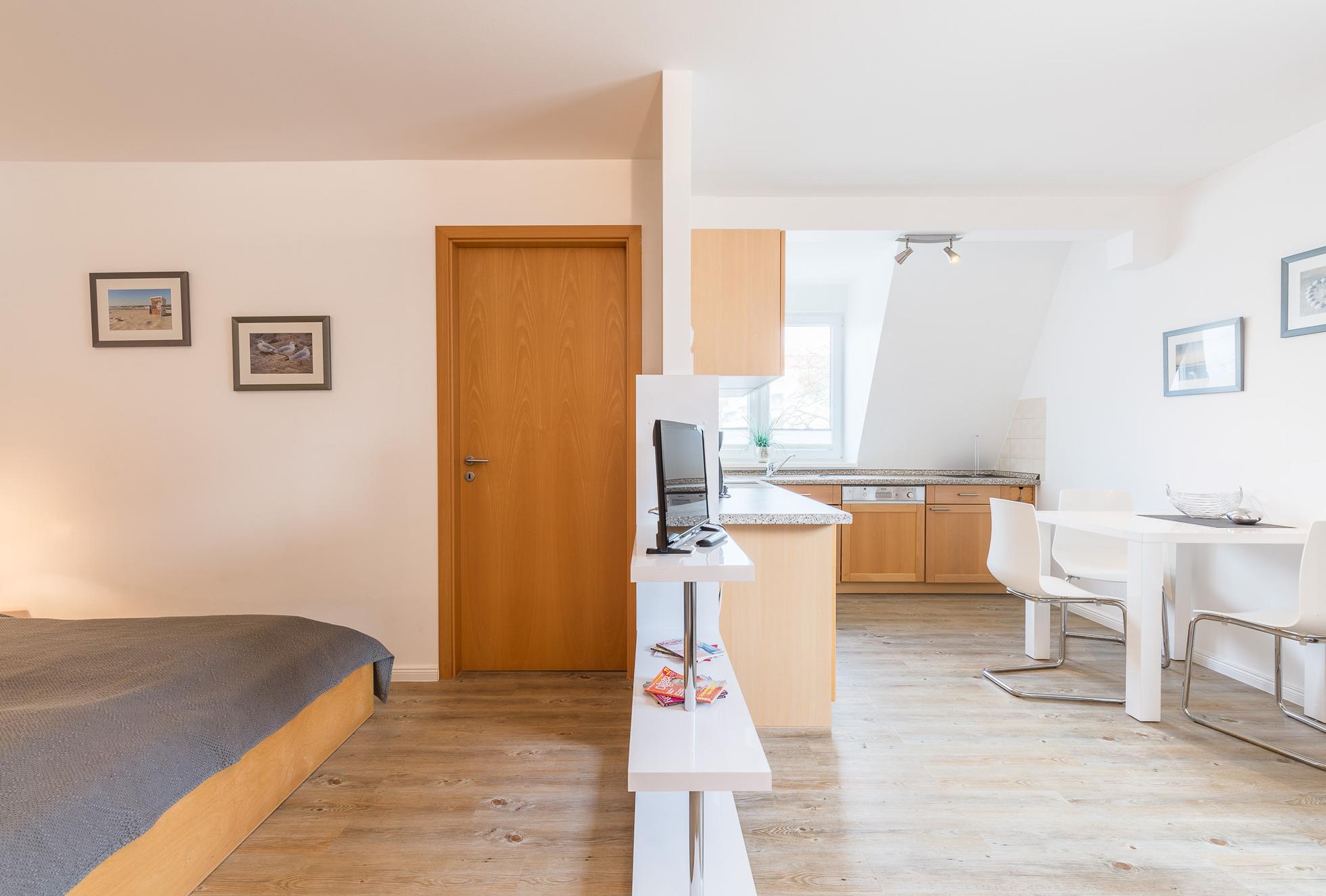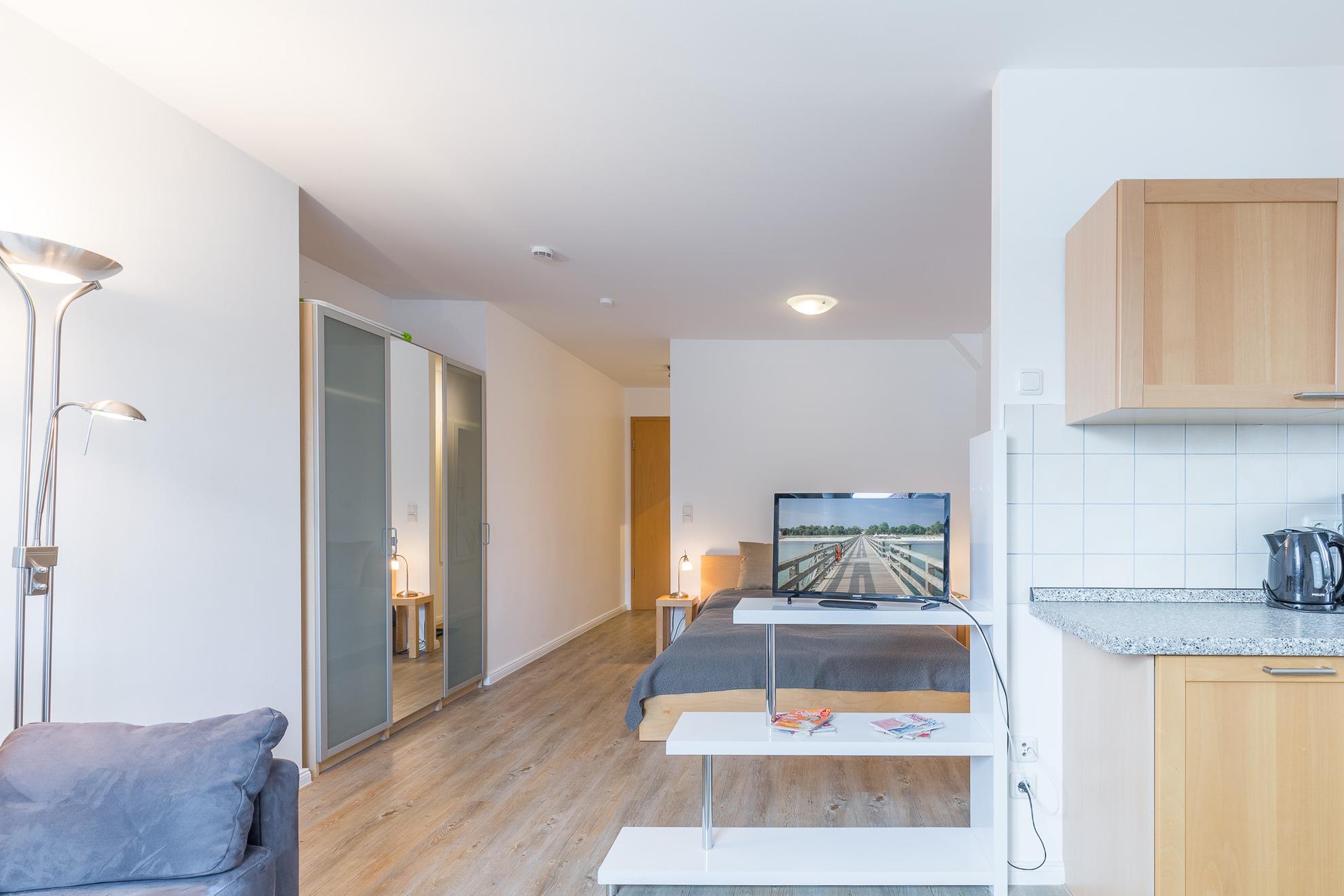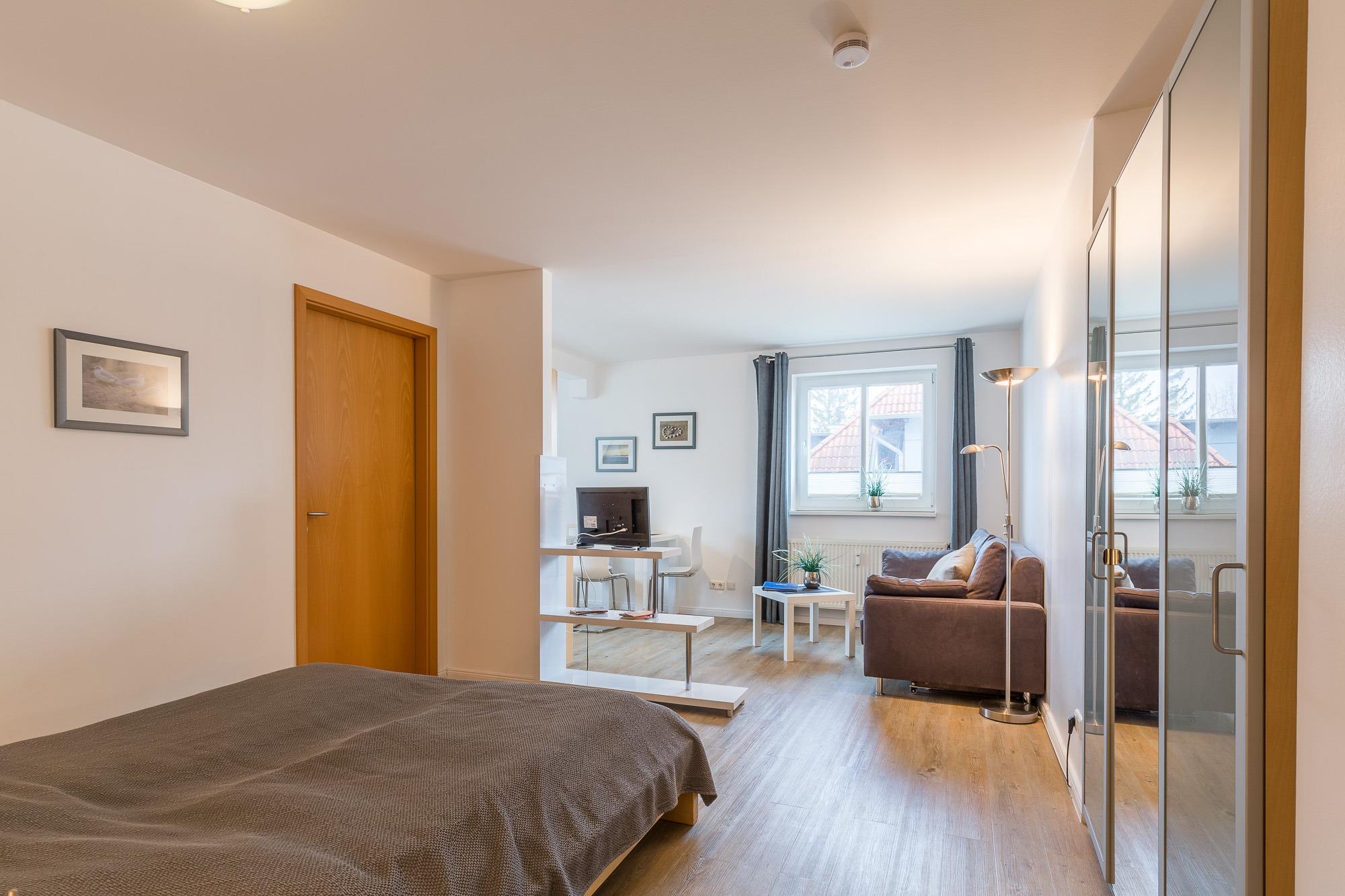 Das Appartement "Studio" im 2. Obergeschoss befindet sich im Zentrum von Boltenhagen und ist nur etwa 100 m vom Strand entfernt. Das etwa 35 qm große Appartement bietet mit einem kombinierten Wohn-/Schlafraum Platz für 2 Personen. Der Wohn- und der Schlafbereich sind durch einen Raumteiler getrennt.
