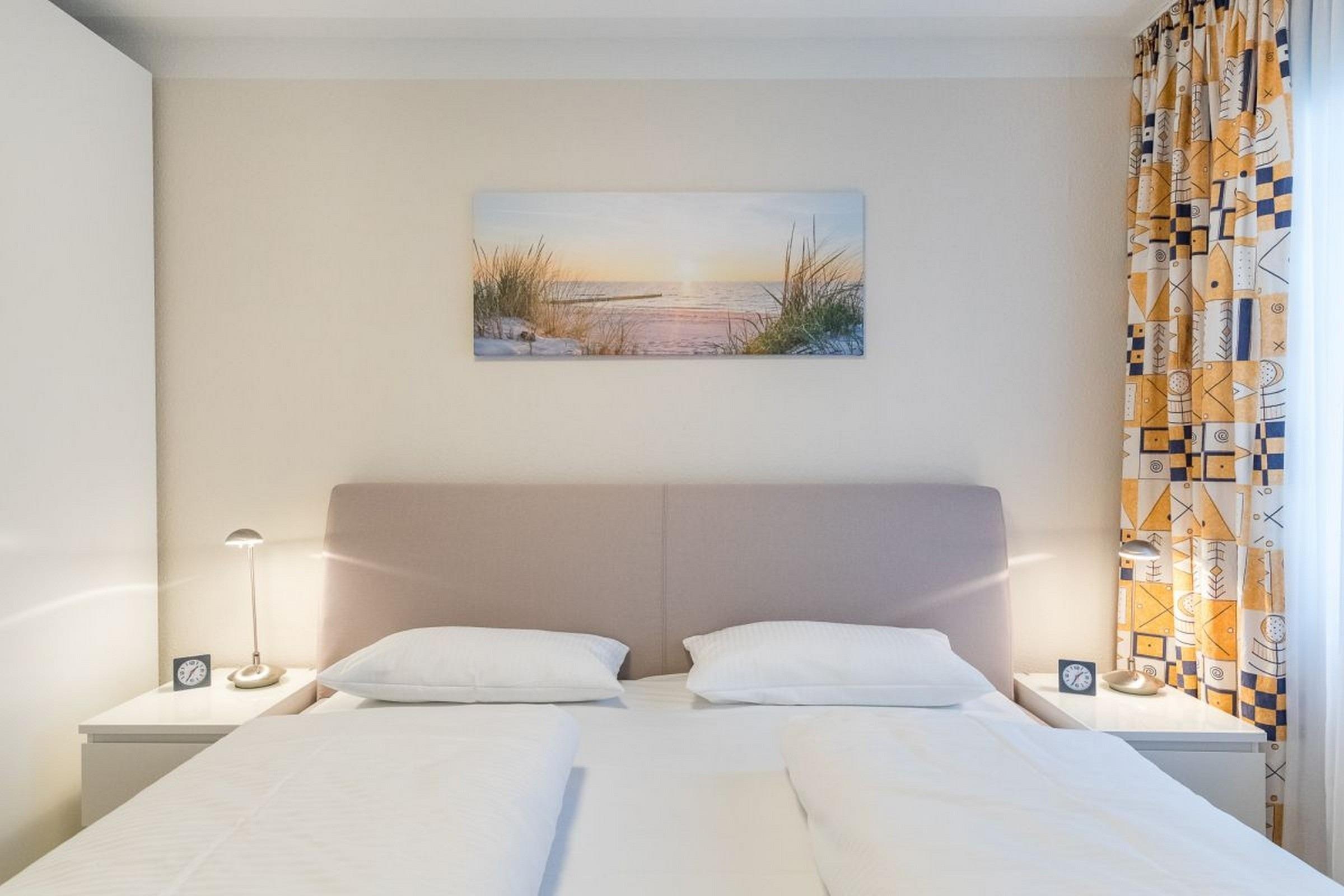 Das Schlafzimmer ist mit einem Doppelbett (180x200m) mit den passenden Nachtkonsolen sowie einem Kleiderschrank für Ihre Urlaubsgarderobe eingerichtet.
