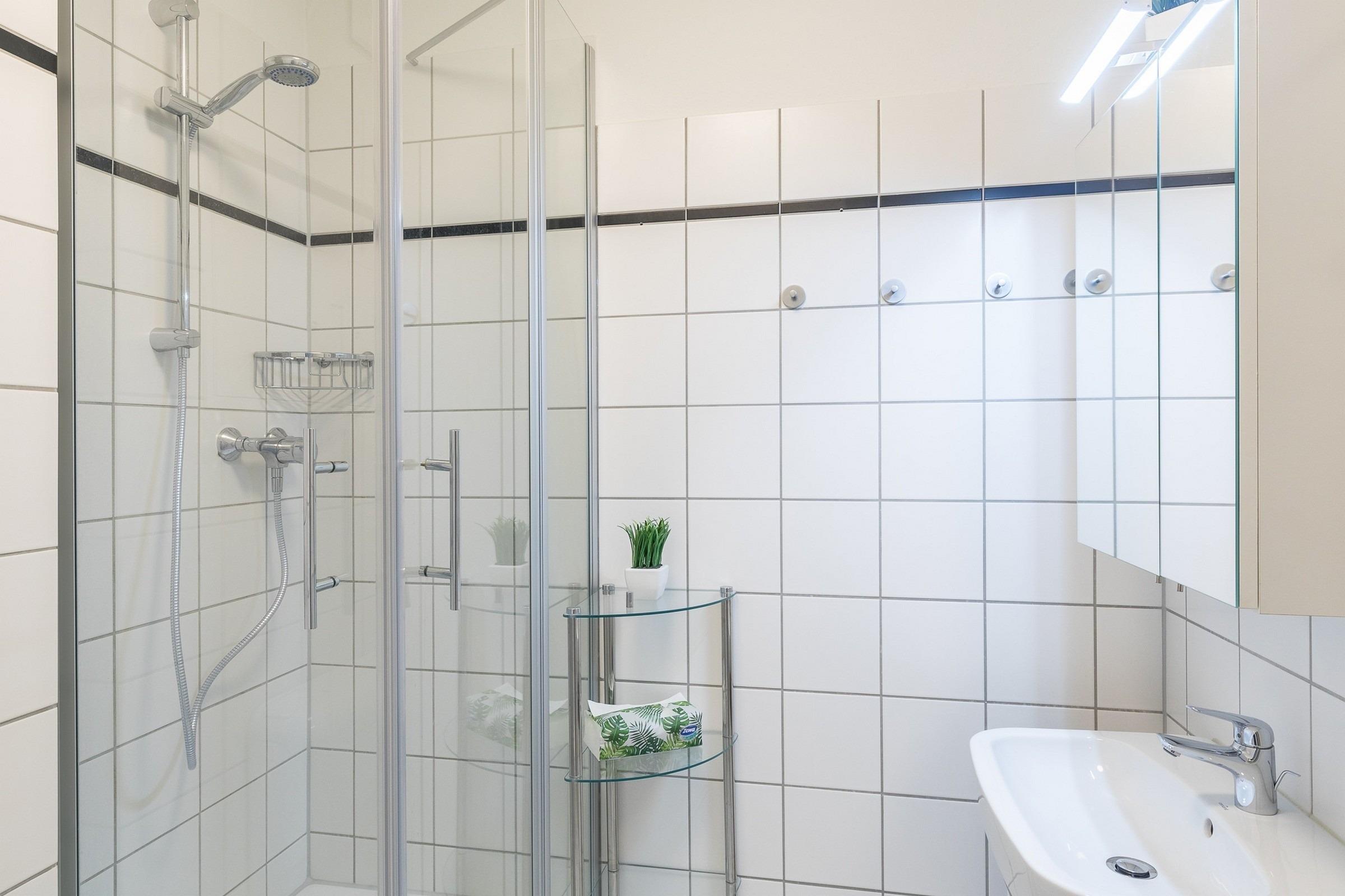 Das Bad ist mit Dusche, Waschbecken und WC ausgestattet.