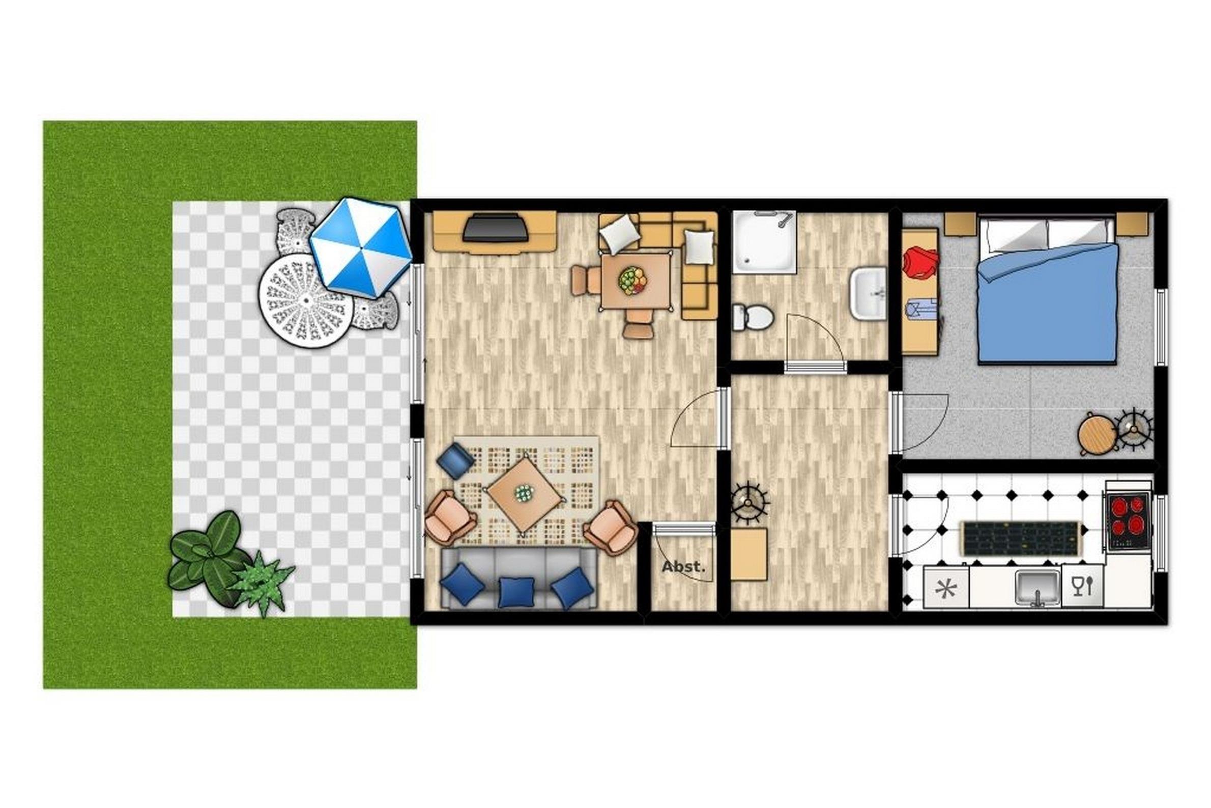 In der 2-Zimmer-Wohnung Erdgeschosswohnung mit Terrasse finden Sie auf etwa 55qm Wohnfläche eine komfortable Ausstattung bis zu 4 Personen.