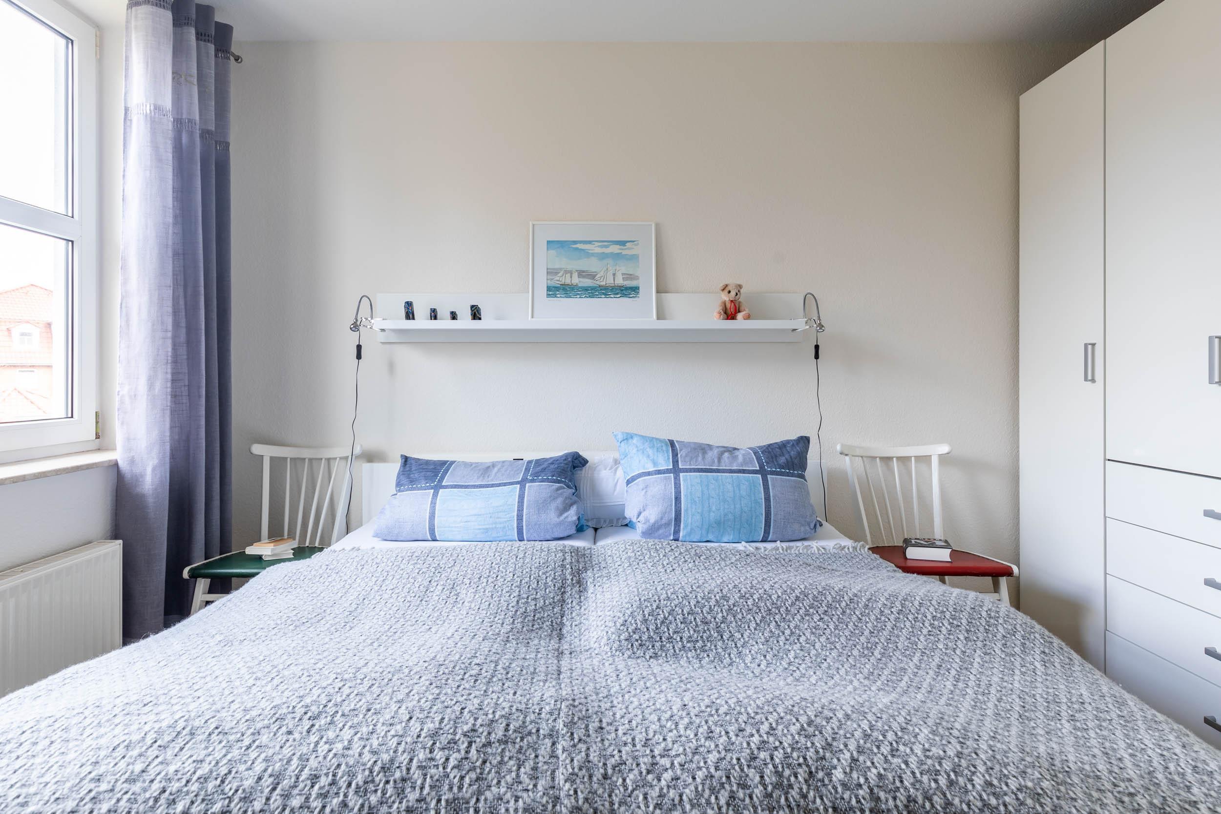 Das Schlafzimmer ist mit einem Doppelbett (180x200cm) ausgestattet. Dort befindet sich auch ein geräumiger Kleiderschrank.