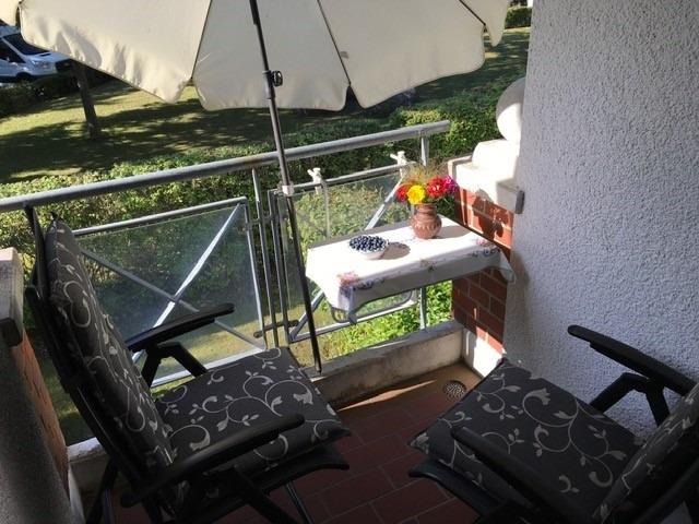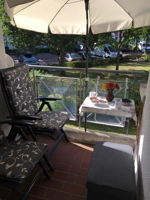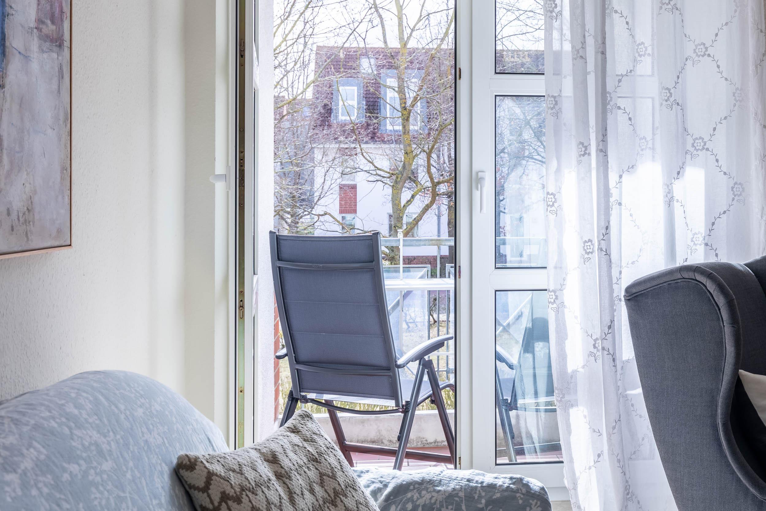 Den möblierten Südbalkon können Sie vom Wohnzimmer aus erreichen.