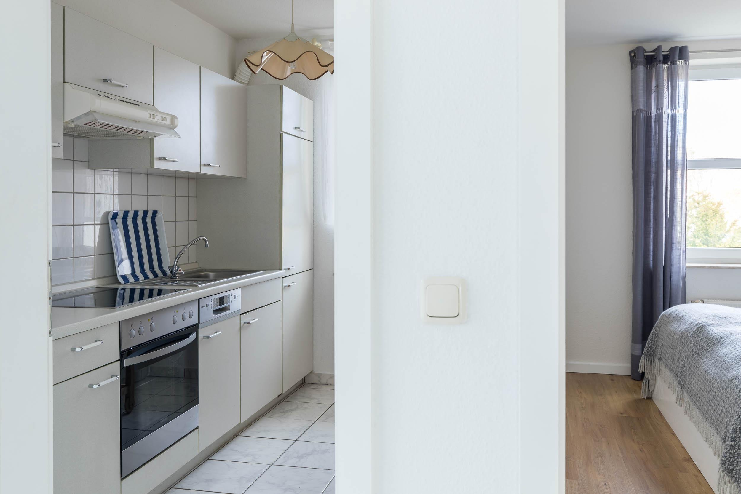 Die Küche ist in dieser Wohnung separat. Hier bieten haushaltsübliche Geräte (Herd mit Backofen, Kaffeemaschine, Wasserkocher, Toaster, Kühlschrank mit Gefrierfach) die Möglichkeit zur Selbstversorgung ohne Einschränkung.