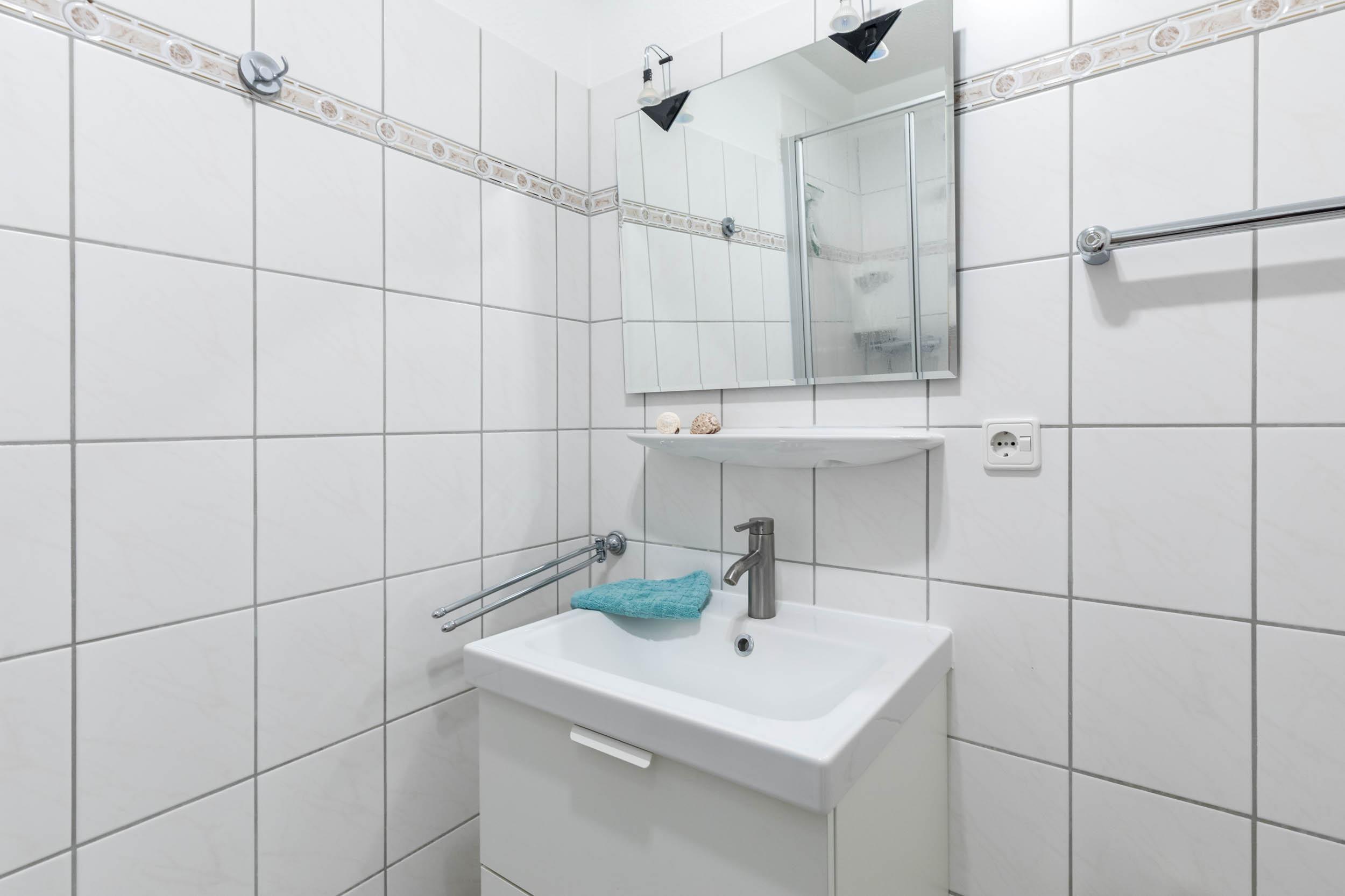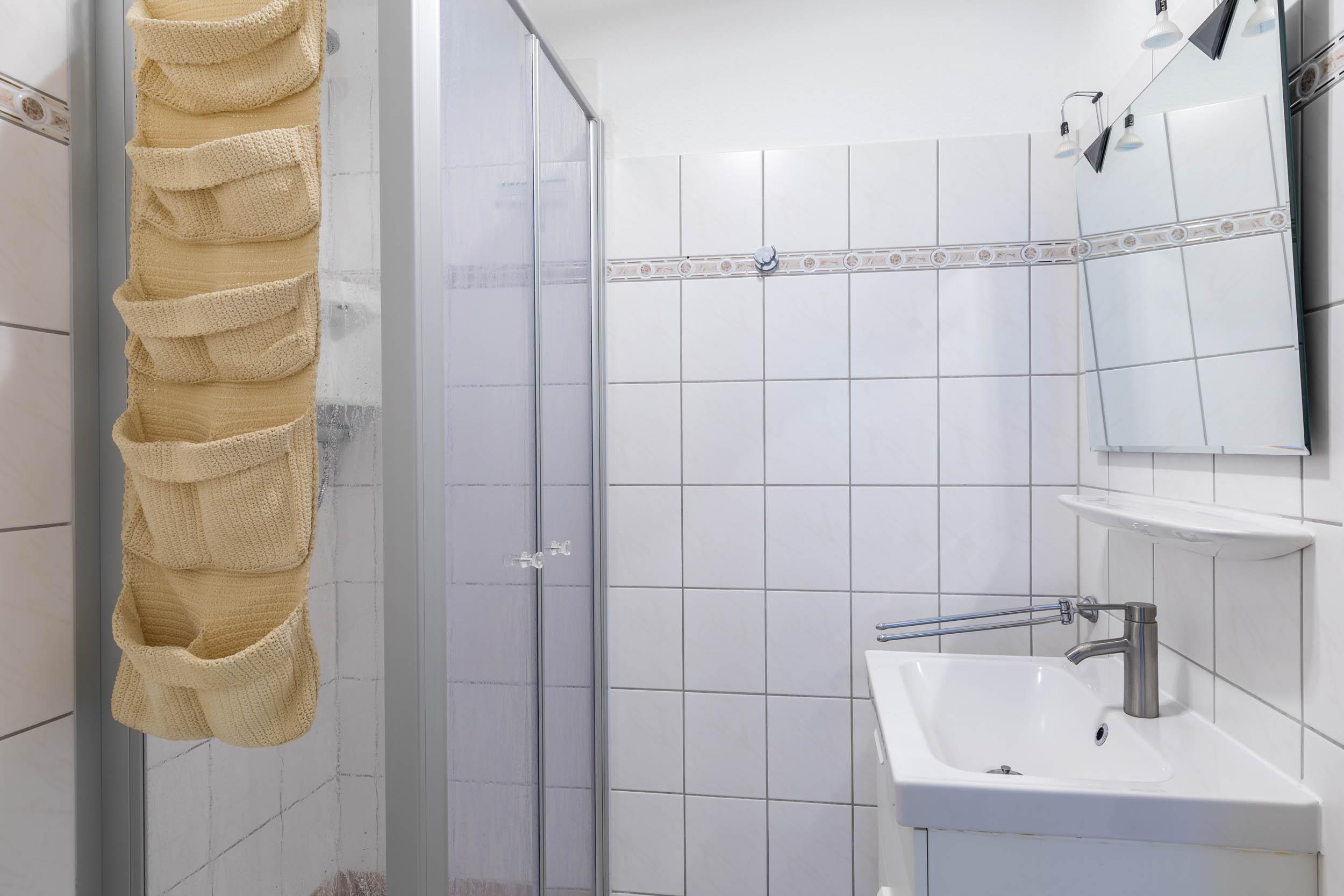 Im hell gefliesten Bad befinden sich eine Dusche, Waschbecken und WC.