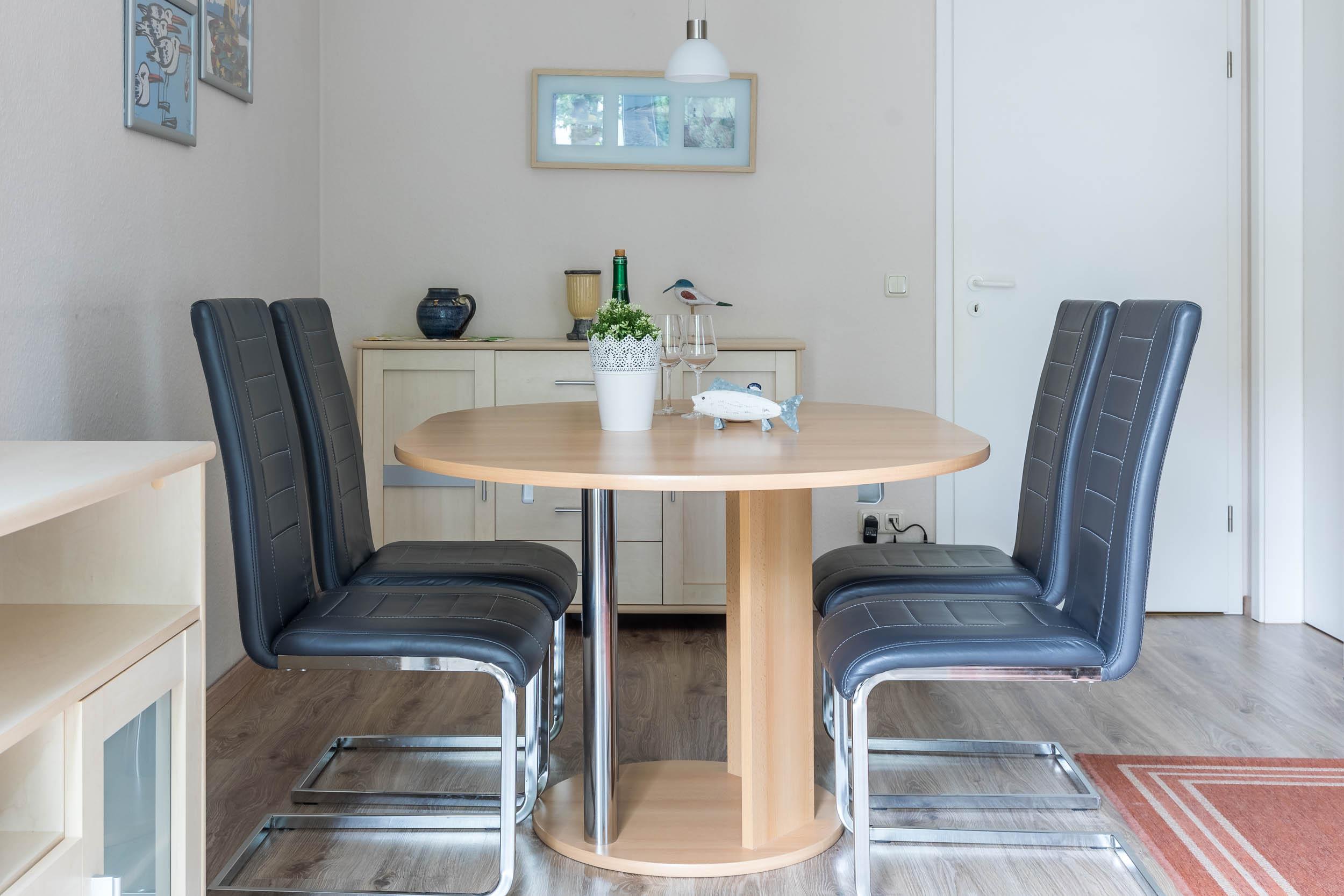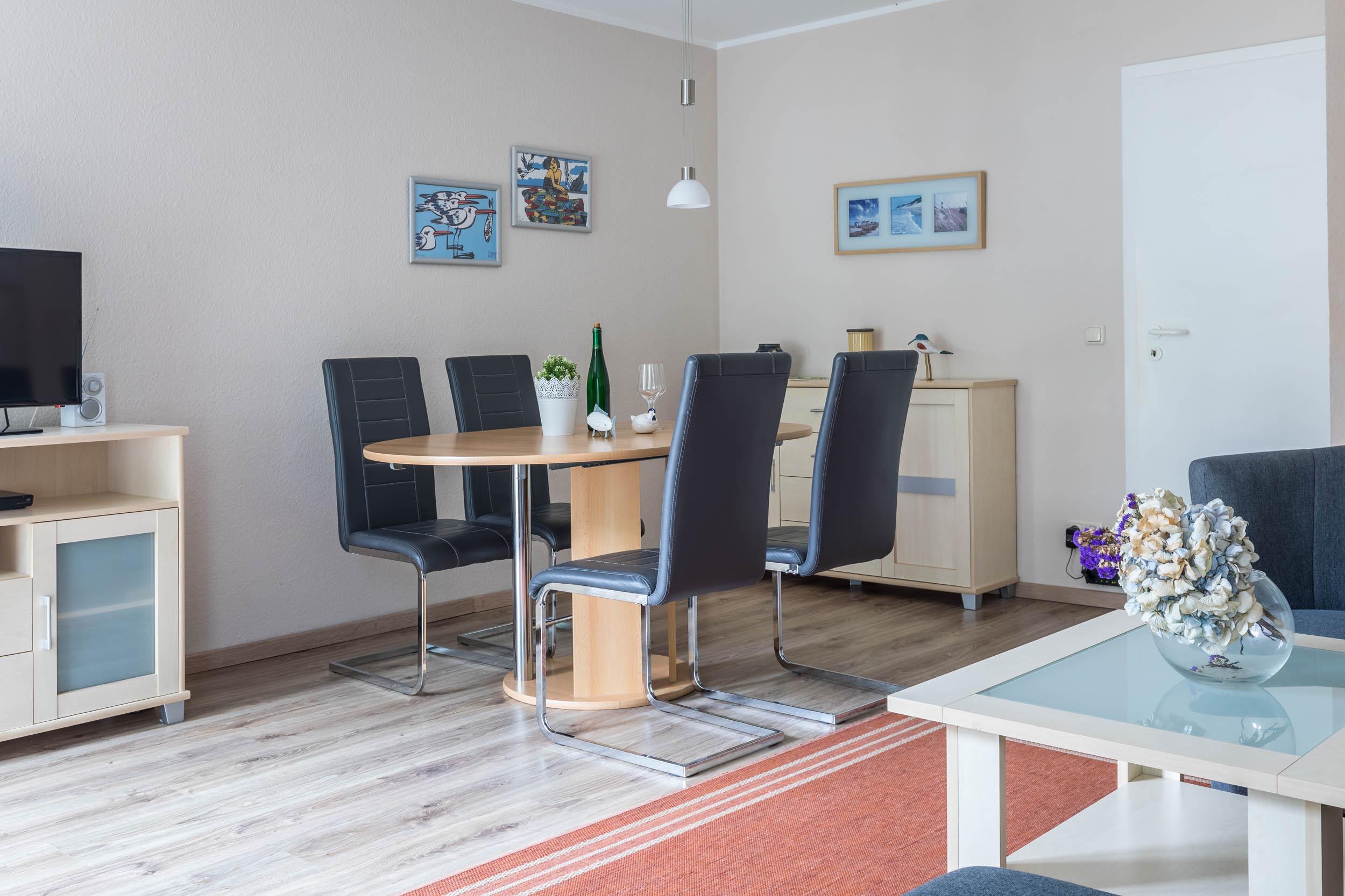 Das Wohnzimmer ist mit einem Ecksofa sowie einem passenden Sessel eingerichtet. Ein TV sorgt hier für gute Multimediaunterhaltung. Das Sofa kann bei Bedarf als 3. Schlafmöglichkeit ausgezogen werden. Die angrenzende Essecke bietet einen gemütlichen Platz zum gemeinsamen Speisen für alle Gäste.