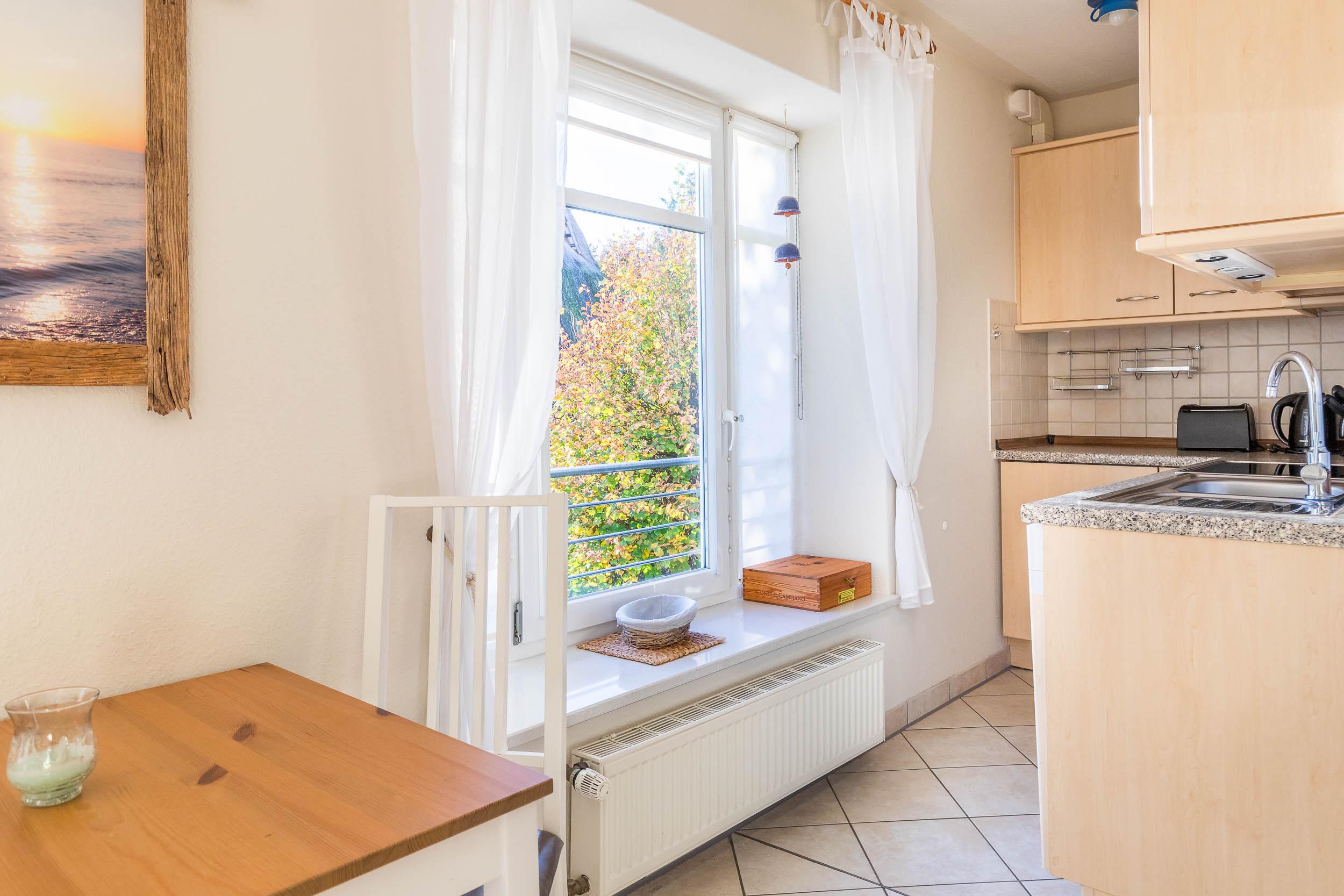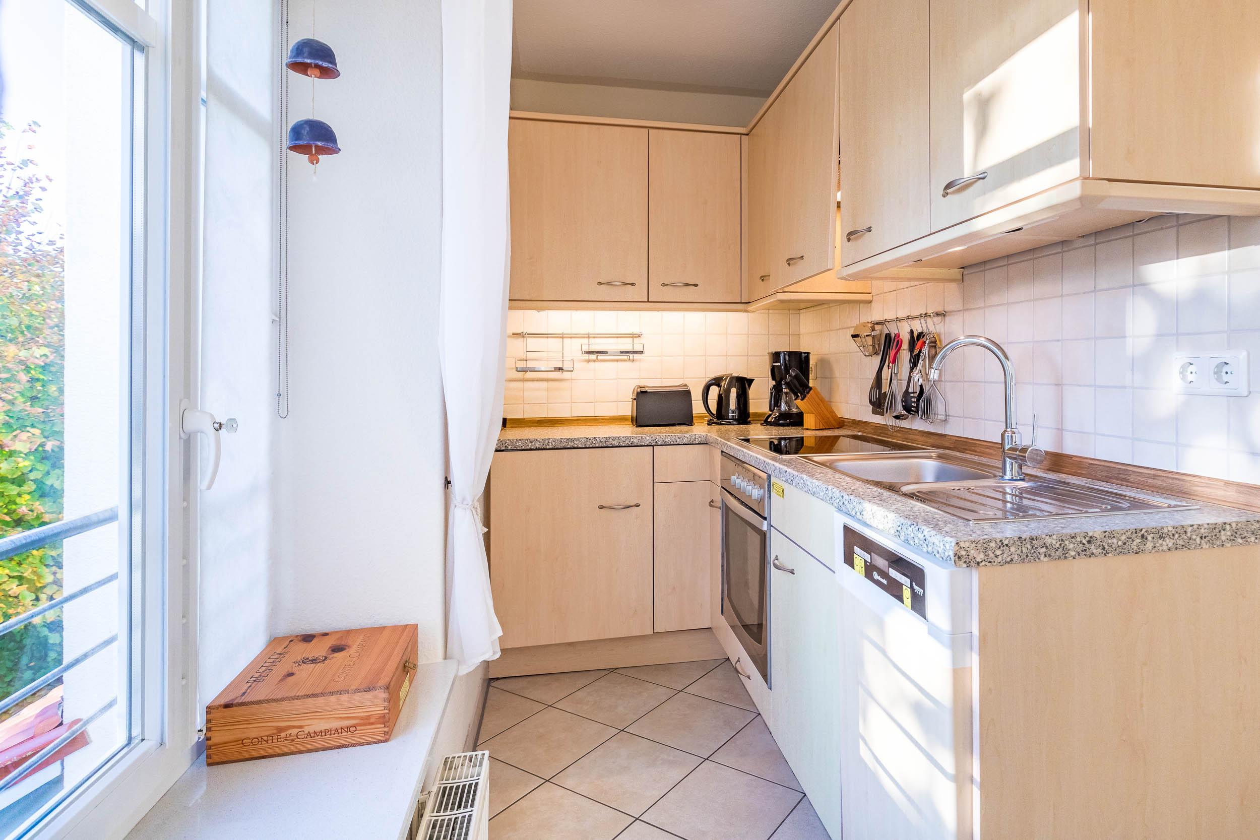 In der modernen Wohnküche finden Sie u.a. einen Herd mit Cerankochfeld, einen Backofen sowie einen Kühlschrank mit Gefrierfach vor. Auch eine kleine Essecke befindet sich hier.