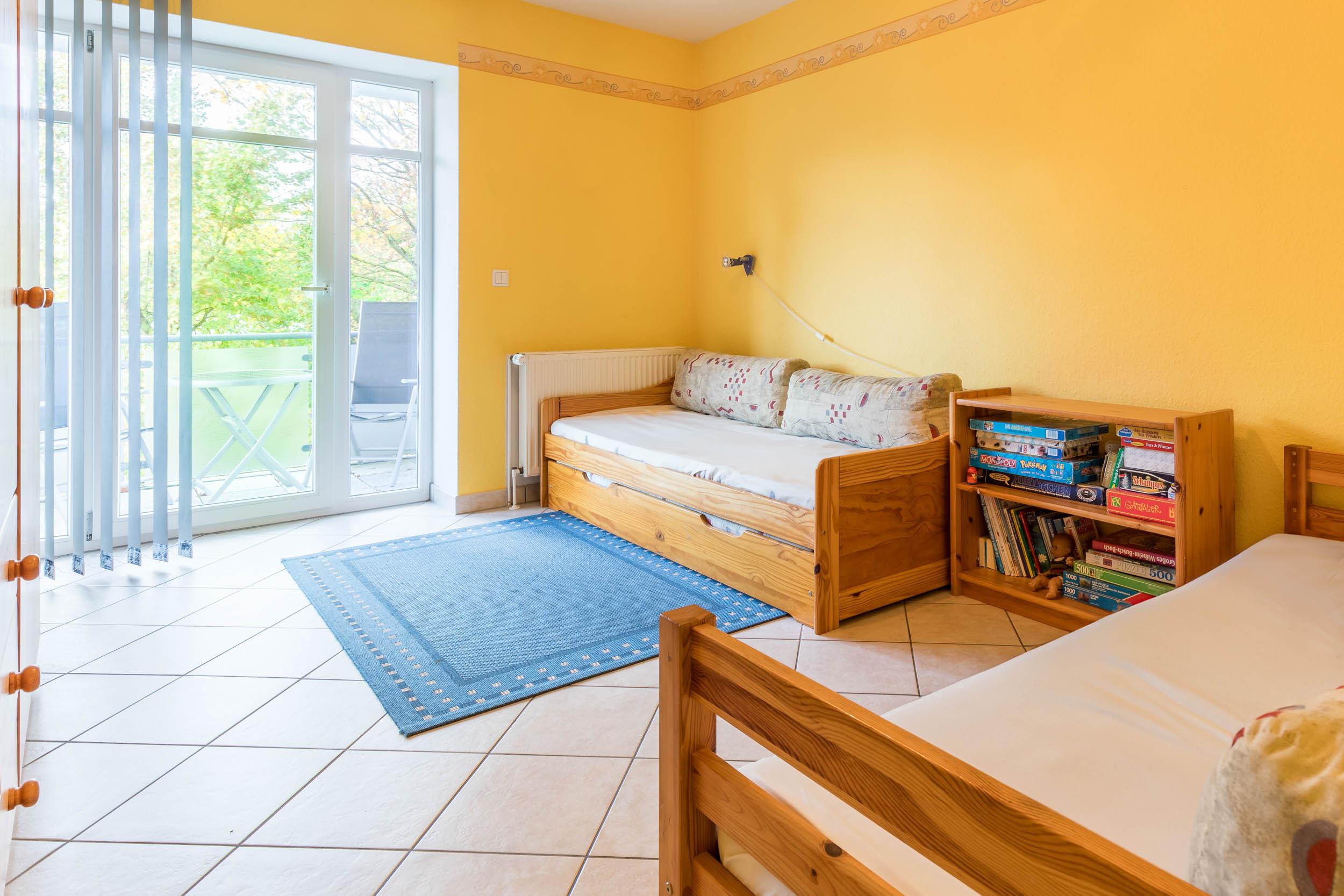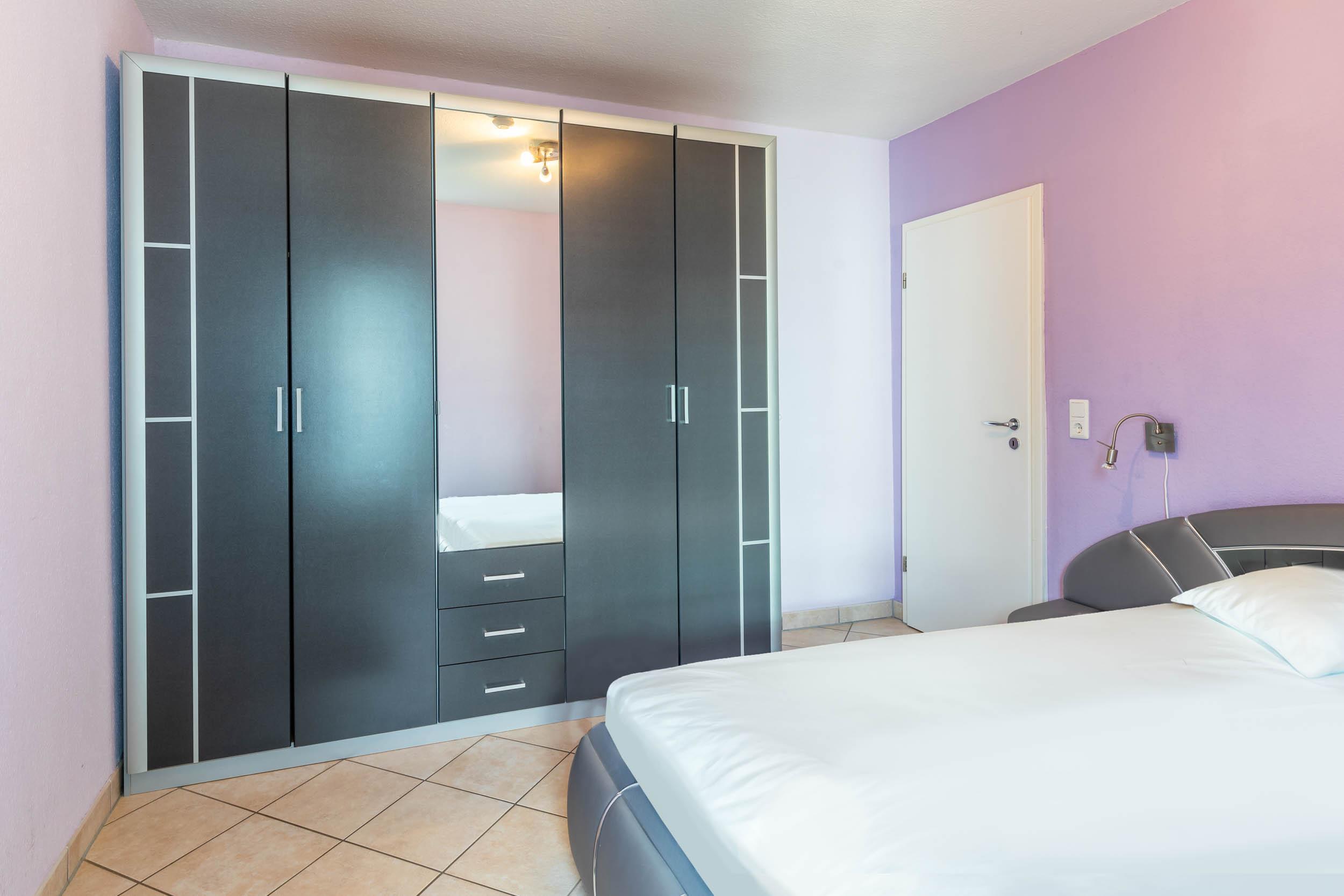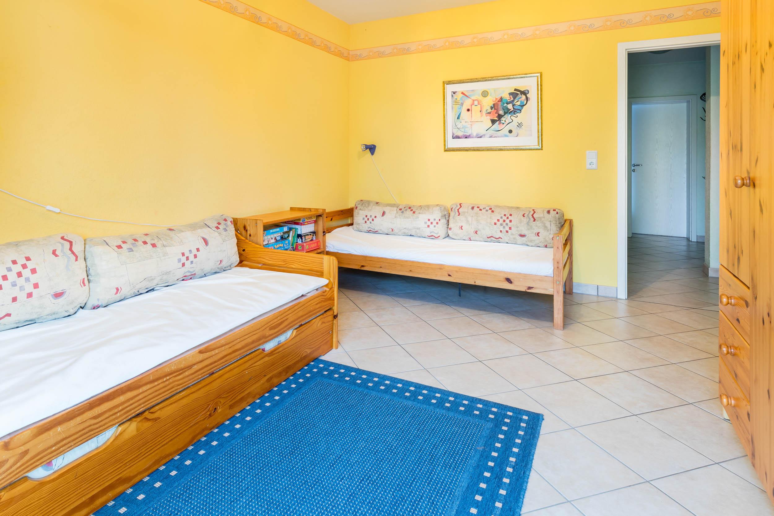 Über einen Flur gelangen Sie in die beiden separaten Schlafzimmer. Ein Doppelbett in dem einen Schlafzimmer sowie zwei Einzelbetten und ein ausziehbares Bett im Gäste-/ Kinderzimmer ermöglichen geruhsame Nächte. In beiden Zimmern finden Sie zudem jeweils einen großen Kleiderschrank für Ihre Urlaubsgarderobe.