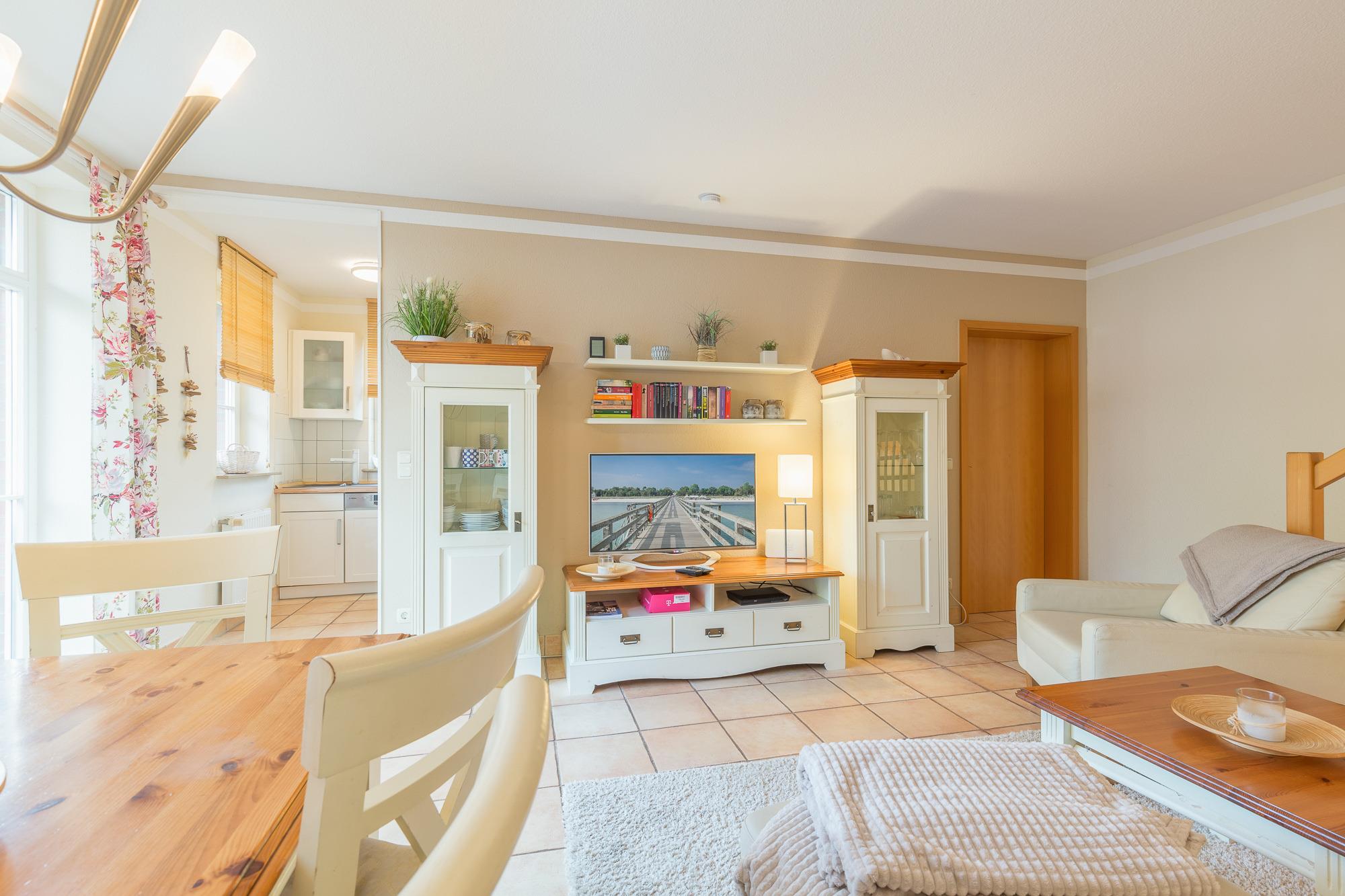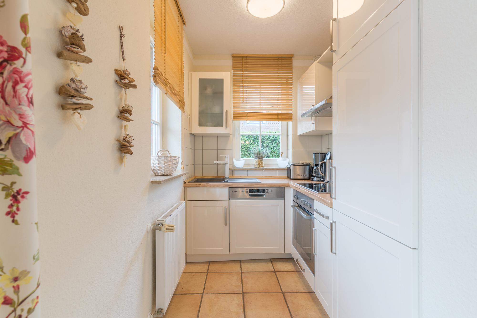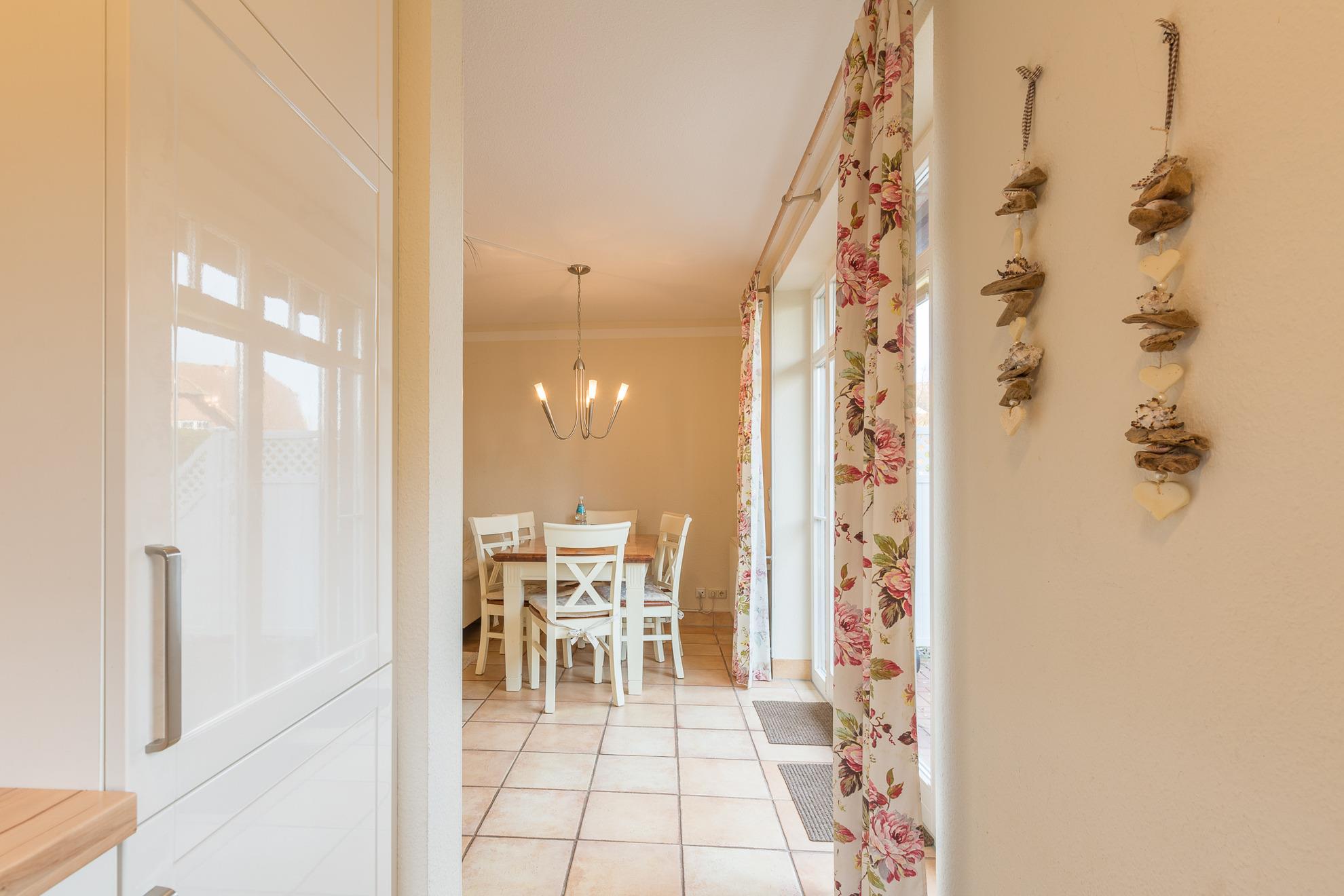 Sie betreten das Ferienhaus und befinden sich im Flur. Von hier aus erreichen Sie das Wohnzimmer. Vom Wohnbereich aus gelangen Sie in die offene Küche. Sie ist mit einem Geschirrspüler, einer Kaffeemaschine und allem, was für die Zubereitung Ihrer Mahlzeiten benötigen, ausgestattet.