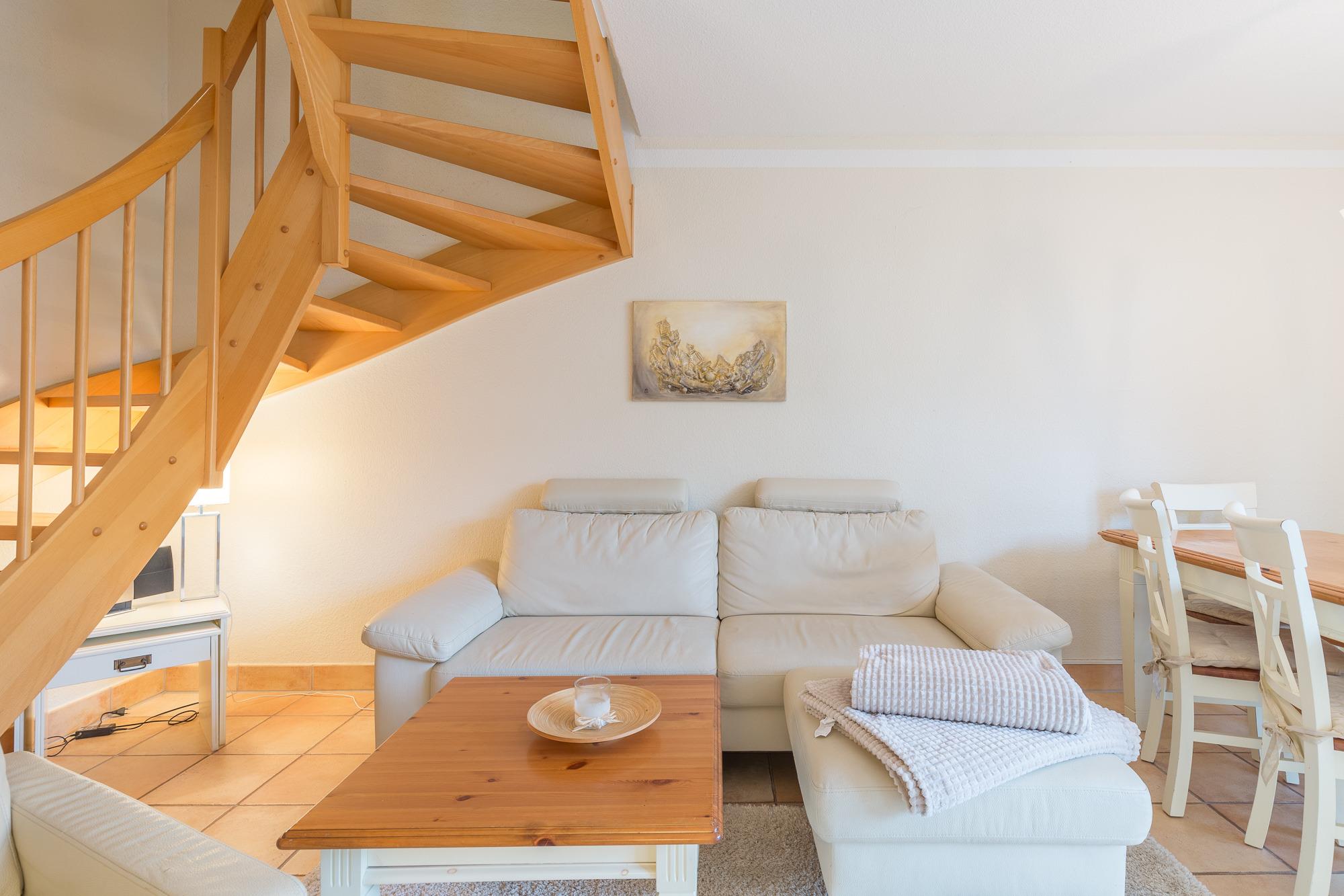 Vom Wohnzimmer aus gelangen Sie auf die begrünte, kleine Terrasse. Die vorhandene Hecke bietet Sichtschutz und Privatsphäre für das Familienfrühstück auf der Terrasse. Auf der andern Seite befindet sich der Außenstellplatz. Ein schöner Strandkorb auf der Terrasse rundet das Angebot ab.