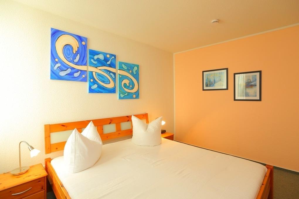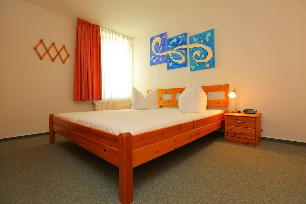 Im Schlafzimmer ist ein komfortables Doppelbett und ein passender großer Kleiderschrank für Ihre Garderobe eingerichtet.