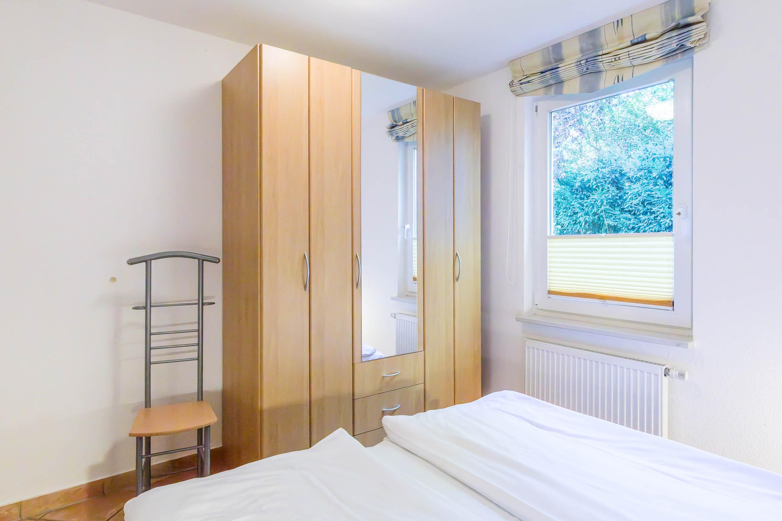 Im Schlafzimmer sorgt ein modernes Doppelbett (180x200cm/ Höhe 44,5cm) für einen erholsamen Schlaf. Das Rollo dunkelt hervorragend ab. Im Kleiderschrank können Sie gern Ihre Urlaubsgarderobe ablegen.