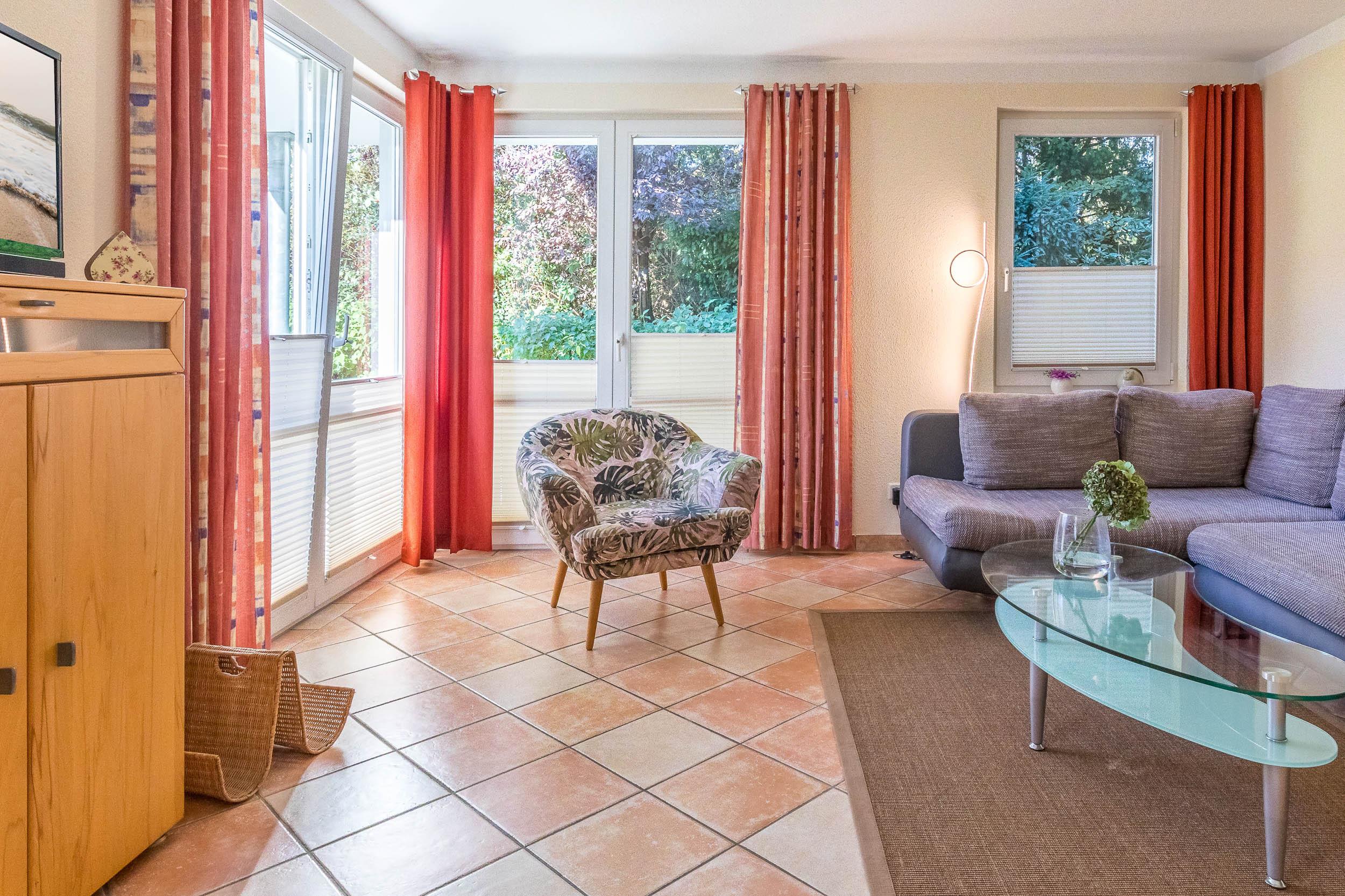 Sie verfügt über einen großzügig geschnittenen Wohnbereich mit gemütlicher Sofalandschaft und einem direkten Zugang auf die möblierte, etwas sichtgeschützte Nordwest/ Nordost-Eckterrasse. Es besteht die Möglichkeit, auf der ausziehbaren Schlafcouch im Wohnzimmer eine Person unterzubringen. SAT-TV, DVD-Player, Musikanlage sowie diverse Gesellschaftsspiele sorgen hier für Ihre Unterhaltung.