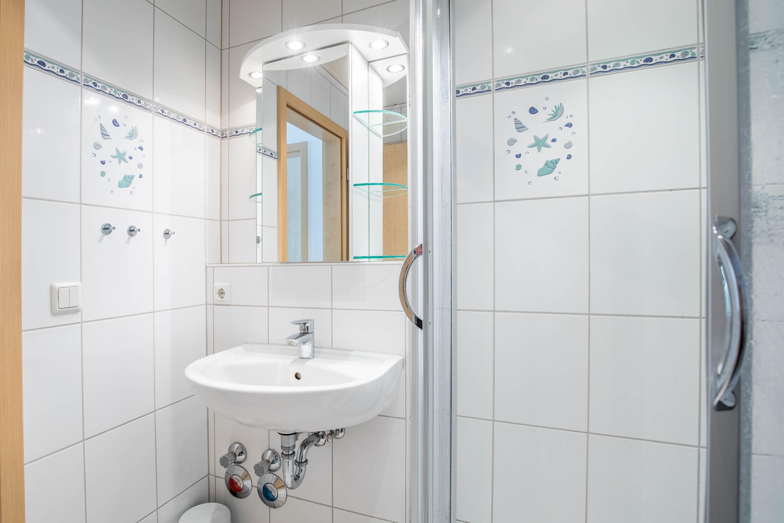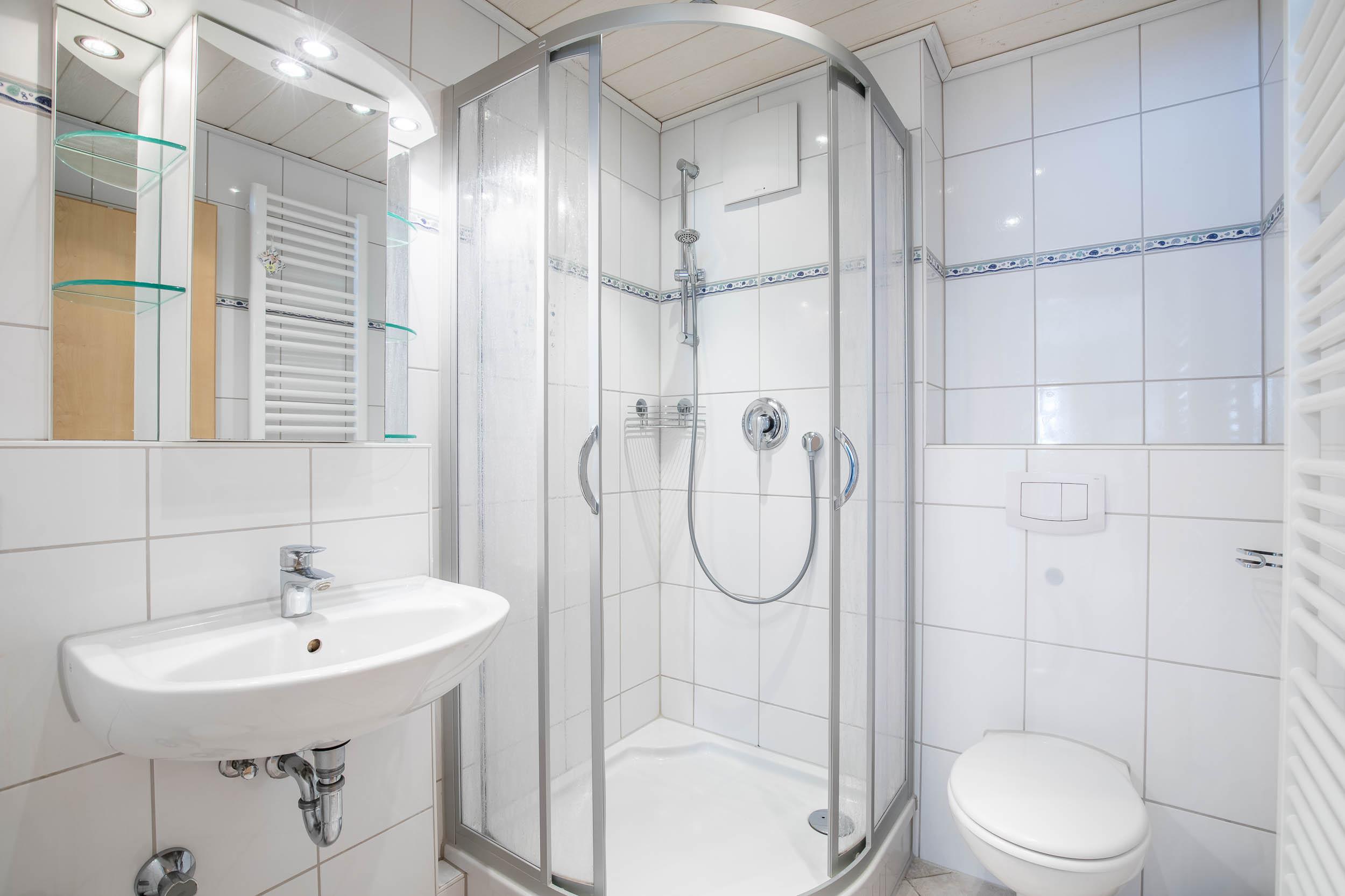 Ein modernes Duschbad mit WC und Fußbodenheizung komplettieren das einladende Zuhause auf Zeit. Die Handtuchheizung sorgt hier auf Wunsch für mollig warme Frotteewäsche.