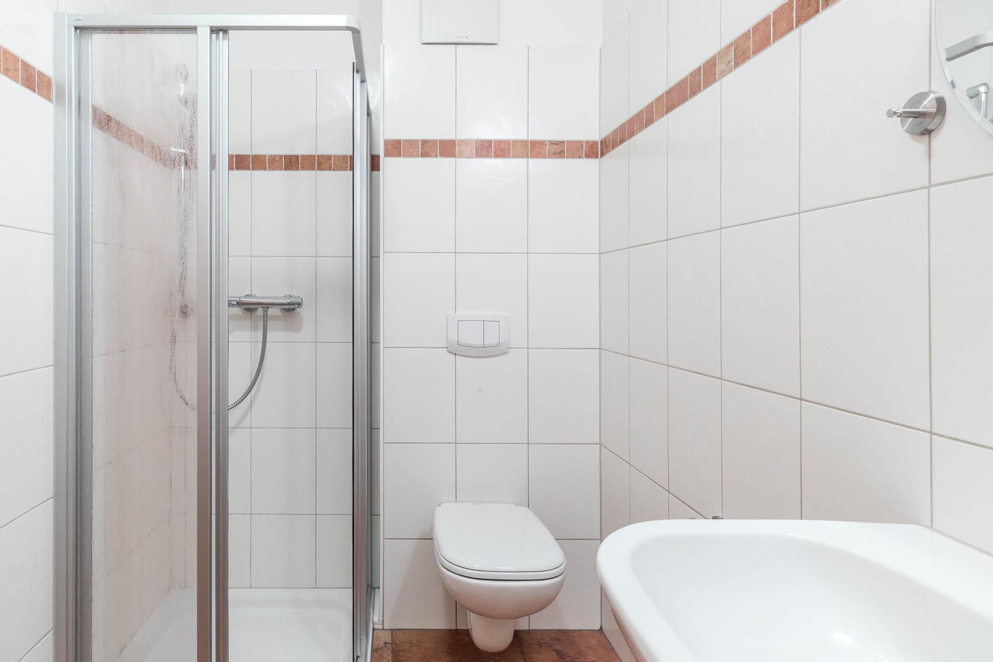 Im Badezimmer gibt es Dusche, Waschbecken und WC. Hier befindet sich auch eine Waschmaschine.