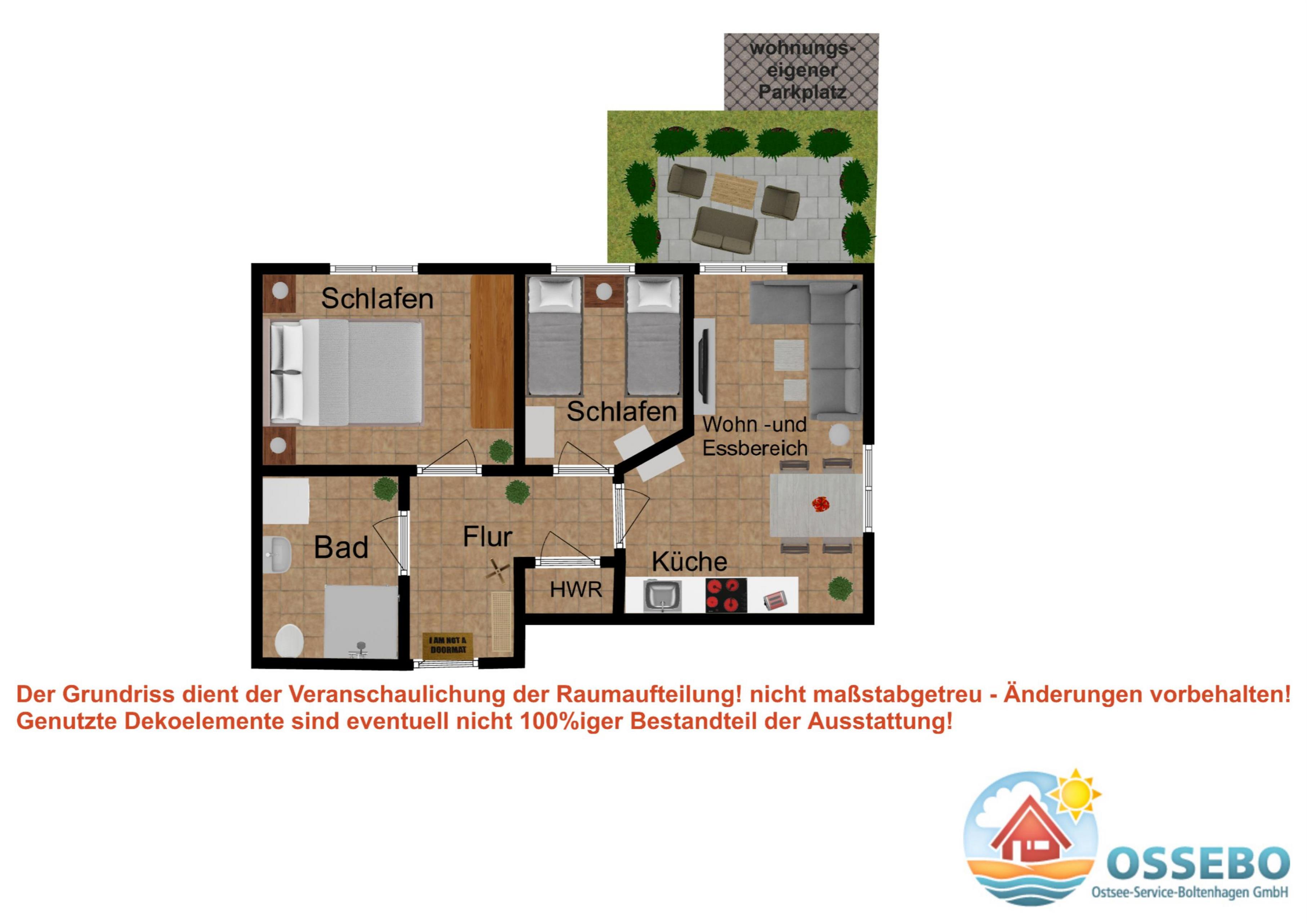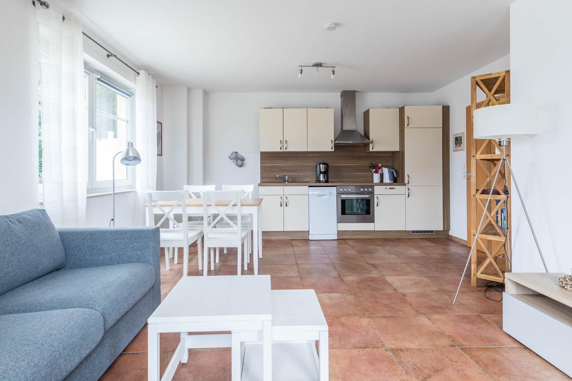 Die moderne 3-Zimmer-Wohnung im Erdgeschoss bietet mit einer Größe von etwa 60 m² eine Ausstattung für 4 Personen + Kleinkind.