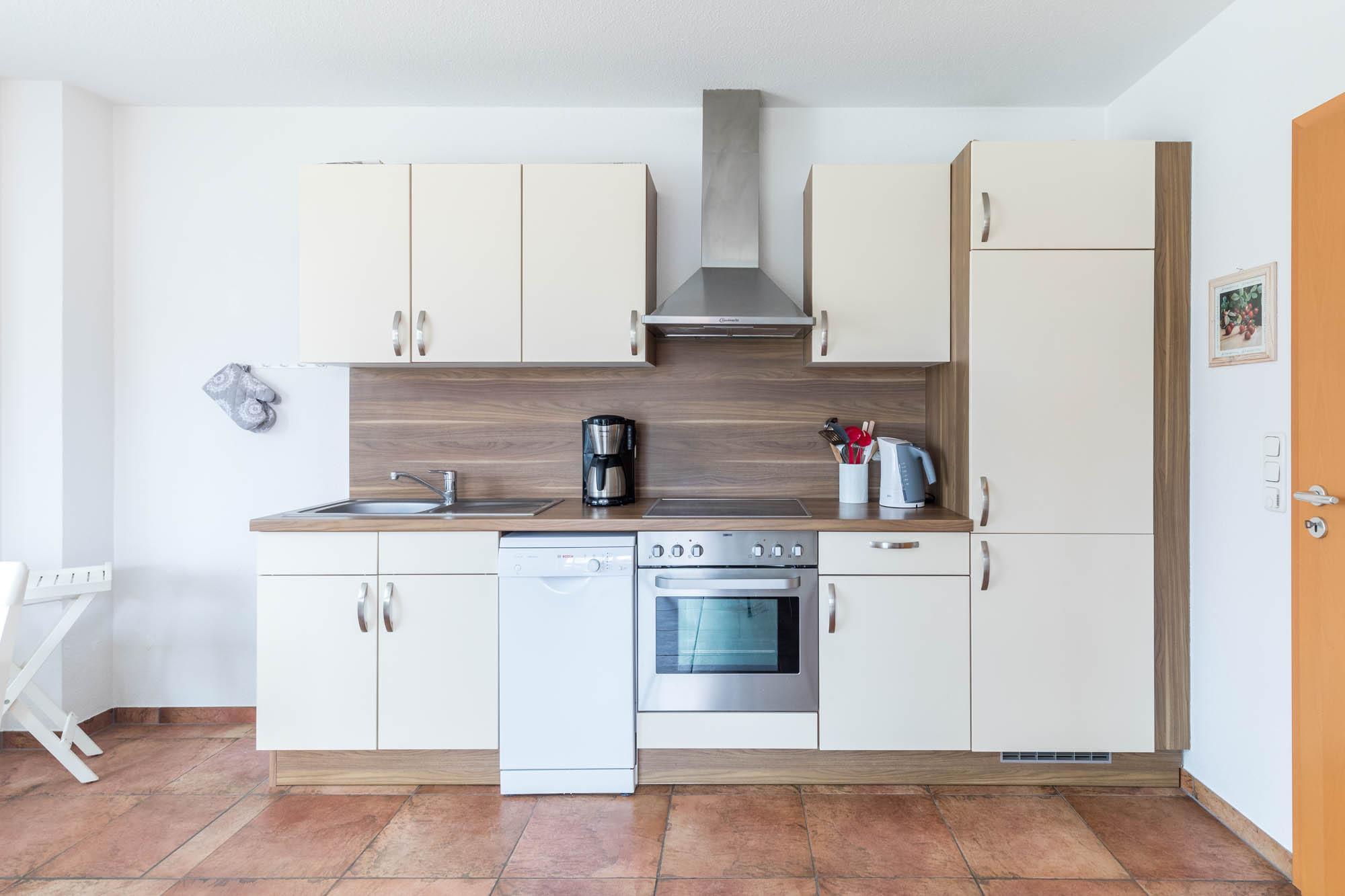 In der offenen Wohnküche finden Sie einen Backofen, ein Cerankochfeld, einen Geschirrspüler, einen Kühlschrank, einen Wasserkocher sowie eine Kaffeemaschine.