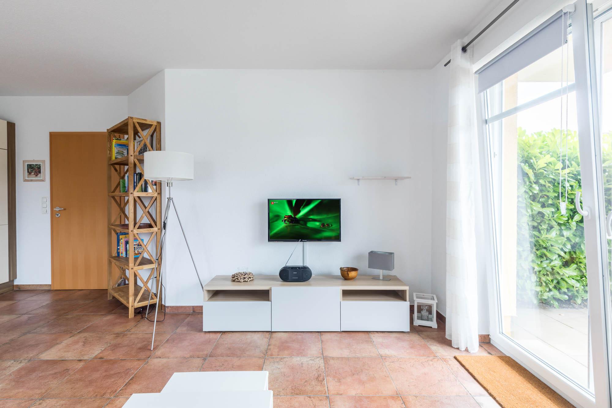 Lassen Sie sich herzlich empfangen vom offenen Wohn- und Essbereich mit gemütlicher Essecke und einer komfortabel gestalteten Sofaecke mit Flatscreen-TV. Der direkte Terrassenzugang aus dem Wohnbereich ist ein weiteres Plus dieser schönen Wohnung.