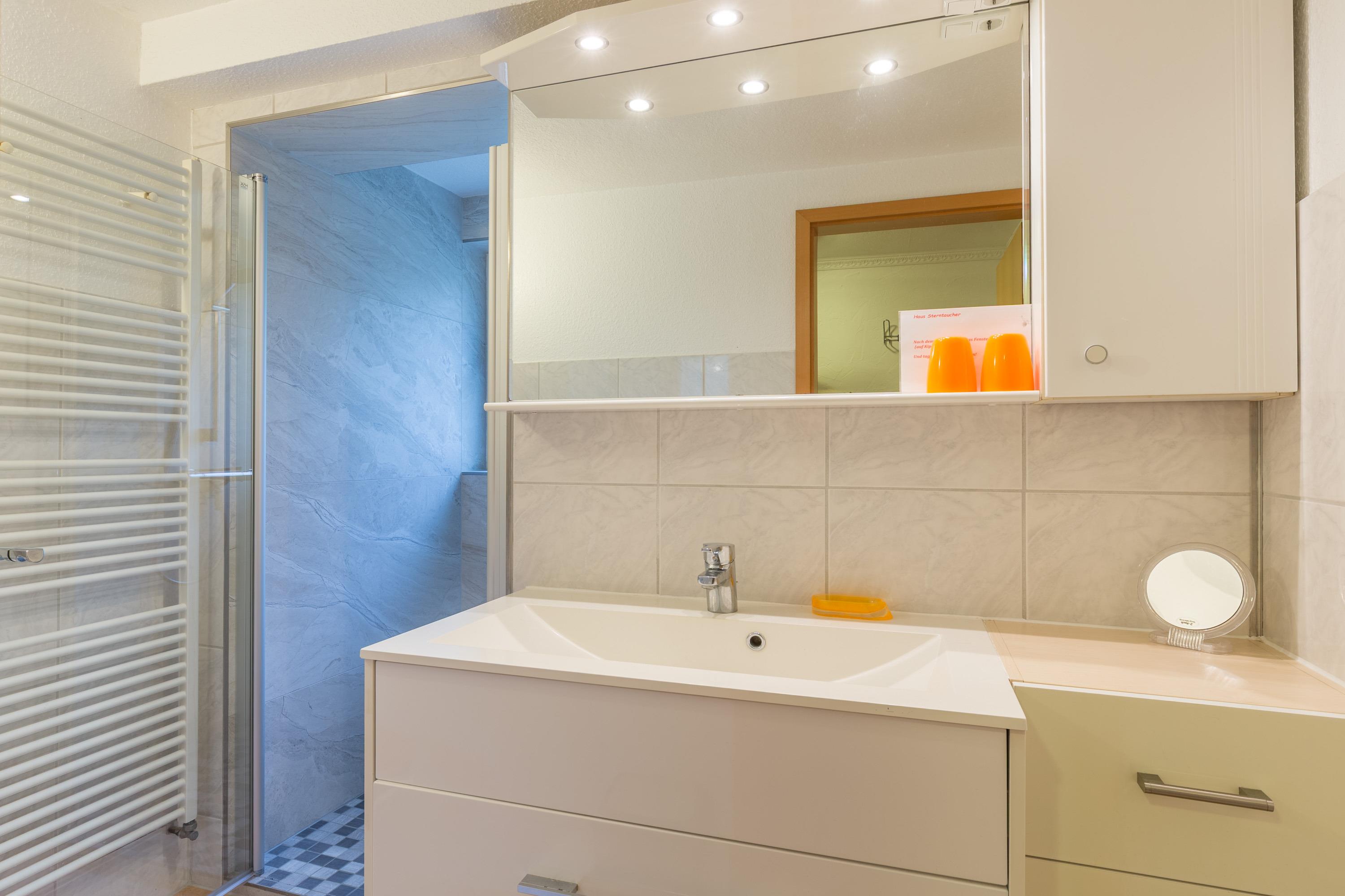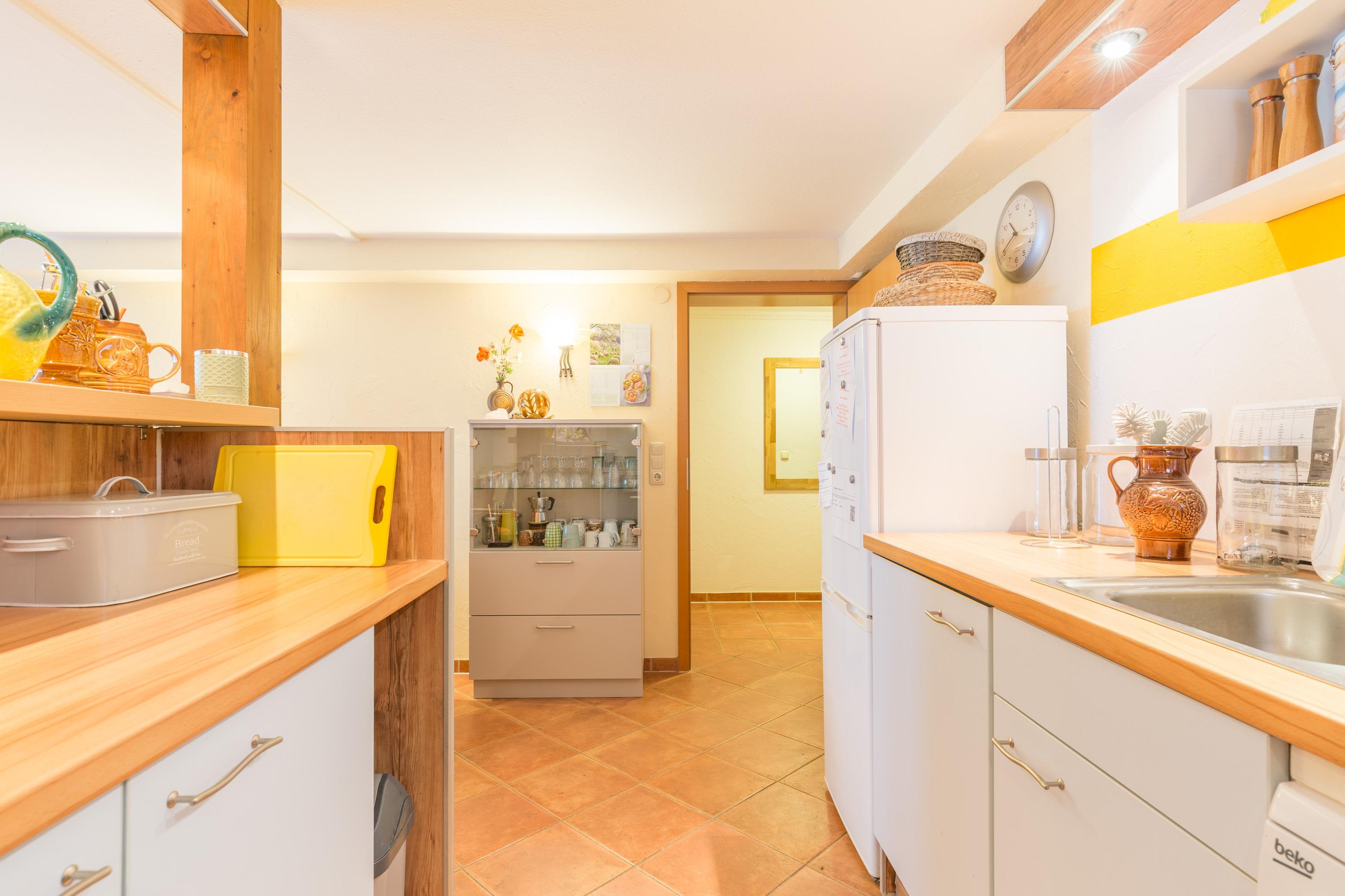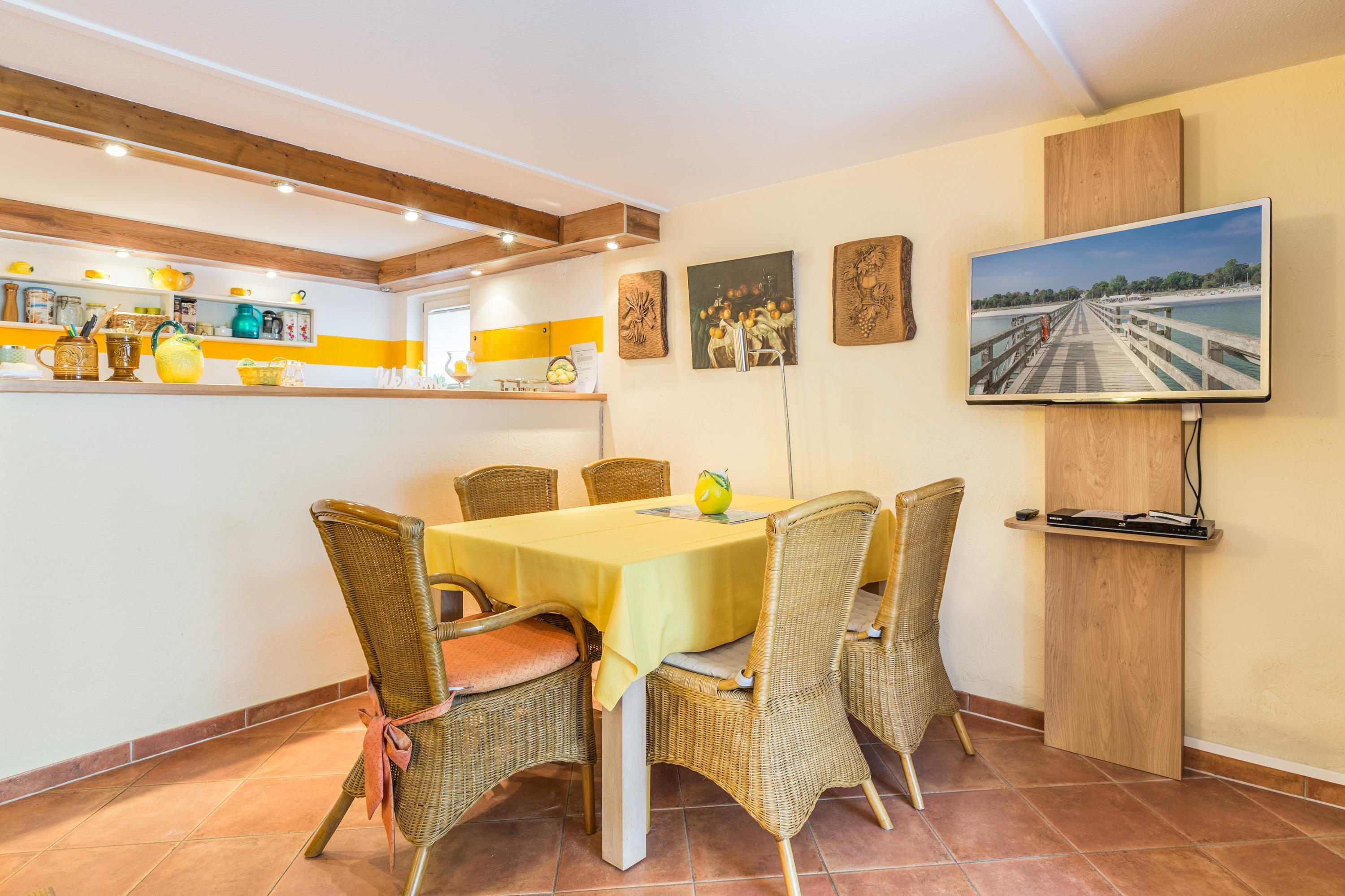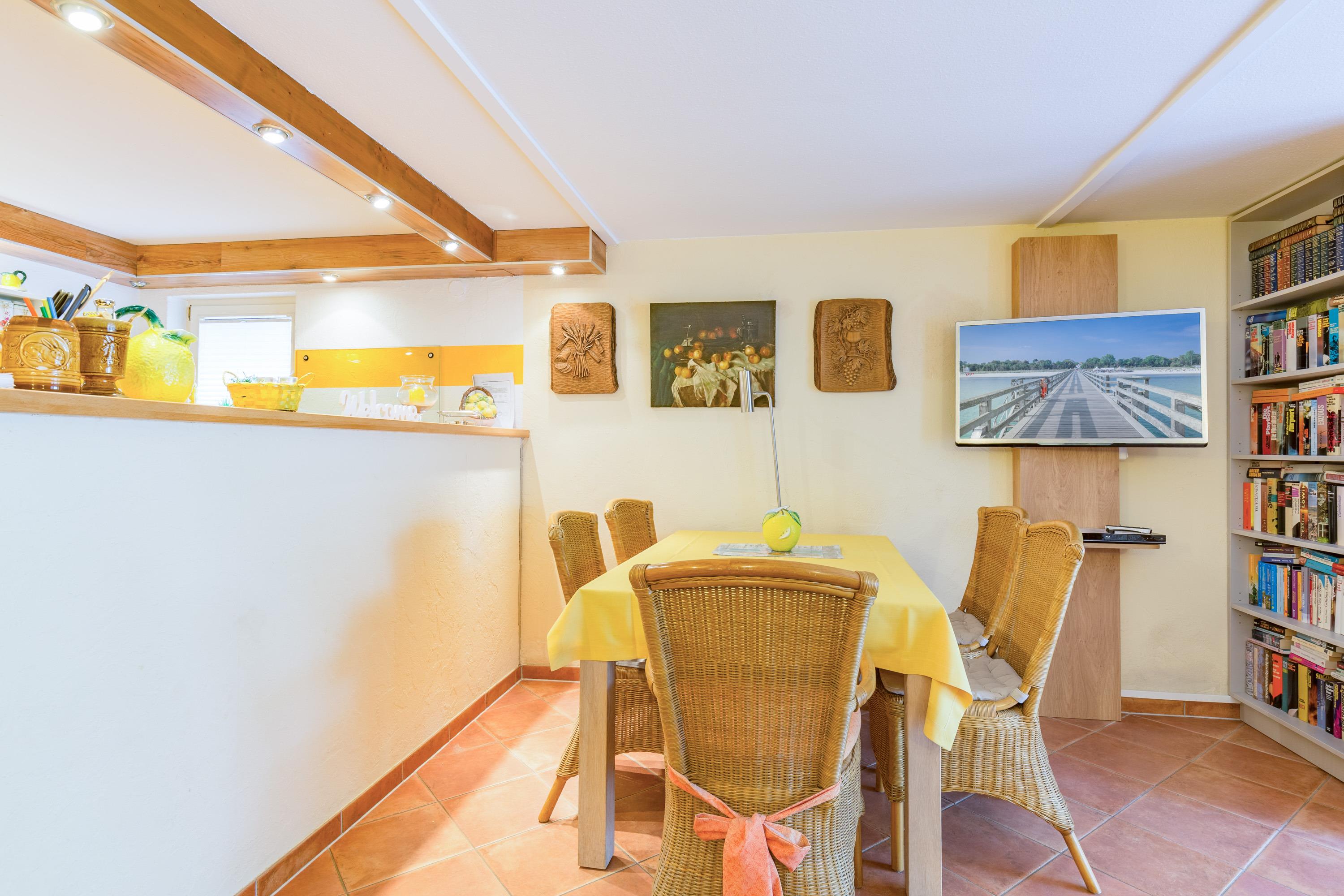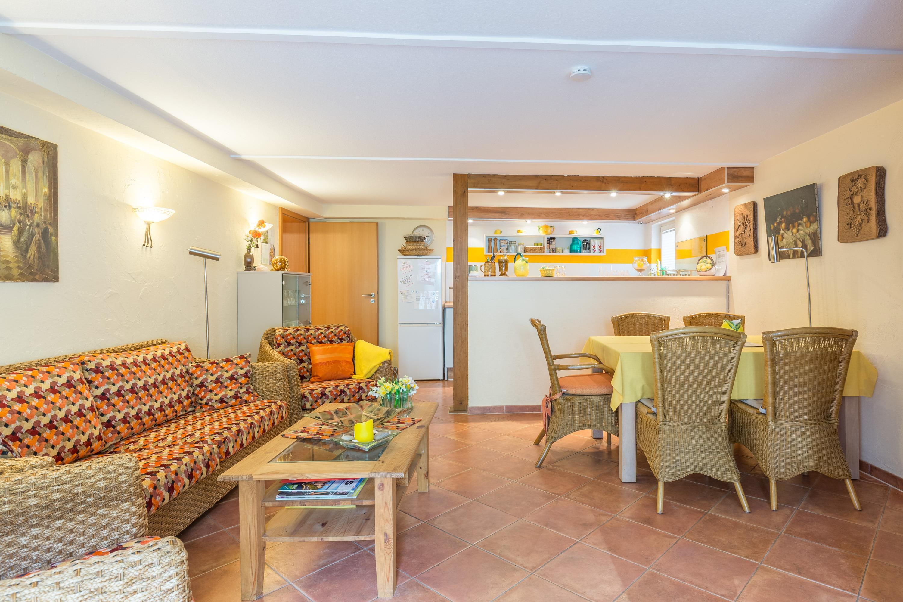 Die Ferienwohnung im Haus Sterntaucher bietet Platz im Erdgeschoss /Untergeschoss mit ein paar flachen Stufen absteigend für maximal 4 Personen. Ein großzügiger Wohn-Essbereich mit integrierter Küche lädt zum Wohlfühlen ein.